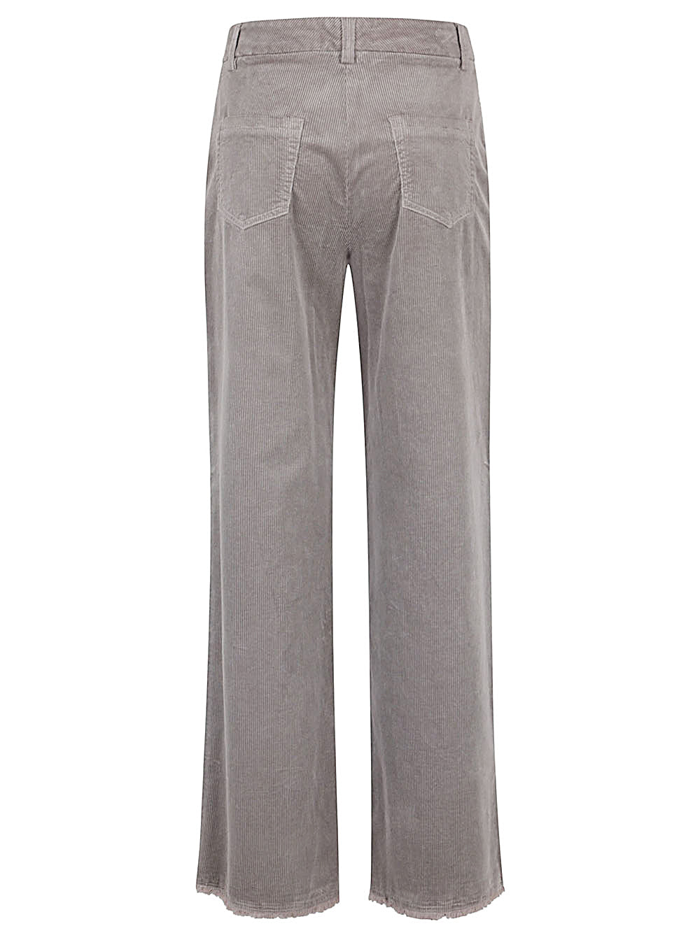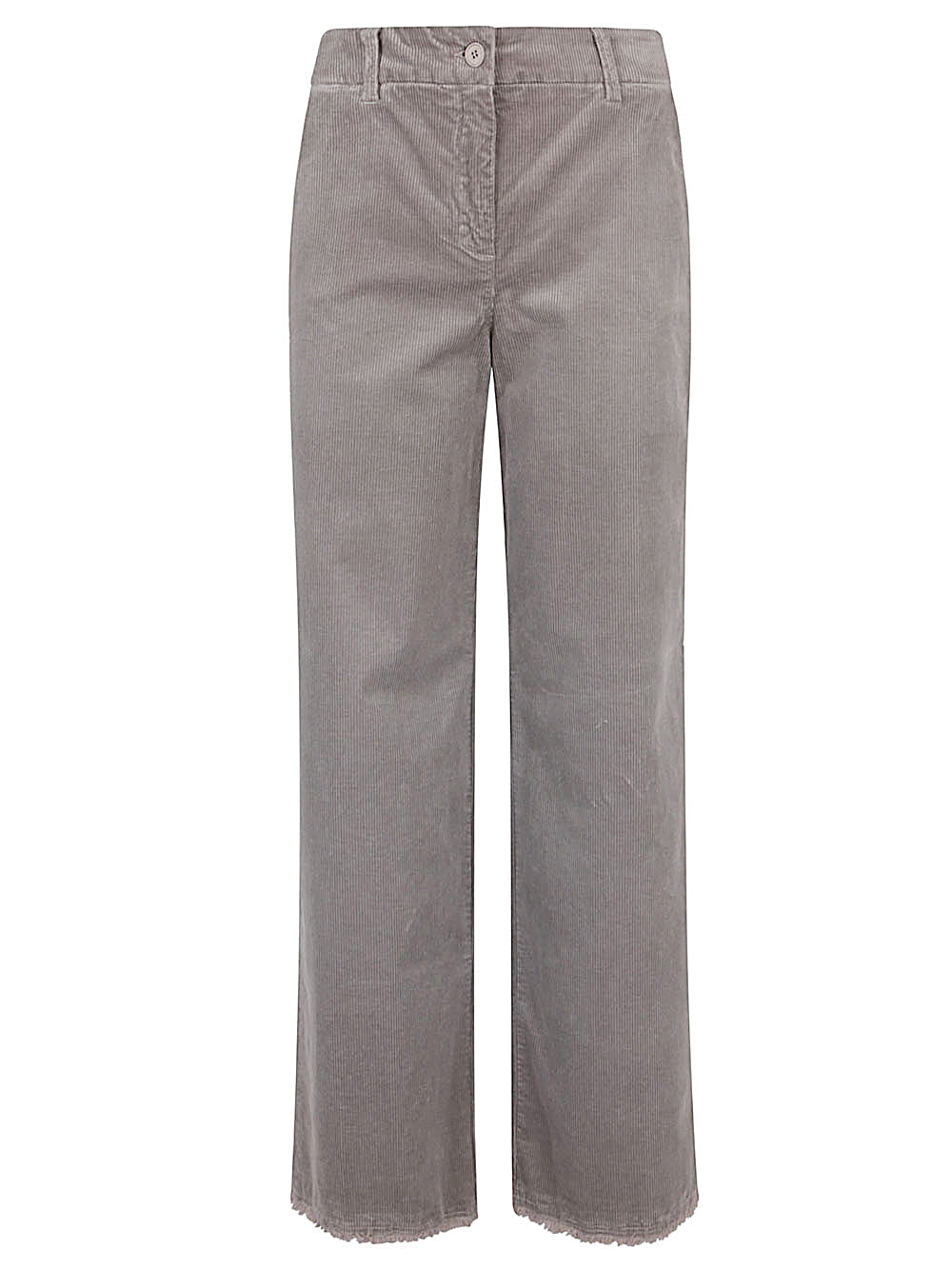 Dove grey, solid colour, velvet, belt loops, front hidden zip and button closure, two side welt pockets, two patch pockets on the back, wide leg, fringed hem.