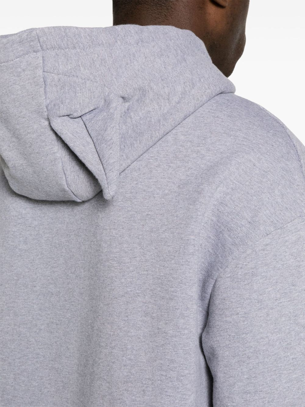 Heathergraue Baumwolltrikot -Textur mÉlange Effekt Pop-up-Tier Ohren Logo Patch zum vorderen Kordelkordelhaube Drop Schulter lange Ärmel Rippen-Manschetten vordere Beutel Tasche Tasche Saum Französisch Terry Futter