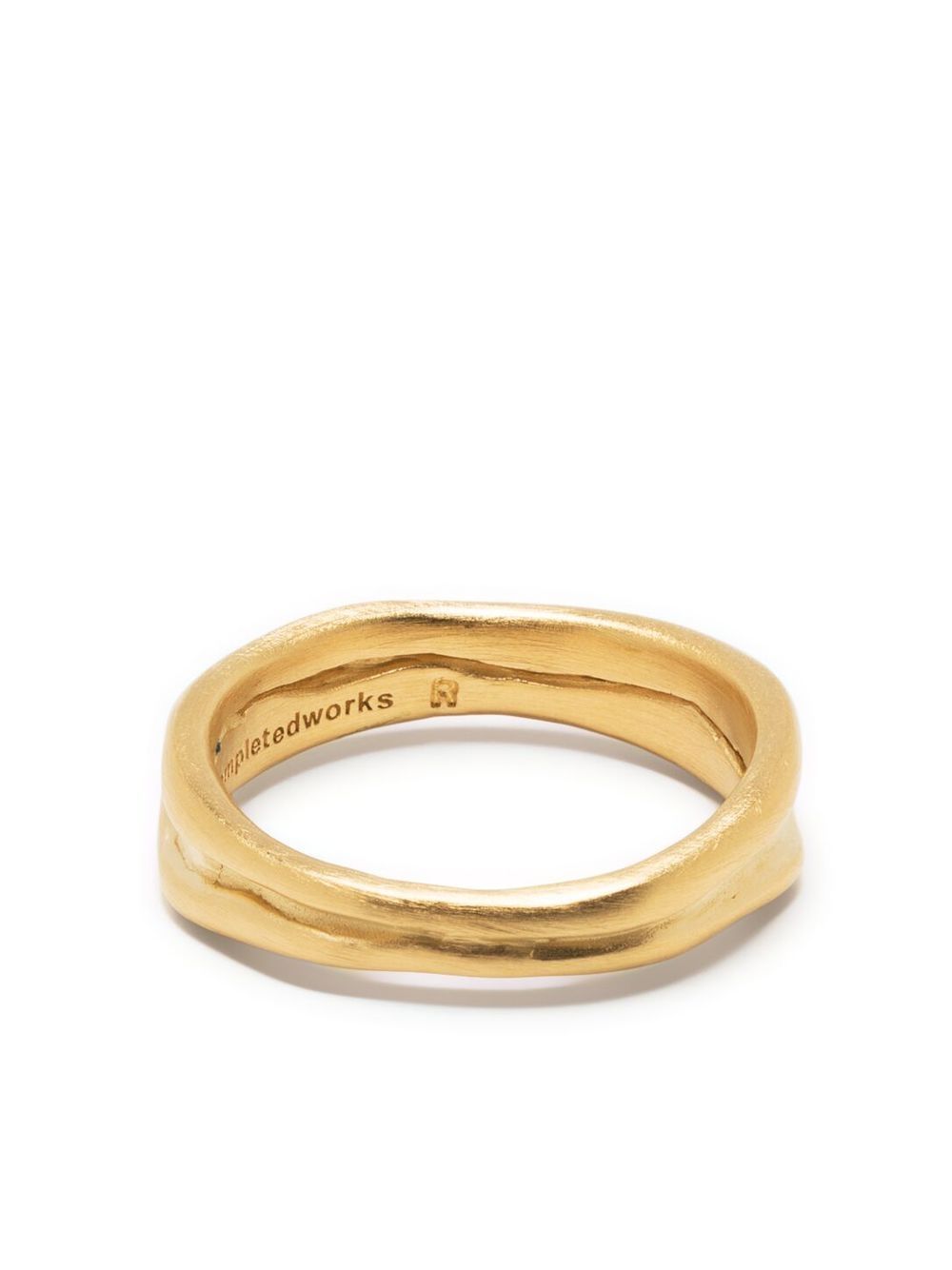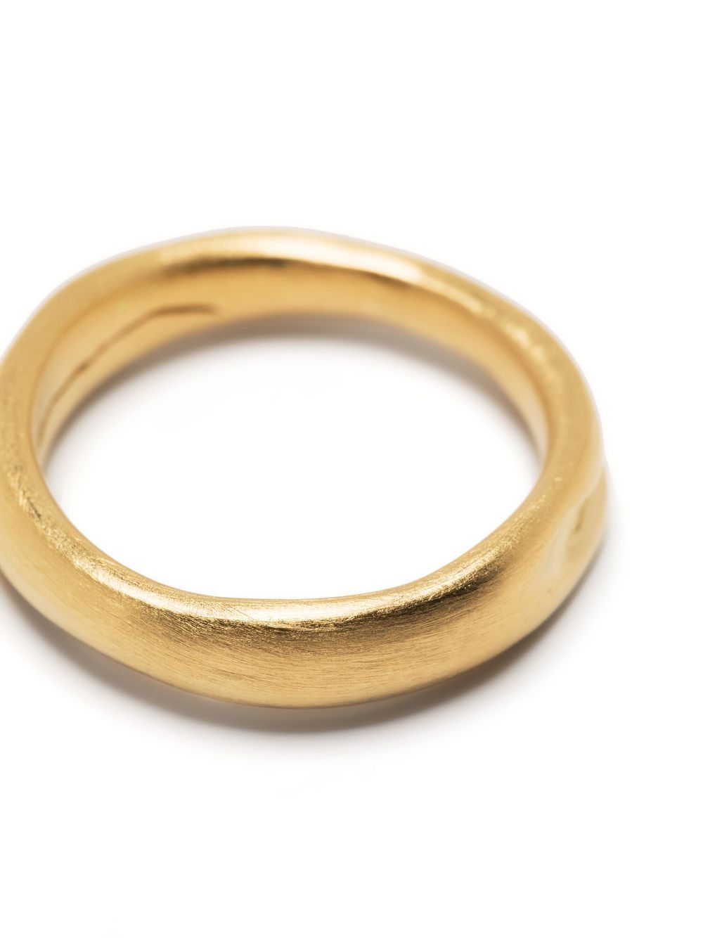 Deflatter ("nicht aufblasen") Ring aus abgeschlossenen Arbeiten mit Goldton, handgefertigter Effekt, graviertem Logo, Slip-on-Stil, recyceltes Sterlingsilber und 14KT-Goldplatt.