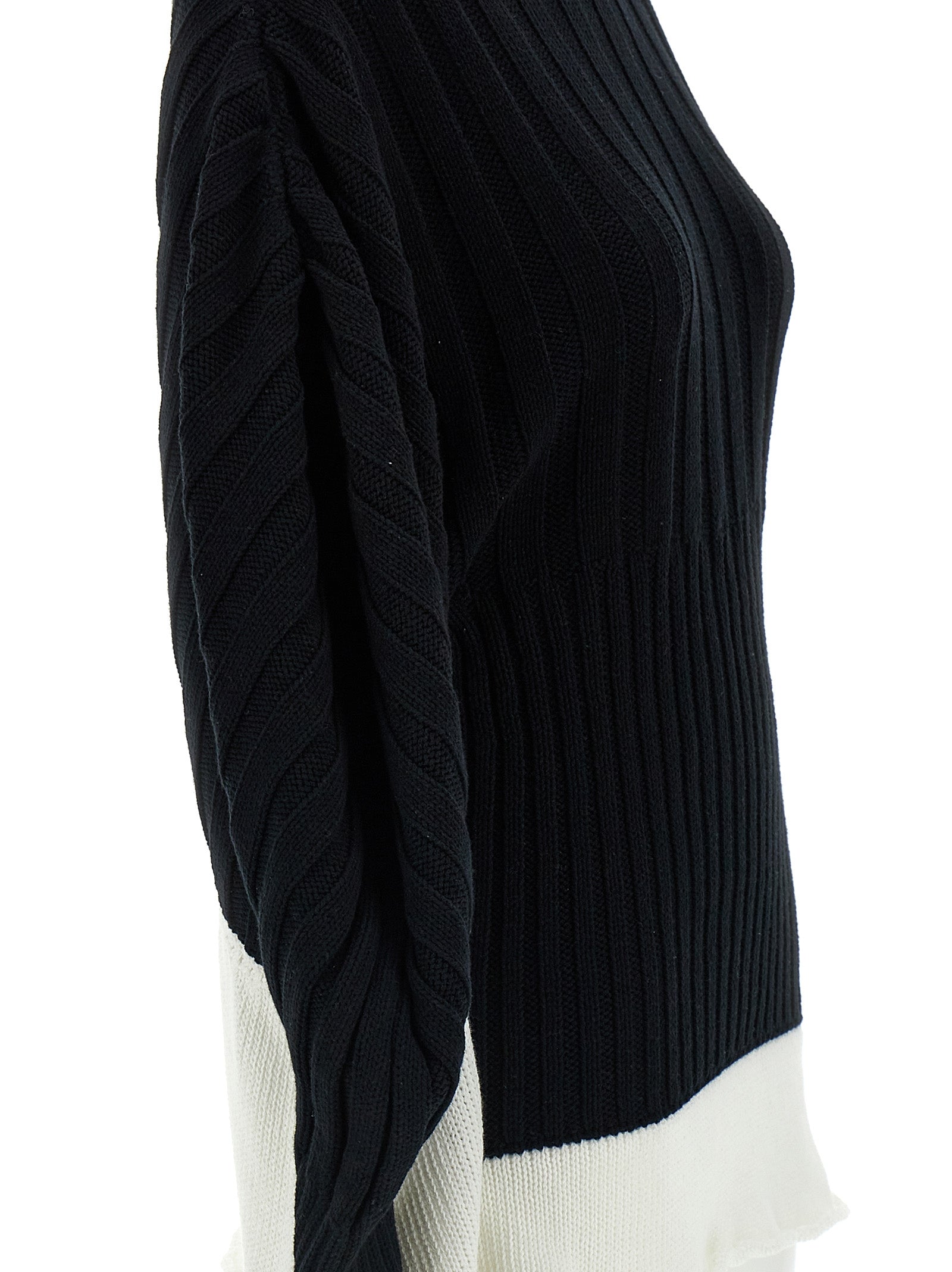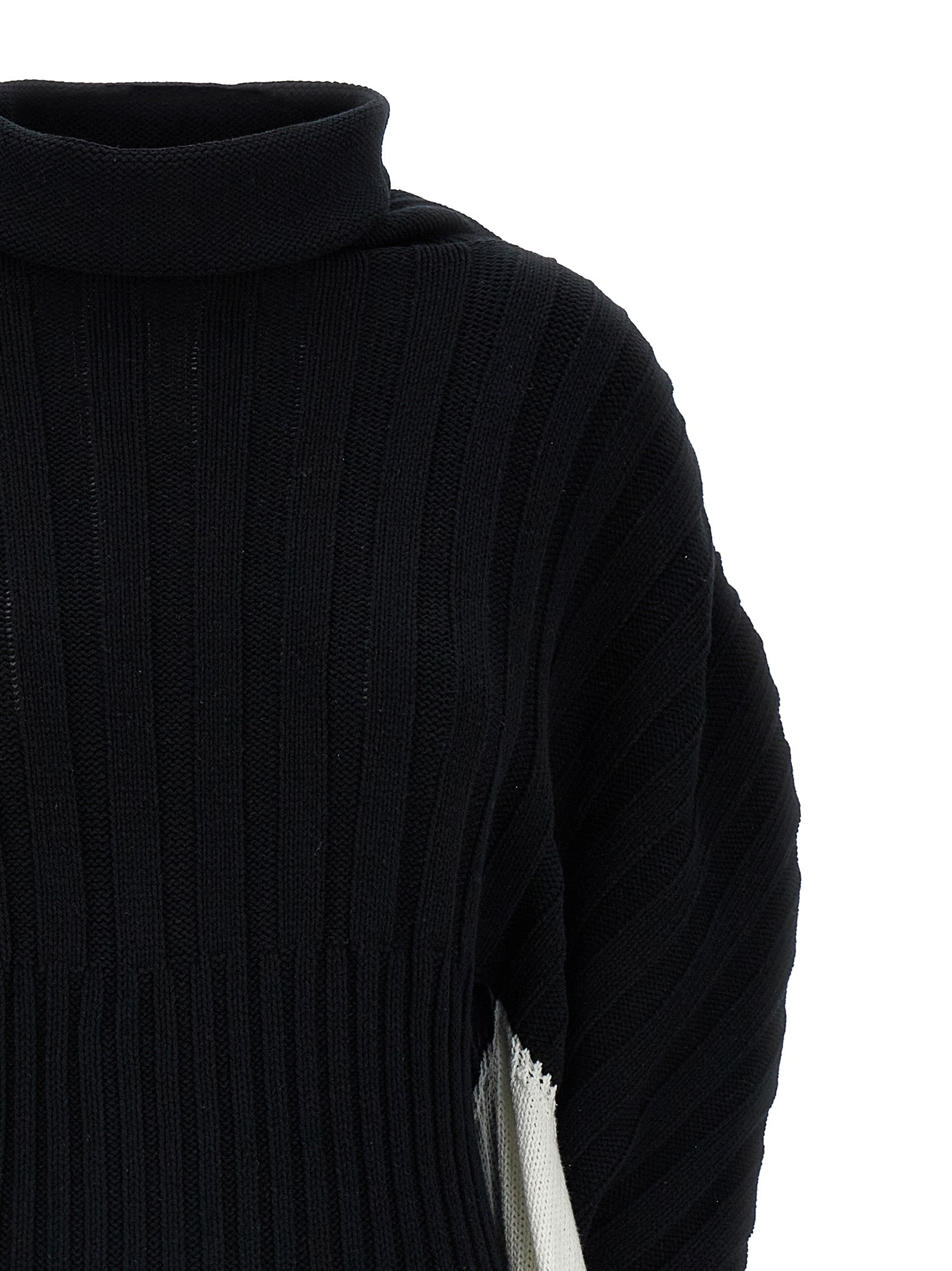 'Hinter den Kulissen' gerippte Baumwollpullover mit hohem Hals, Fledermaushülsen mit ausschnittenen Details, Kontrasthäkeln.