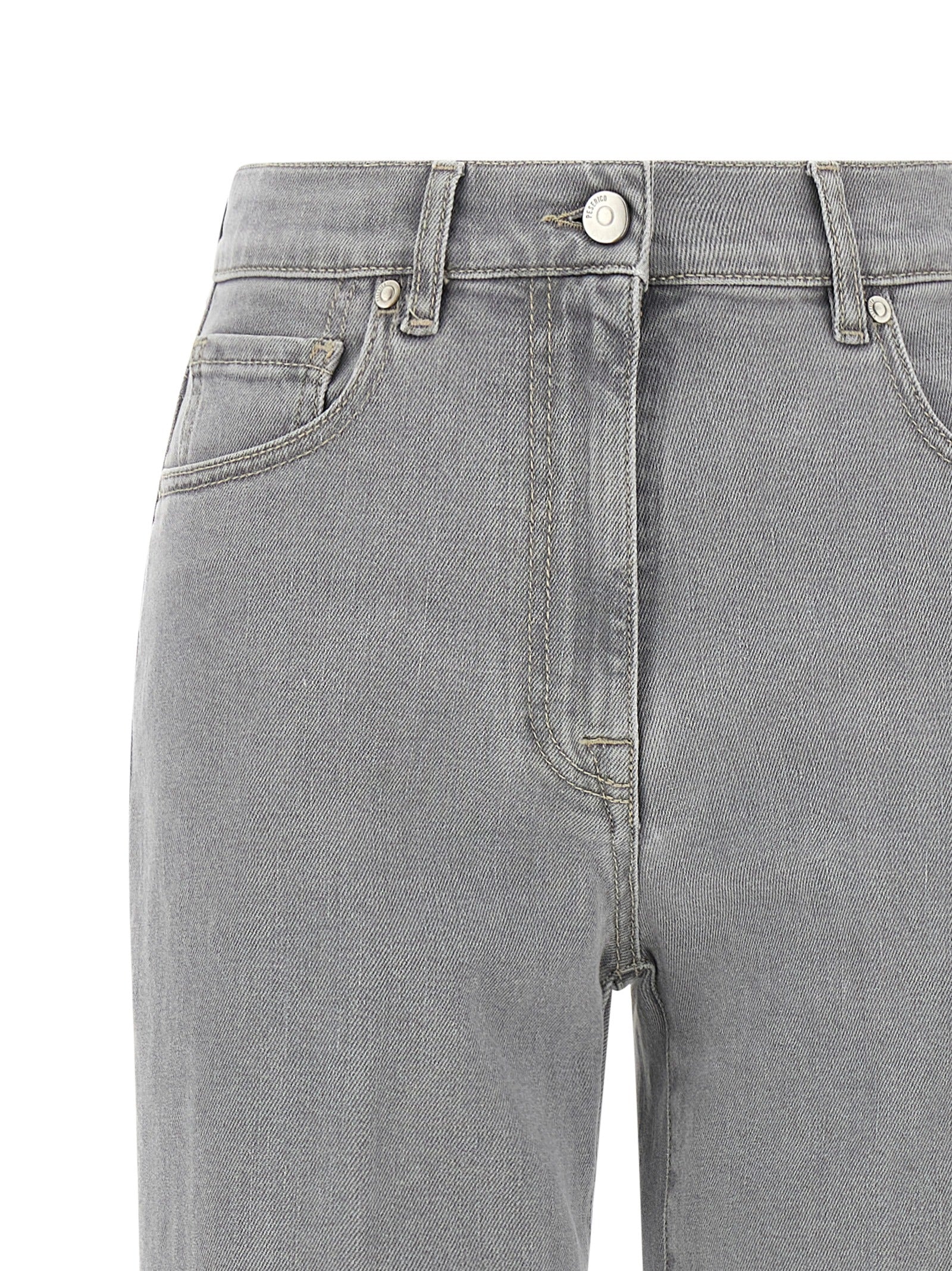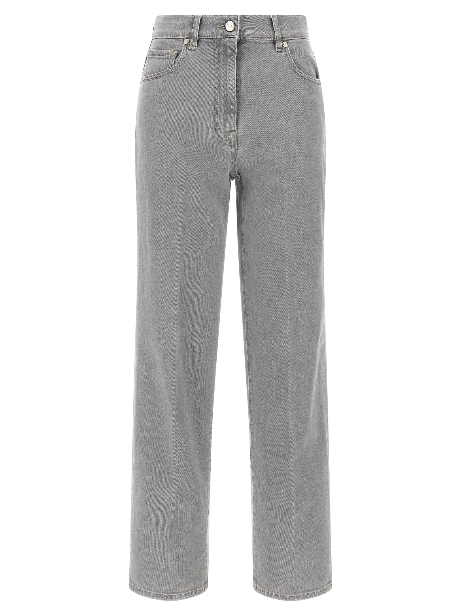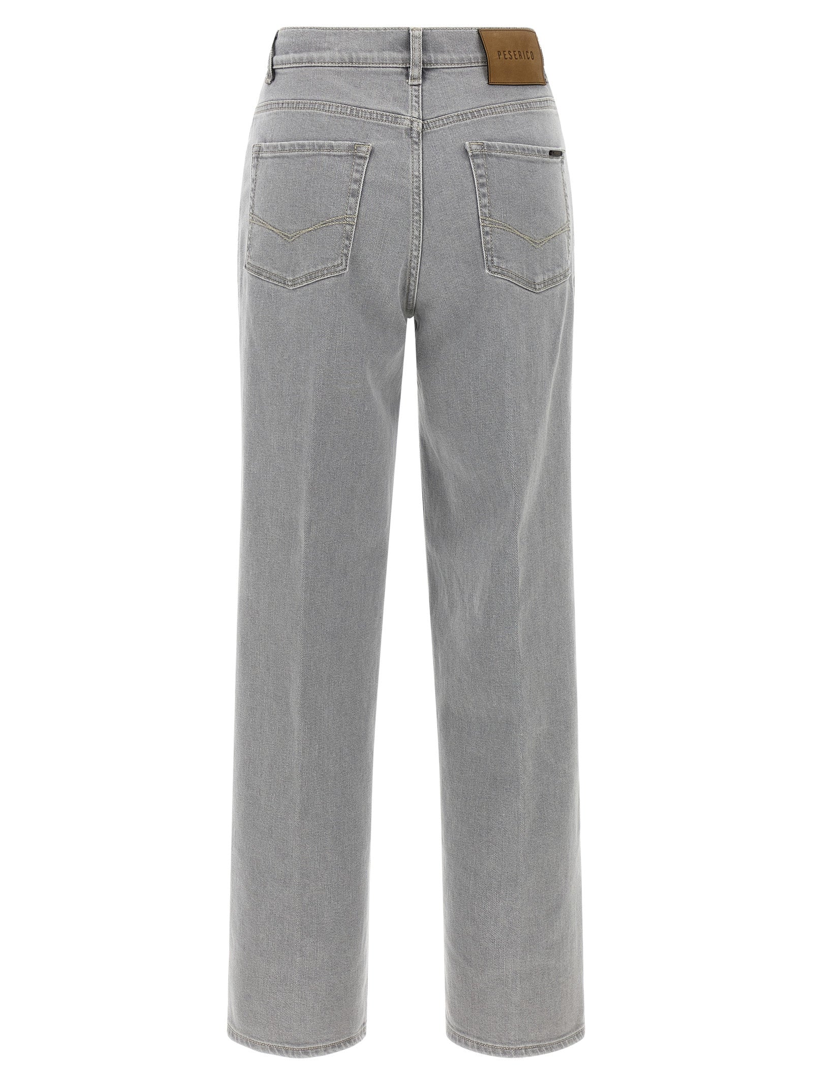 Dehnen Sie Cotton Denim Jeans, gerade Bein, Front Reißverschluss und Knopfverschluss, fünf Taschen, Back -Logo -Tag.