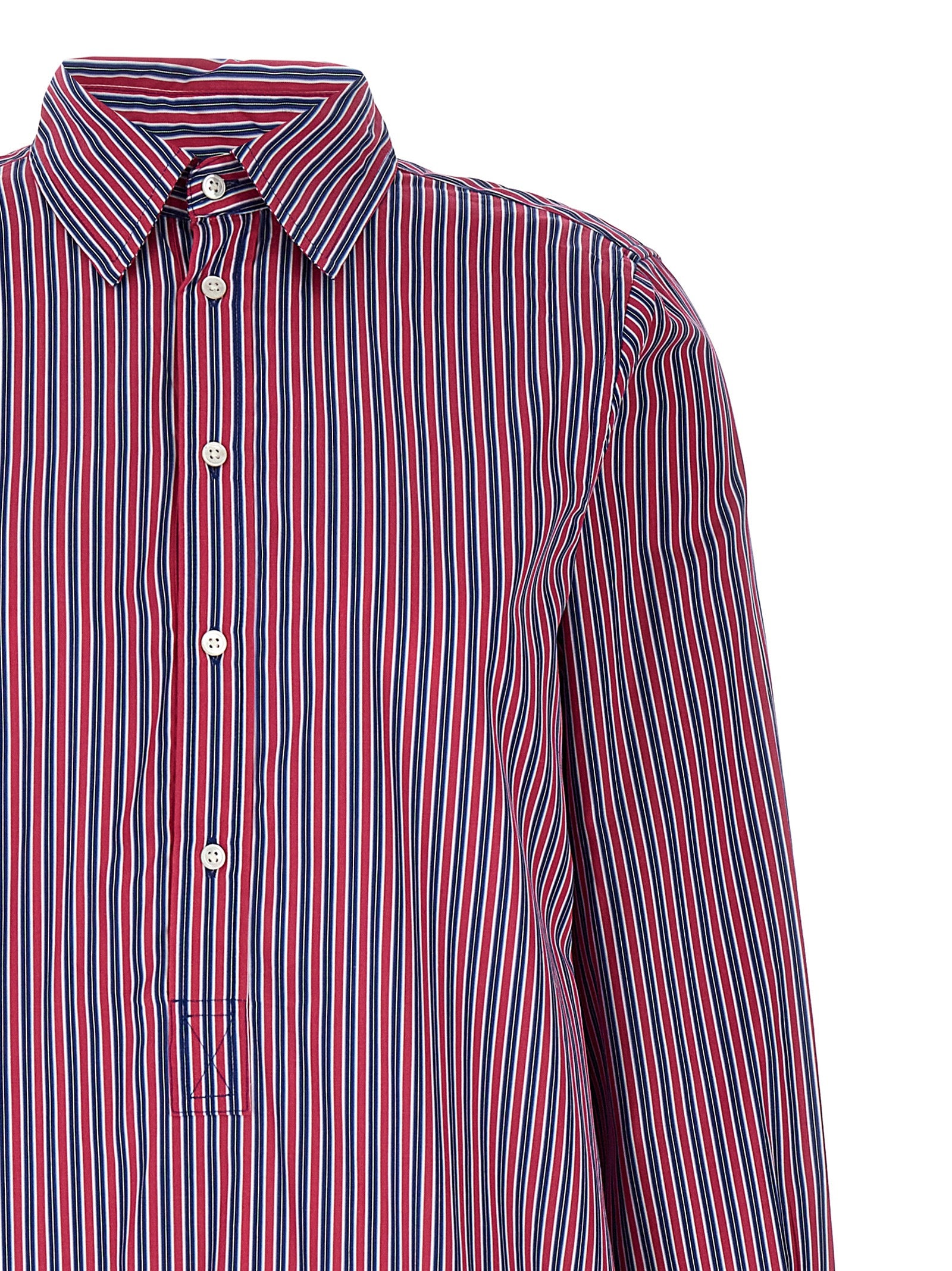 Striped Cotton Poplin Midi-Kleid, Tunika-Stil mit Kragen und Knöpfen, Seitenschlitzen, langen, gefesselten Ärmeln.