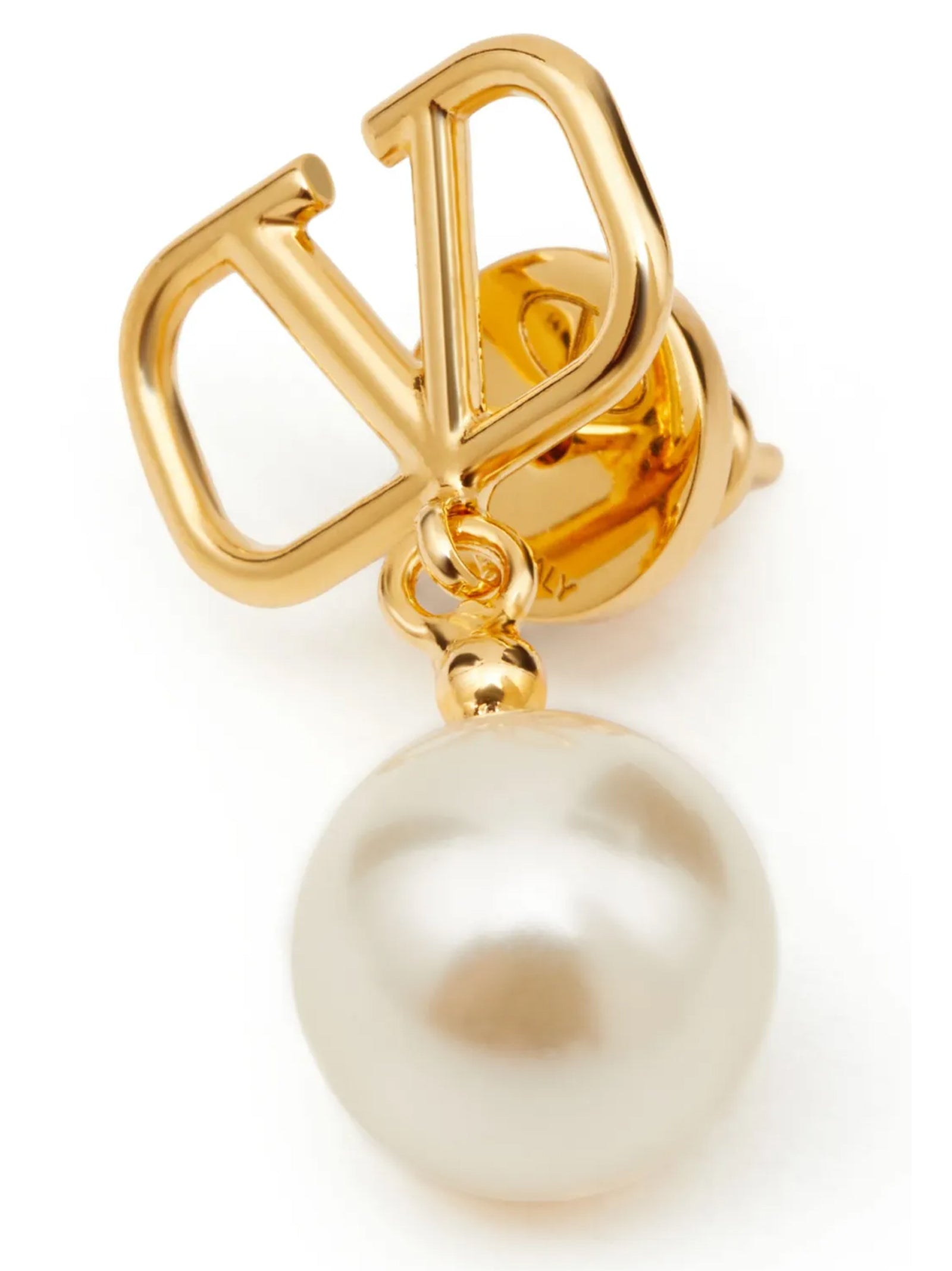 Goldmetallohrringe in Form der Vlogo -Signatur mit Perlenanhänger, Schmetterlingsverschluss. Artikel kann nicht zurückgegeben werden