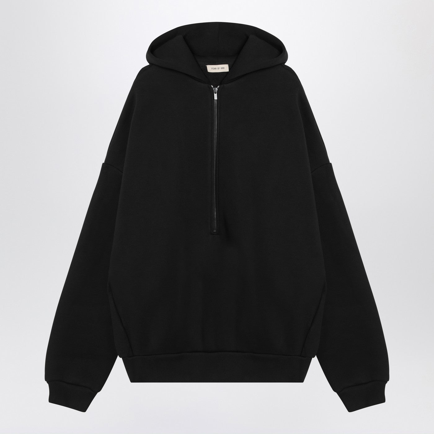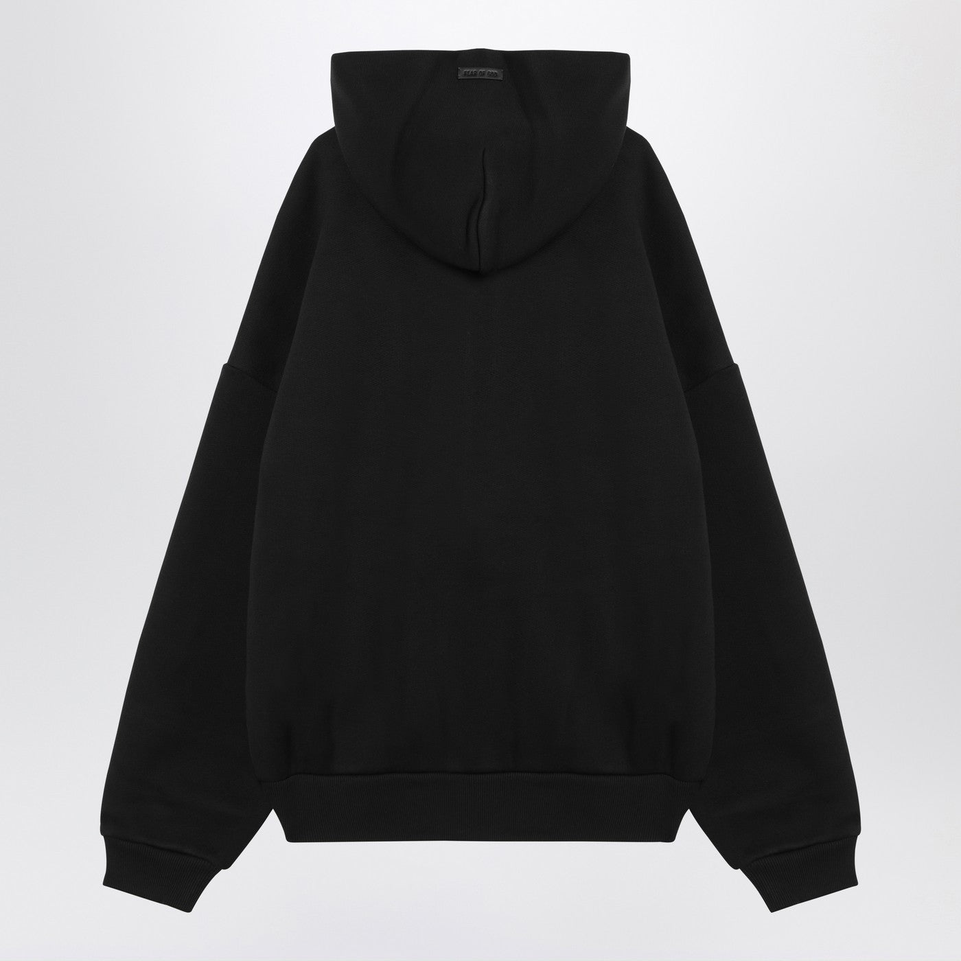Schwarzes Plüsch -Baumwoll -Mischungs -Sweatshirt aus der Angst vor Gott mit einer Reißverschlussfront, langen Ärmeln, fallengelassenen Schulter, gerippten Kanten, einer Motorhaube mit Logo -Patch und einer überdachten Passform.