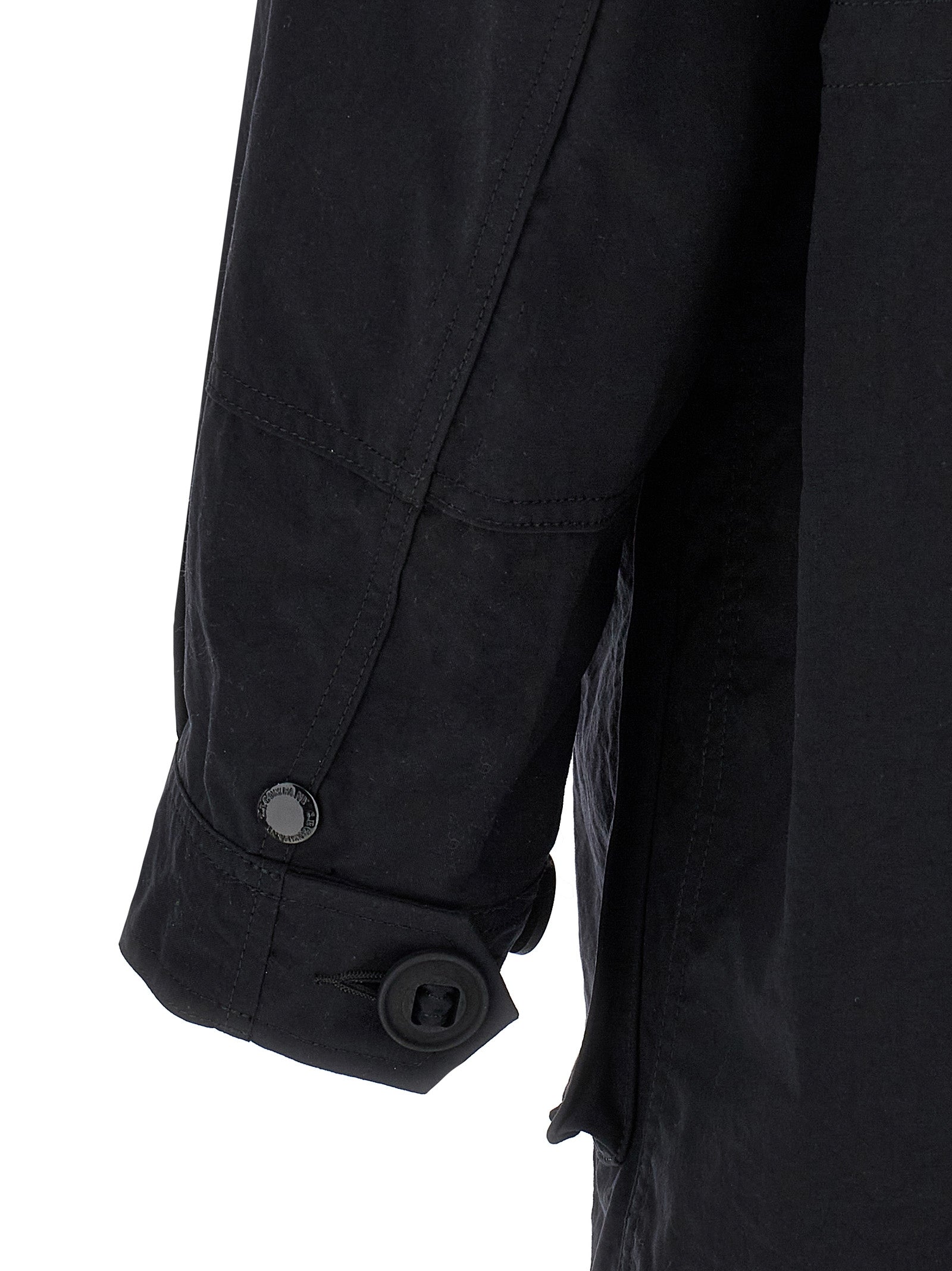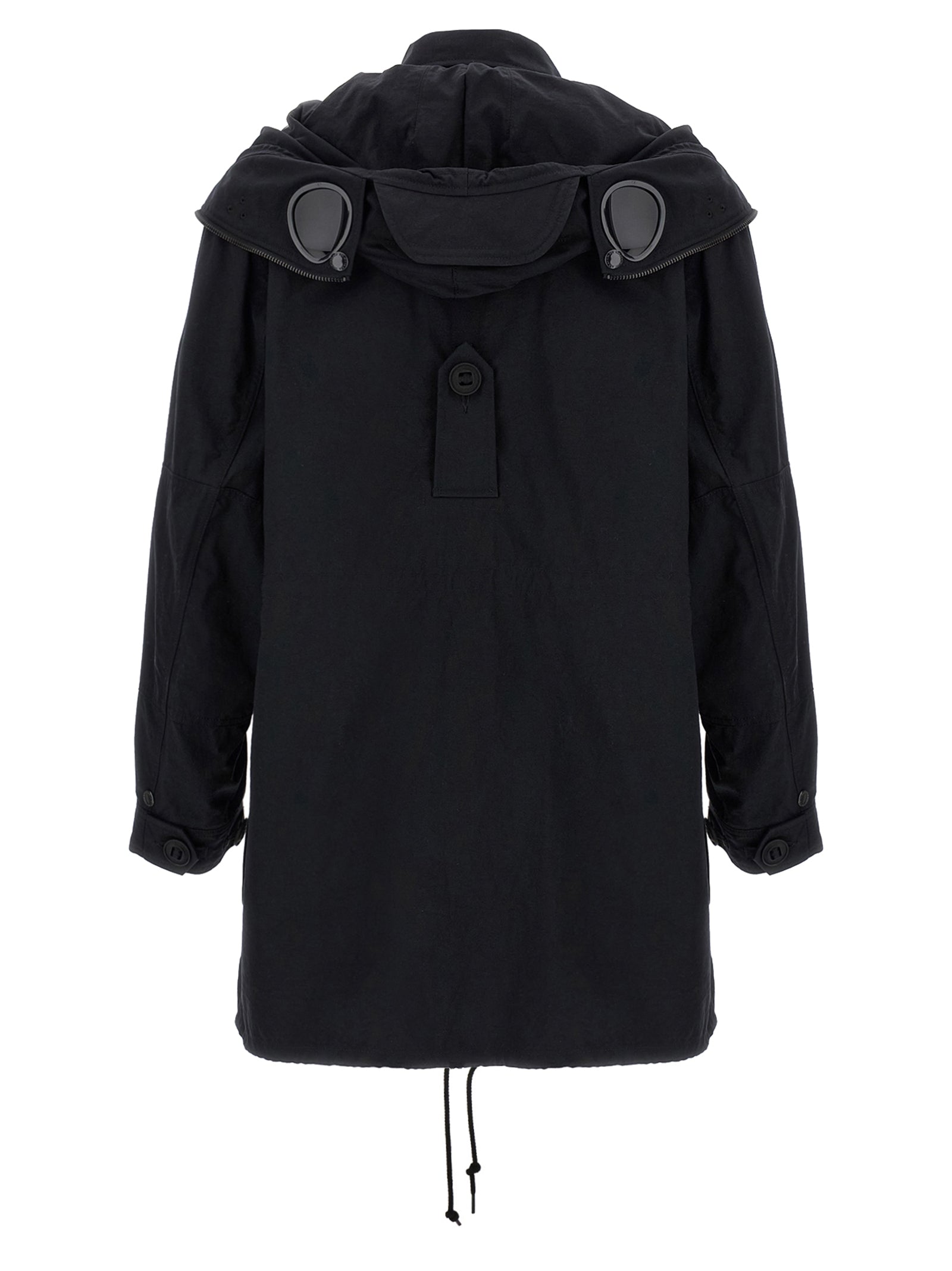 'Junya Watanabe Man X C.P. Firma 'Parka in technischem Stoff, abnehmbare Kapuze mit Objektivdetail, Front Reißverschluss und Knopfverschluss, Kordelkordel am Saum, lange Ärmeln mit verstellbaren Manschetten mit Taste.