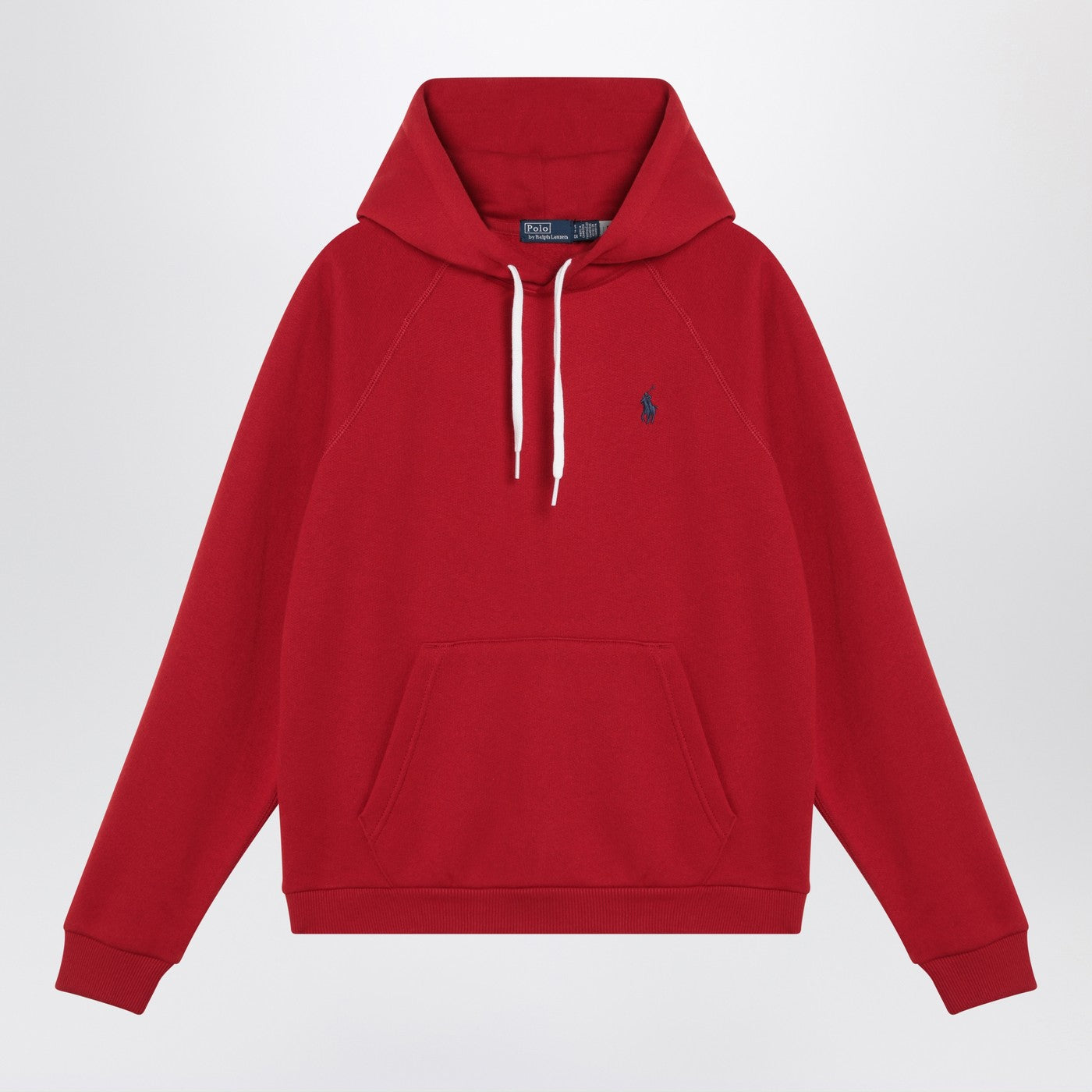 Rotes Plüsch -Baumwoll -Sweatshirt von Polo Ralph Lauren mit einer Kapuze mit Kordelkordel, langen Ärmeln, Logo -Stickereien auf der Brust, gerippten Säumen und einer Beuteltasche vorne.