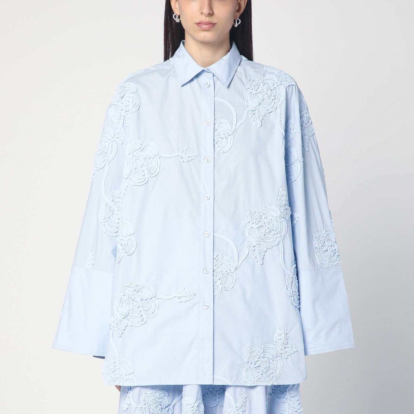 Rotate shirt in recycled polyester in light blue, characterized by tone-on-tone embroidered flowers, front button closure, long sleeves with buttoned cuffs, classic collar, oversized fit, and curved hem.