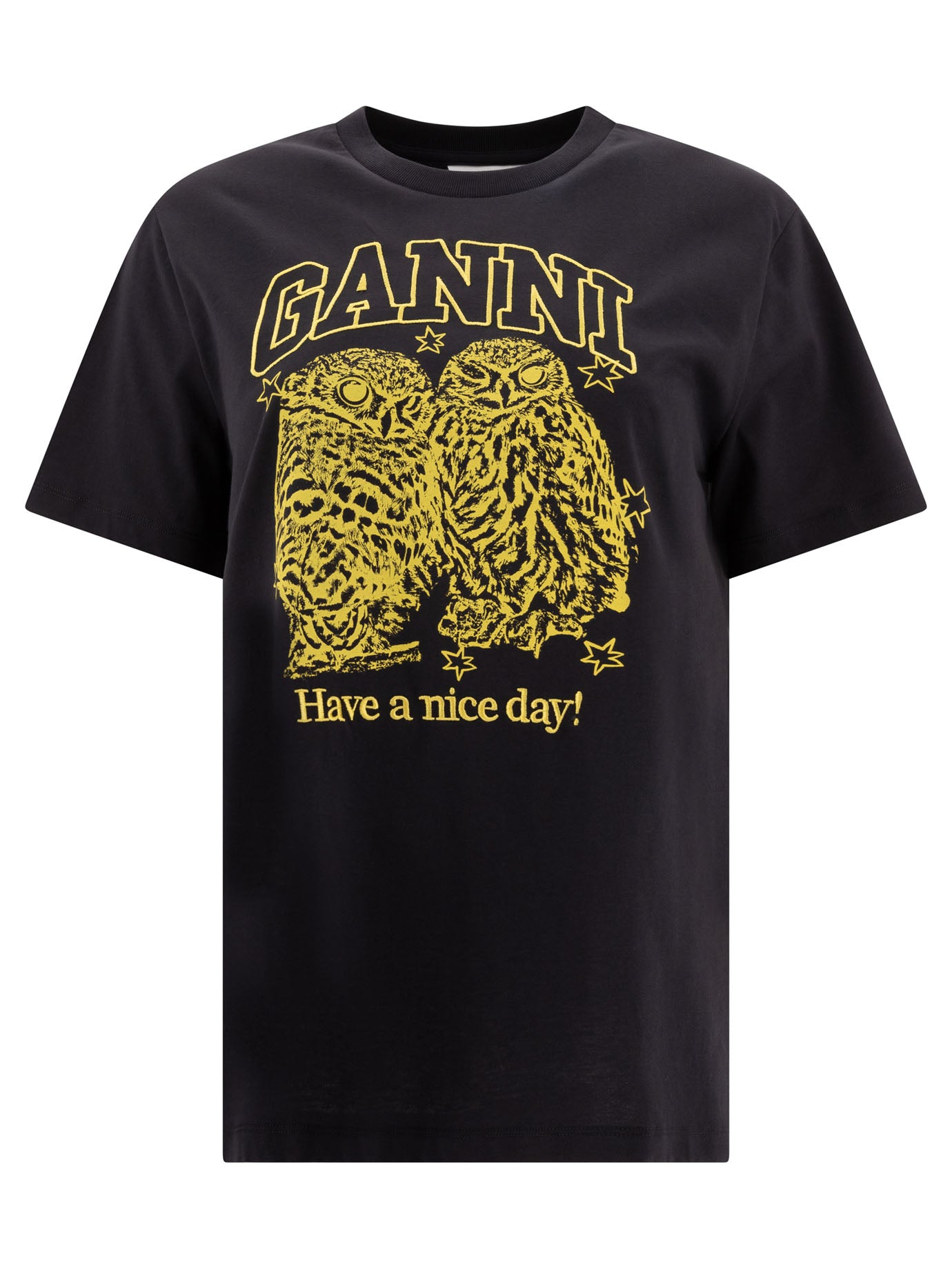 The Ganni cotton jersey T-shirt combines comfort and style with its relaxed fit, perfect for any occasion. The graphic Owls print and printed GANNI logo offer a unique touch to this women's wardrobe essential. The versatile design makes it ideal for creating casual and contemporary looks.