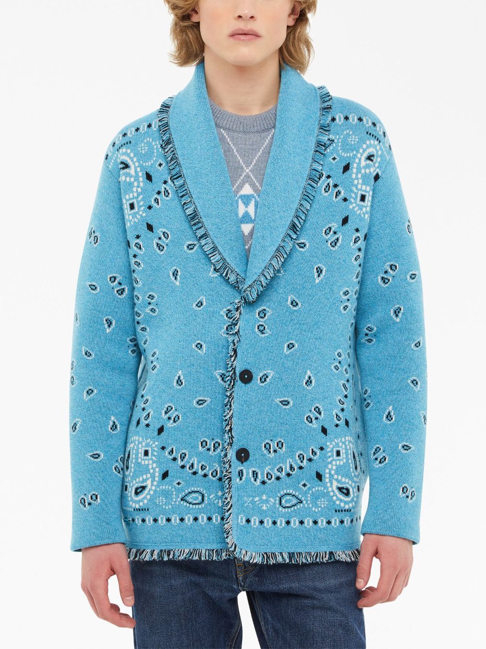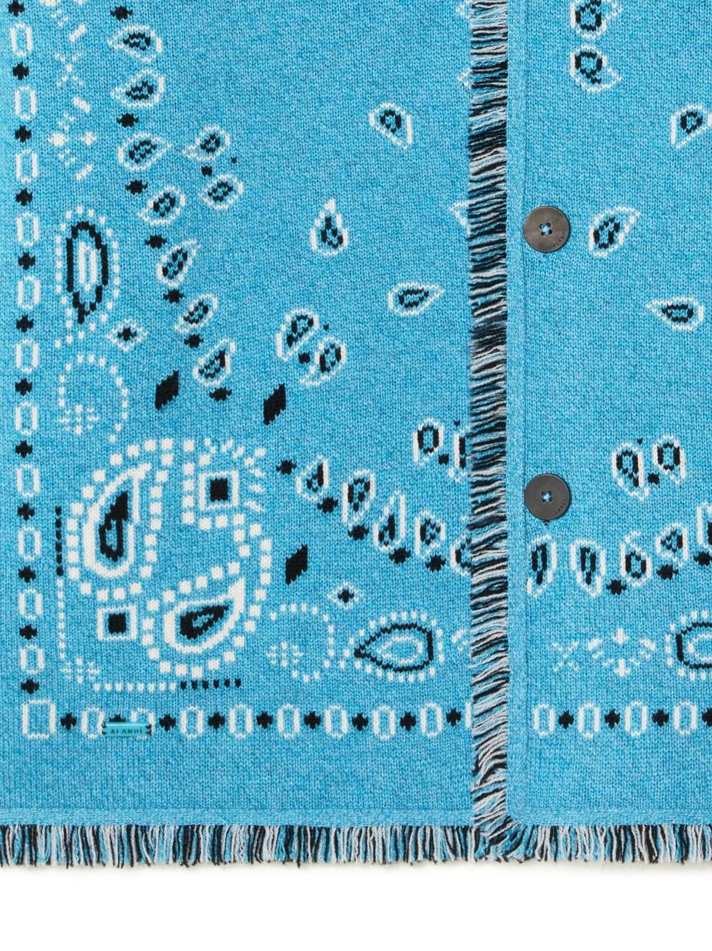 Bandana Jacquard Fransen -Strickjacke aus Alanui mit Aqua Blau, Schwarz, Weiß, Kaschmir, Leinen, gemustertem Jacquard, Fransendetails, Schal -Lapps, Vorderknopfbefestigung, langen Ärmeln und ausgefrallten Saum.
