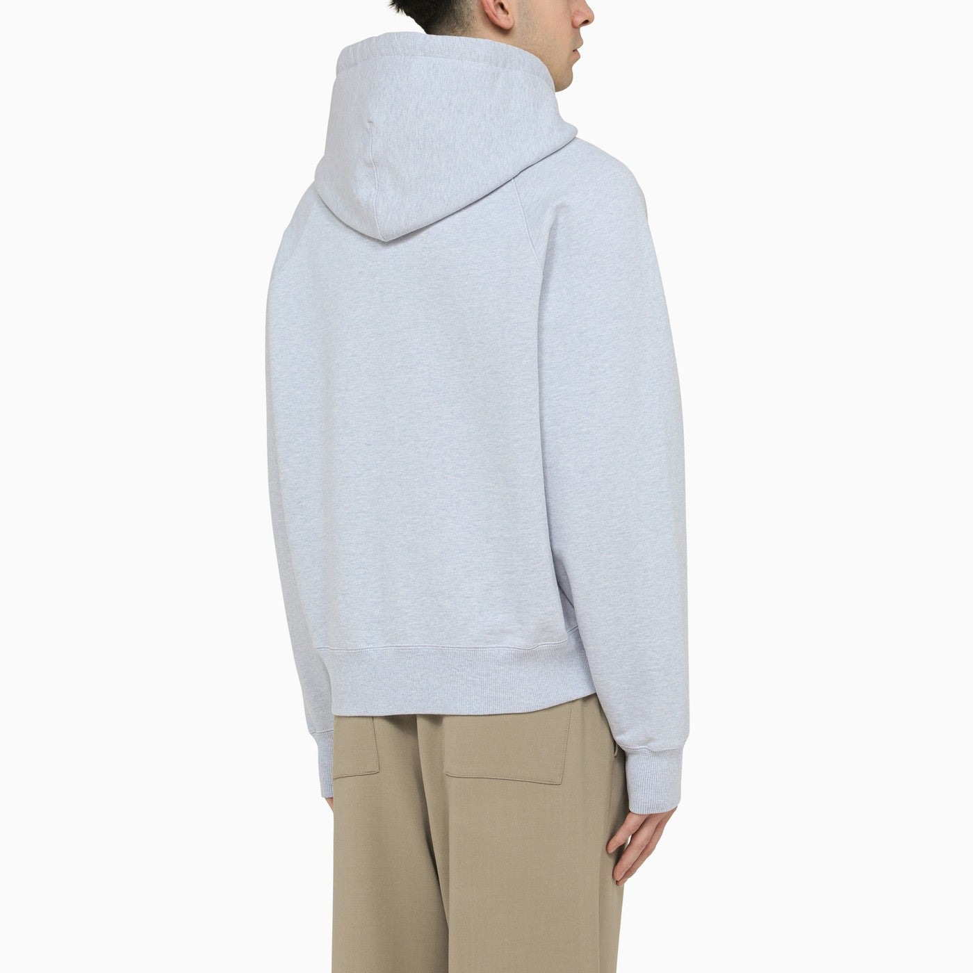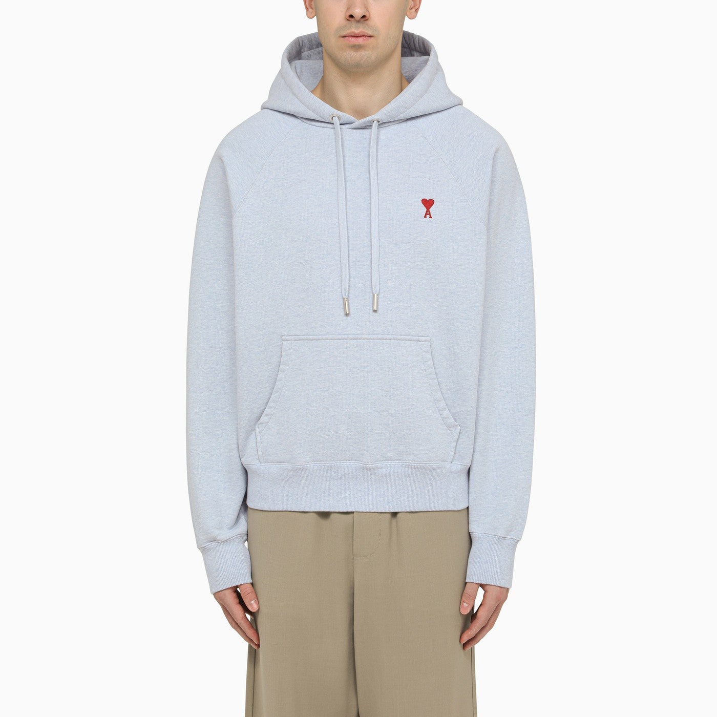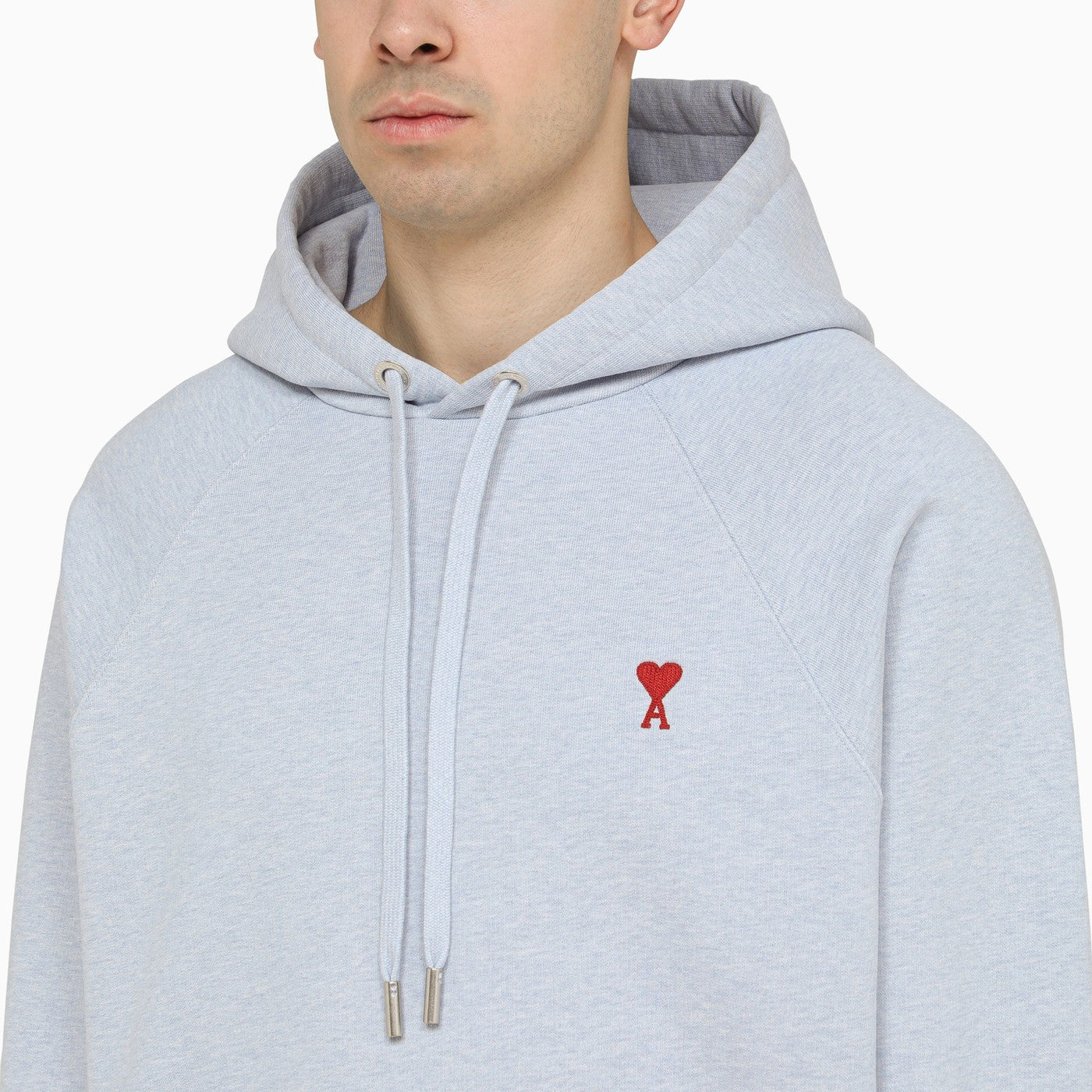 Cashmere Blue Cotton Sweatshirt Hoodie von Ami Paris mit Ami de Coeur -Stickerei auf der Brust, einer verstellbaren Kordelkordelhaube, einer langen Raglan -Hülse und der Beuteltasche vorne.