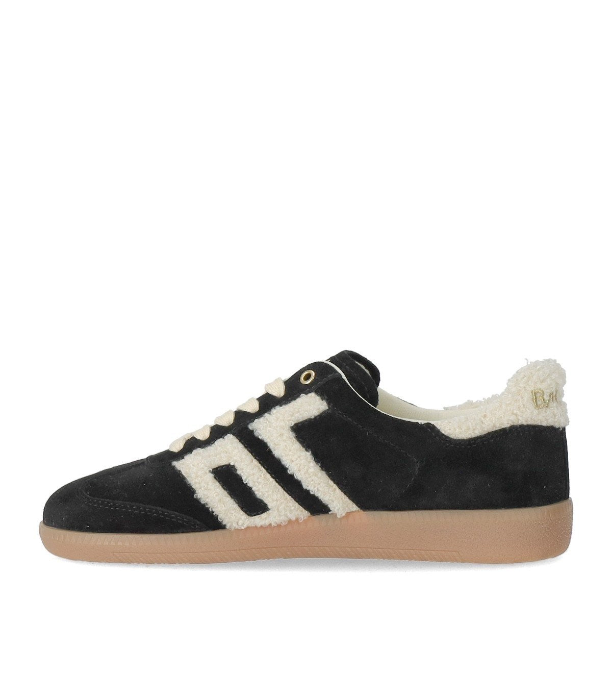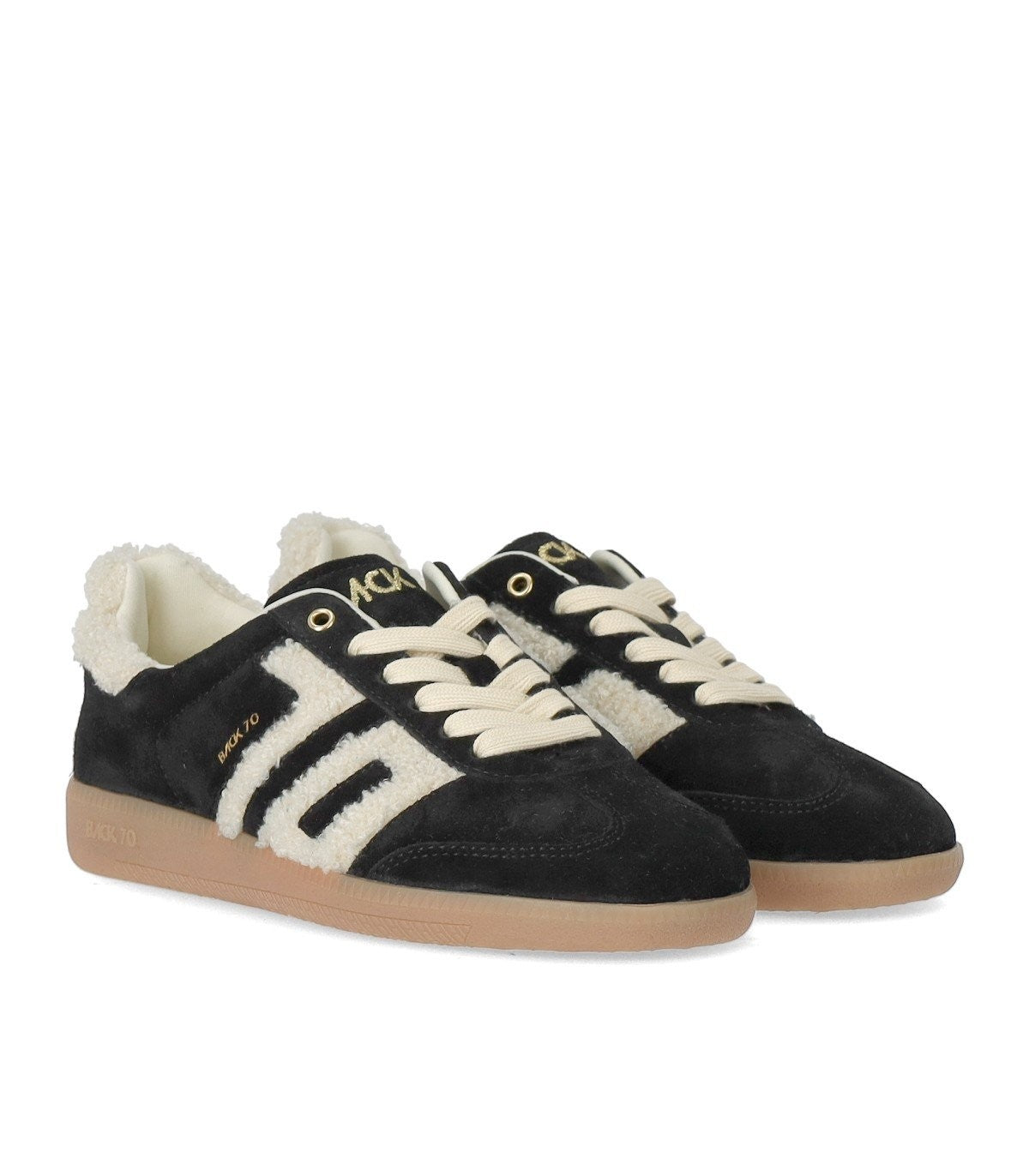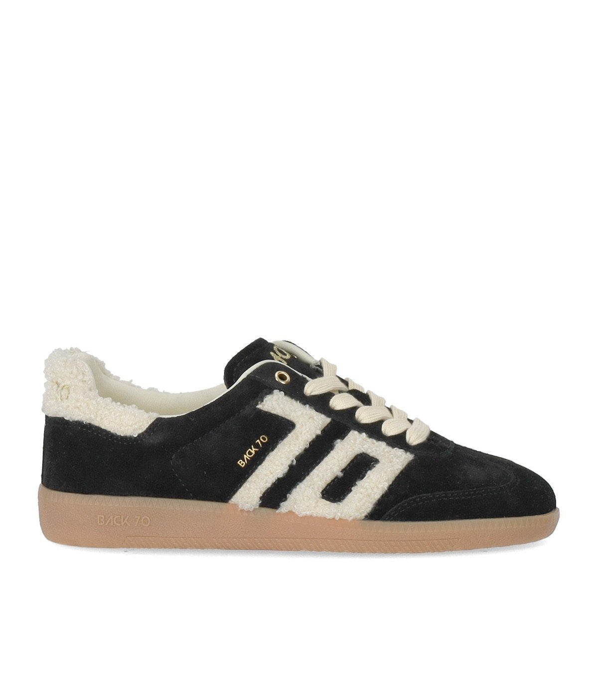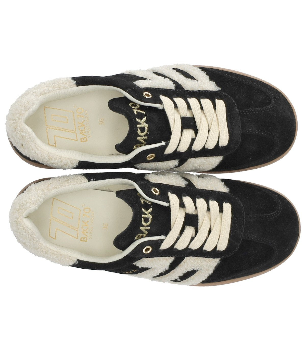 Beige Wildlederfell -Turnschuhe von Back70 aus Wildlederleder in schwarzer Farbe. Gekennzeichnet durch eine externe Gummiabsatz und die Seitenbewegung mit weißen Felldetails. Interne Baumwollfutter und externe Zunge mit gedrucktem Goldlogo. Baumwollschnürsenkel. Sohle Messung 3 cm.