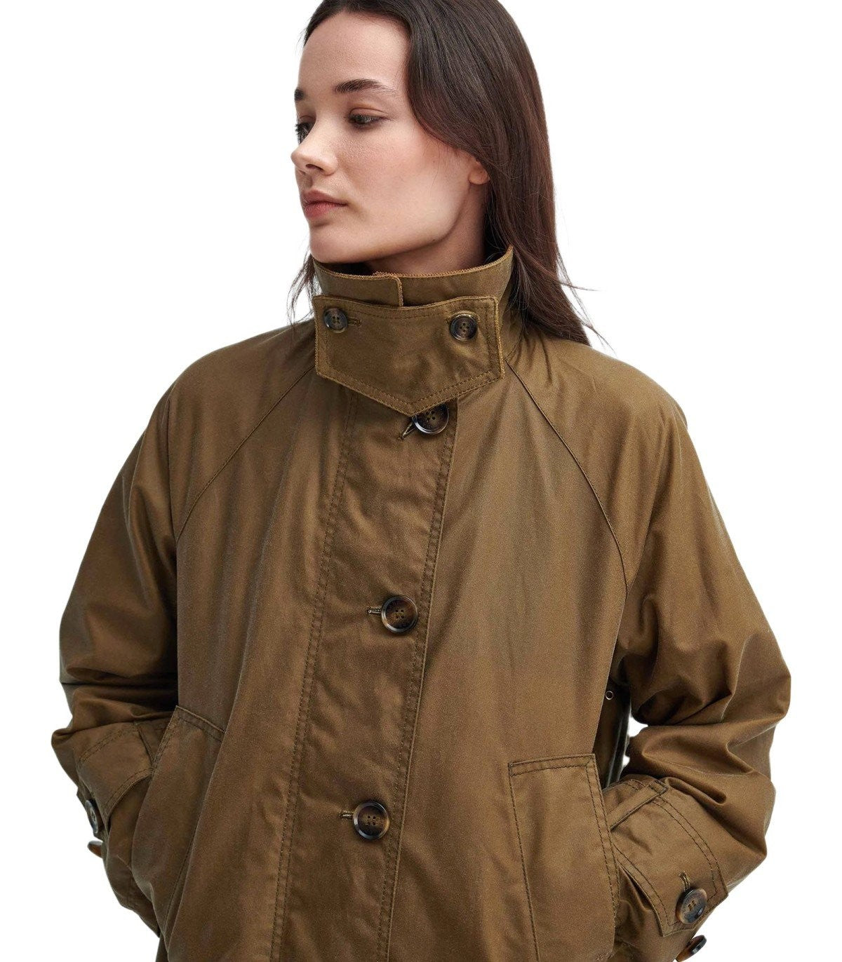 Barbour Hartwick Wachs Sandjacke aus gewachertem Baumwoll in Sandfarbe. Aus einer A-Linie gekennzeichnet, verfügt sie über einen Vorderknopfverschluss in Kunsthorn und einen Kabelhalter. Ausgestattet mit einem Kragen aus geripptem Stoff, hat es zwei Lappentaschen vorne. Verstellbare Manschetten mit Tasten. Übergroße Passform. Außenzusammensetzung: 100% gewachste Baumwolle. Auskleidung: 100% Polyester. Tropfstreifen: 100% Polyester.