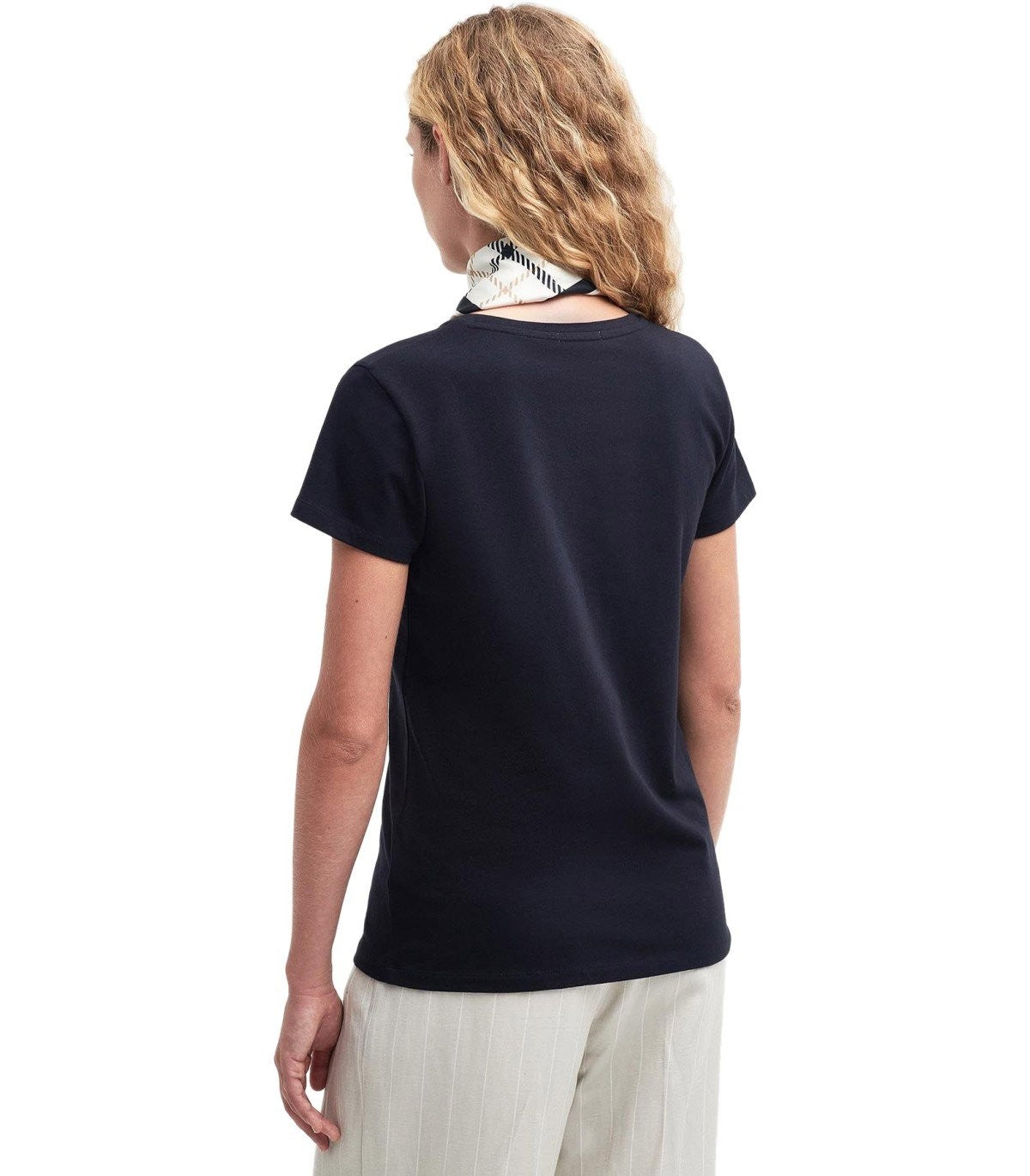 Highlands T-Shirt von Barbour, hergestellt aus marineblauer Stretch-Baumwollmischung, mit Kontrastdruck auf der Vorderseite verziert. Schlanke Passform. Zusammensetzung: 94% Baumwolle, 6% Elastane.