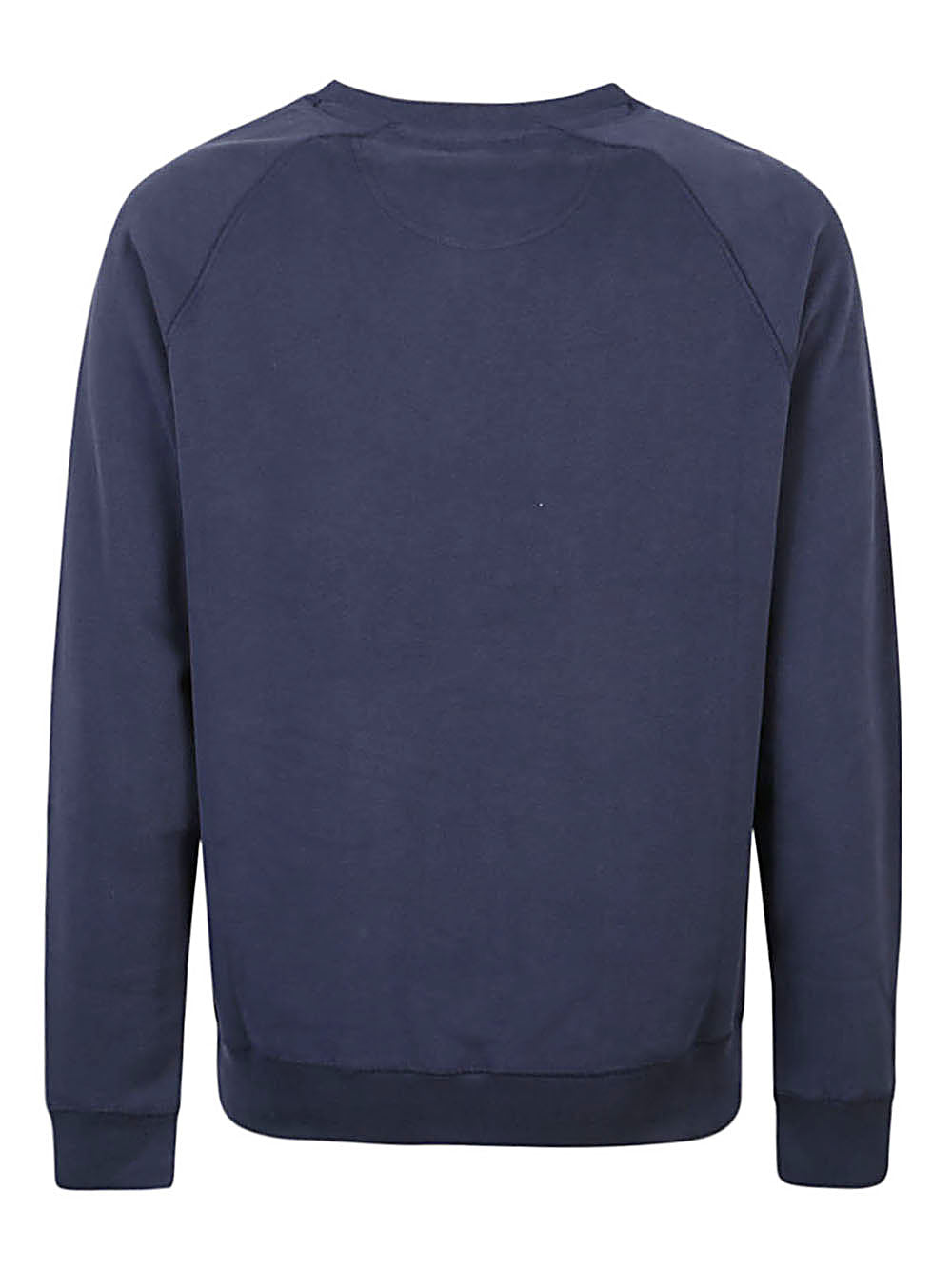 Blaues Sweatshirt, Crewing, vorne geschrieben, lange Ärmel.