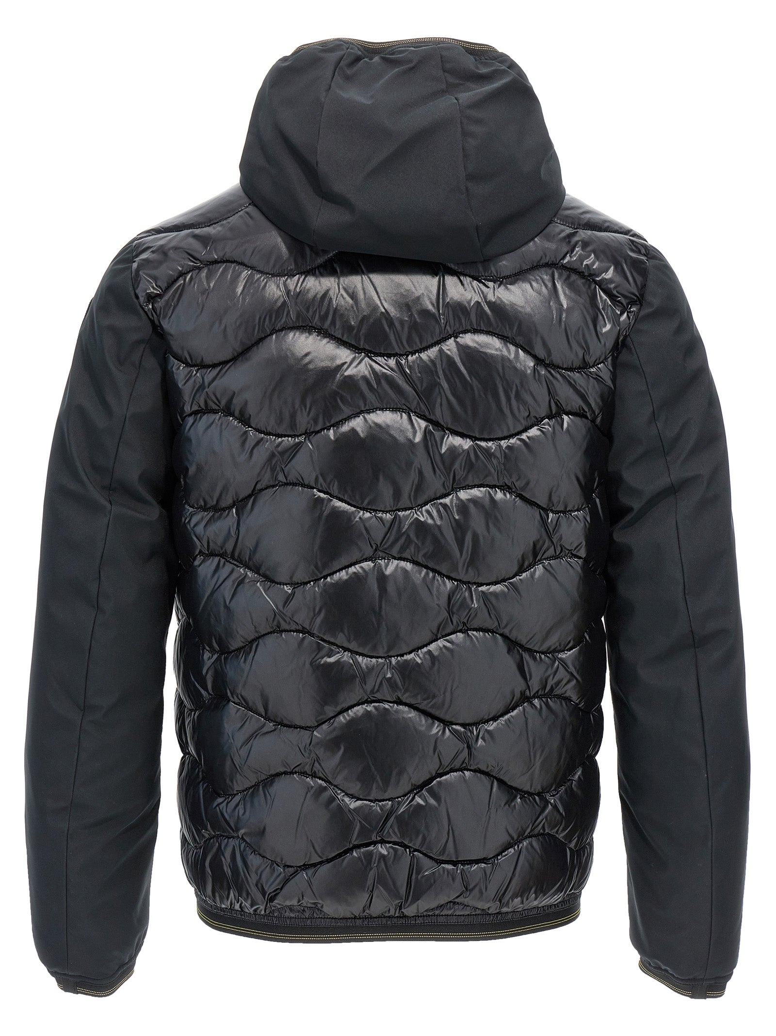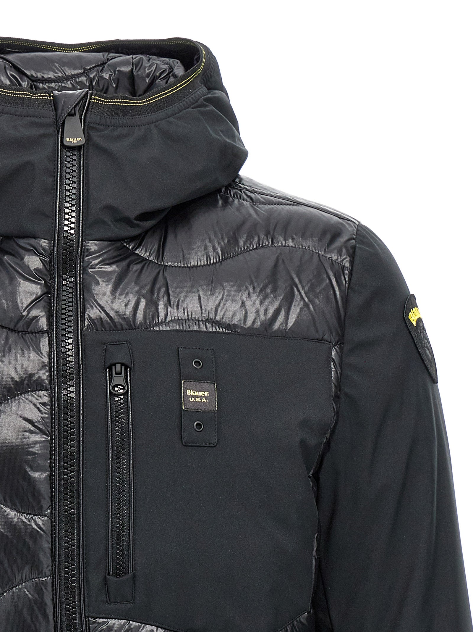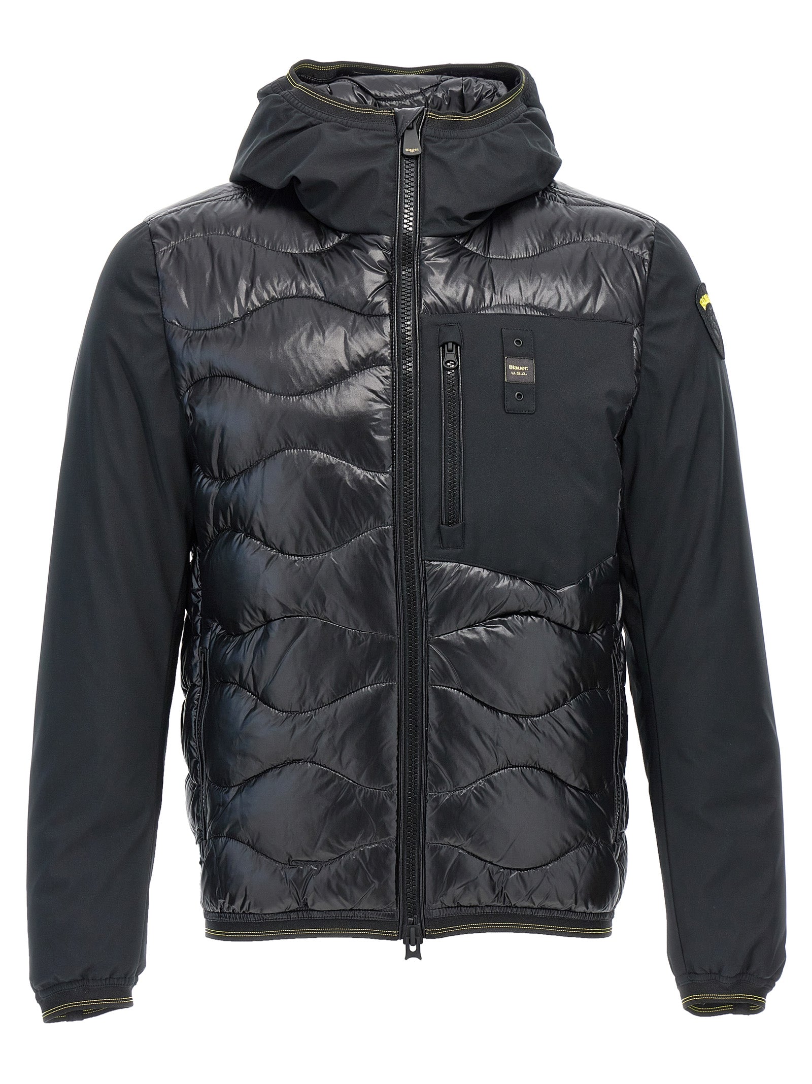 Gepolsterte Nylon -Down -Jacke, Taschenhaube und lange Ärmel mit Kontraststoffmanschetten, Logo -Applikationen am Ärmel, Reißverschluss, Taschen, Kontrastleitungen.