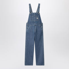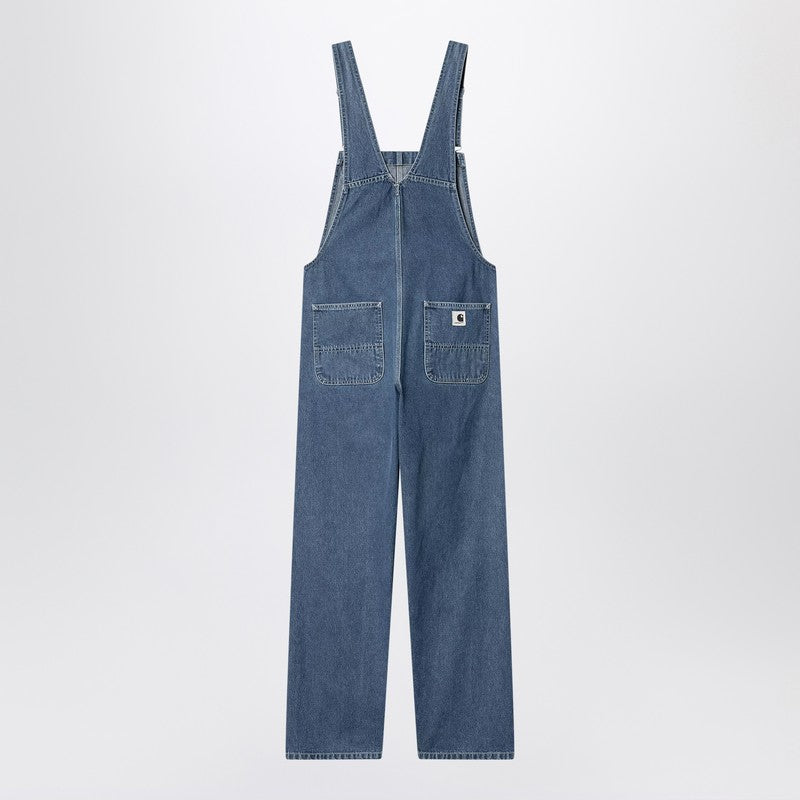 Carhartt -WIP -Overalls in haltbarer blauer Baumwoll -Denim mit Metallnieten, mehreren Taschen, verstellbaren Trägern, einer Brusttasche mit einem quadratischen Stofflogo -Etikett und einem Stofflogo -Etikett in der Gesäßtasche.
