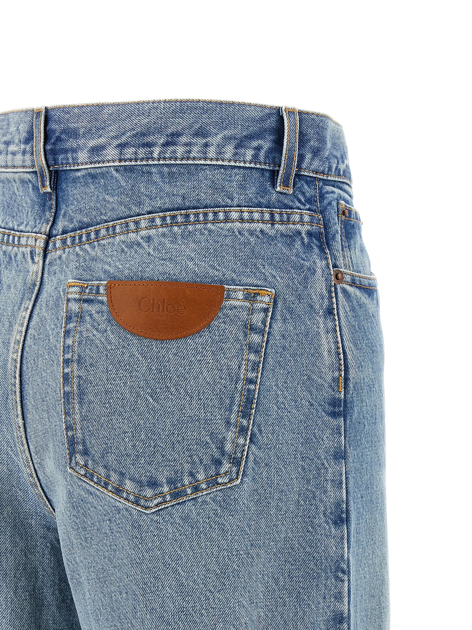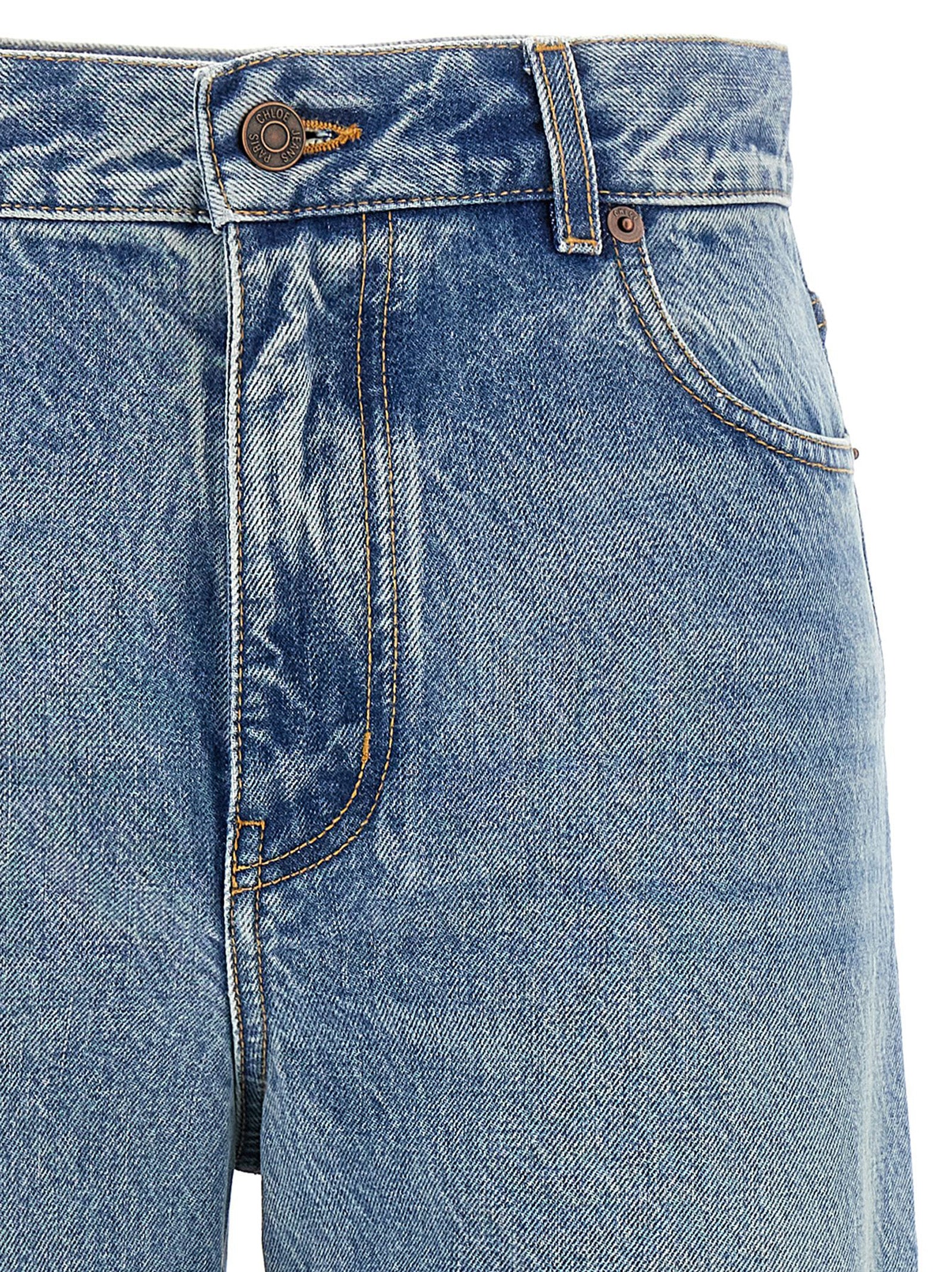 Cottondelavé -Jeans, Front -Reißverschluss und Knopfverschluss, fünf Taschen, breites Bein, hoher Taillenmodell, ausgefranste Beinböden mit rohem Schnittsaum und Leder -Logo -Etikett auf der Rückseite.