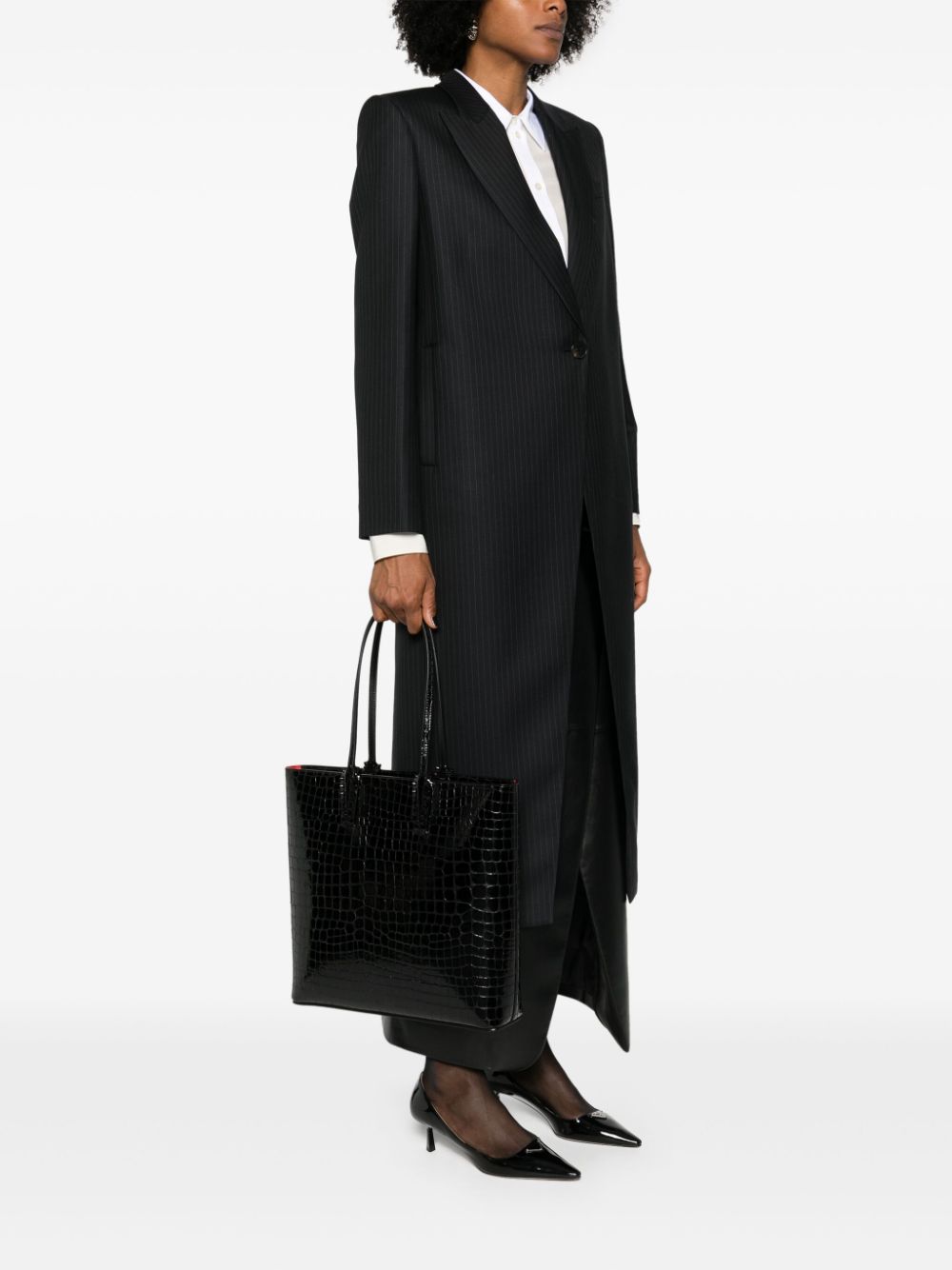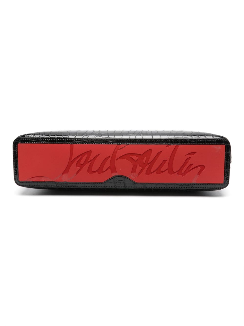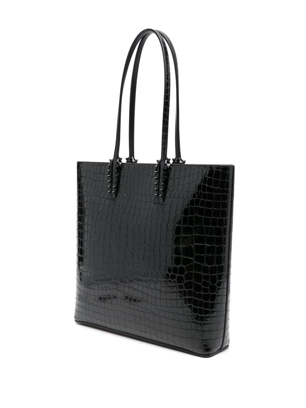 Schwarzes Kalb Leder Patent Finish geprägter Krokodileffekt Rechteck Körper Zwei flache obere Griffe Spike-Bolzen-Detail-Logo-Debossed an den unteren Hauptkompartiment Kontrastauskleidung Top Reißverschluss Dieses Stück ist komplett mit einem Schutzstaubbeutel ausgestattet.