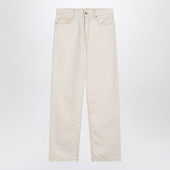 Darkpark -Hosen in der ECRU -Baumwollmischung, gekennzeichnet durch einen Frontverschluss mit Reißverschluss und Knopf, hohe Taille mit Gürteltschlaufen, fünf klassischen Taschen, sichtbaren Nähten und einem Patch auf der Rückseite.