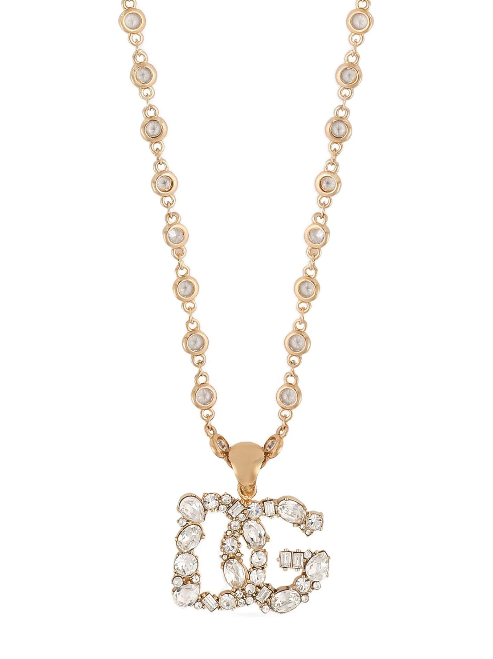 Goldmetallkette mit Kristallen und Logo -Charme.
