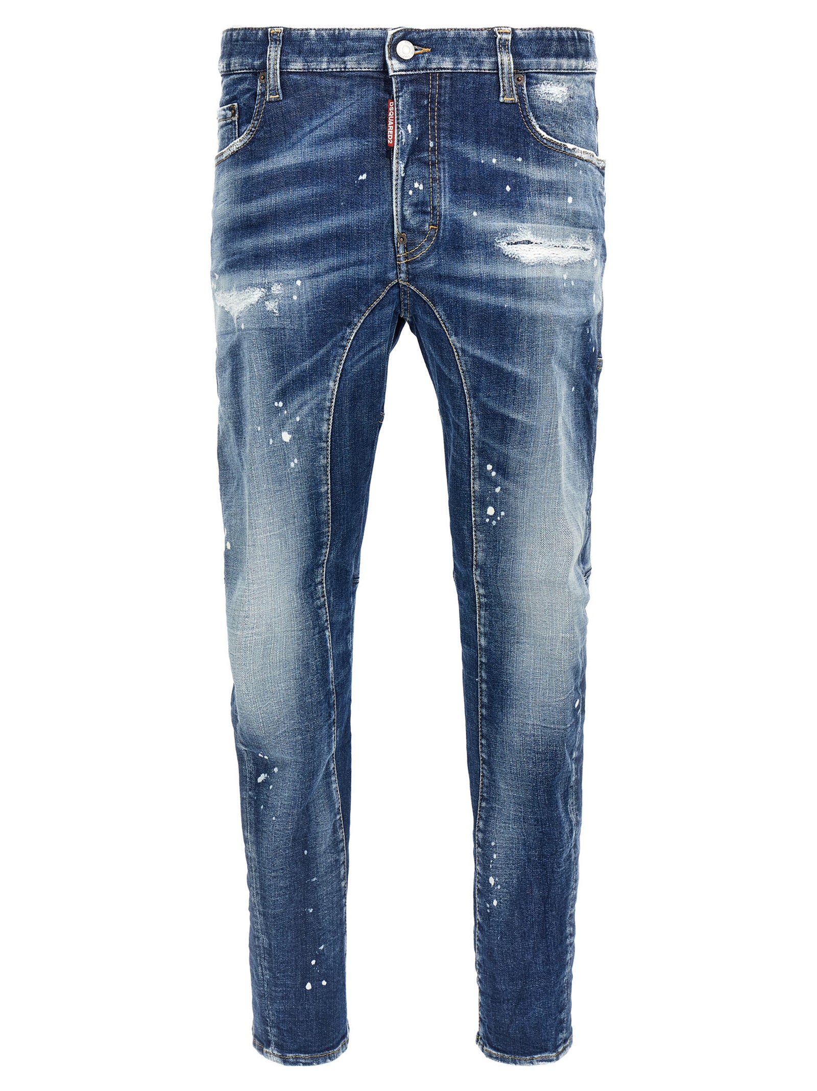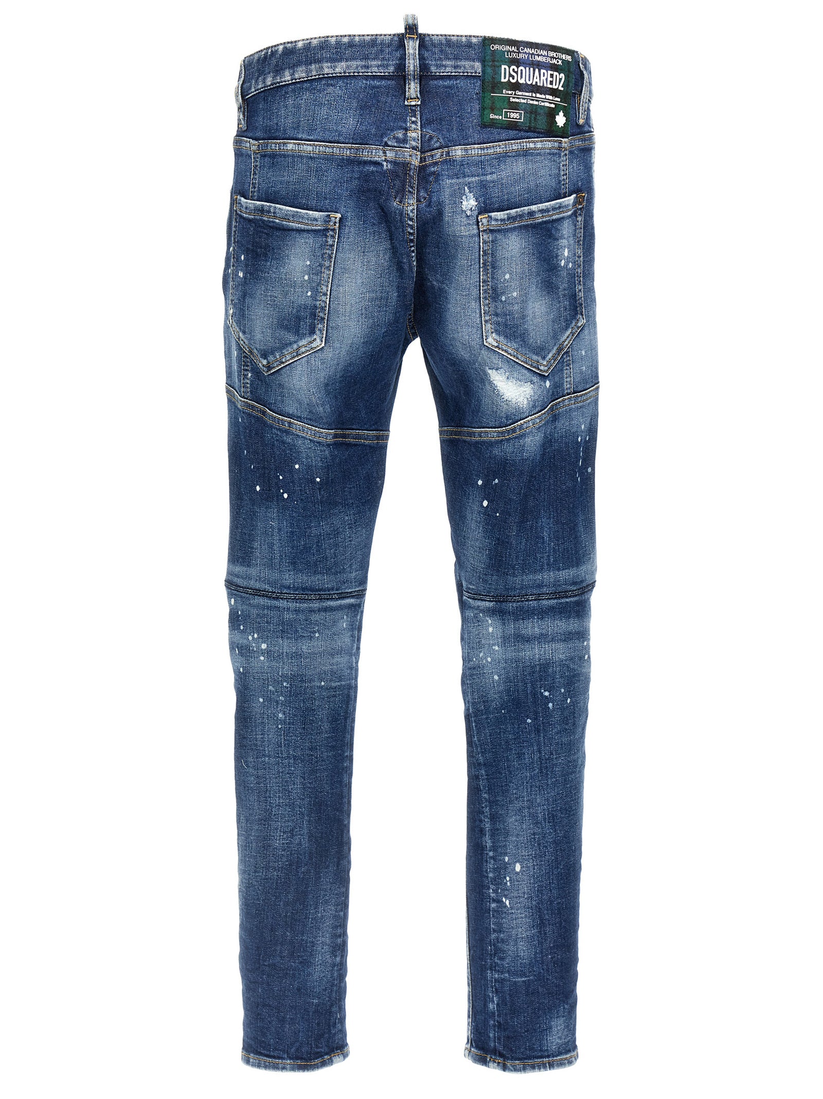 'Tidy Biker' Stretch Cotton Denim-Jeans mit Details mit Gebrauchswire, kleinen Reifen und Farbflecken, fünf Taschen, Knopfverschluss, Kontrastnähten am Bein, Filzlogo-Etikett auf der Rückseite.
