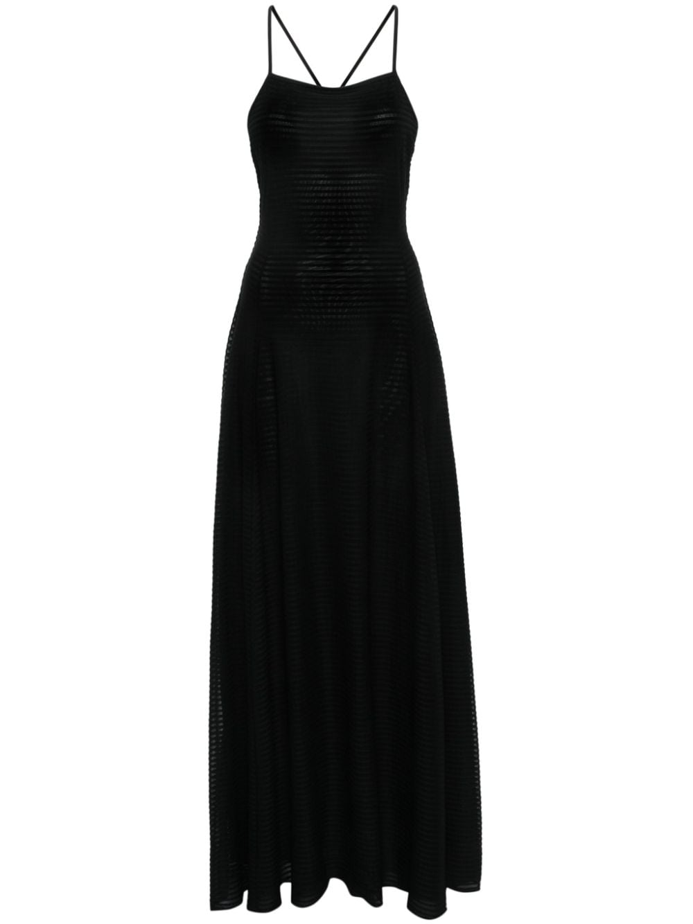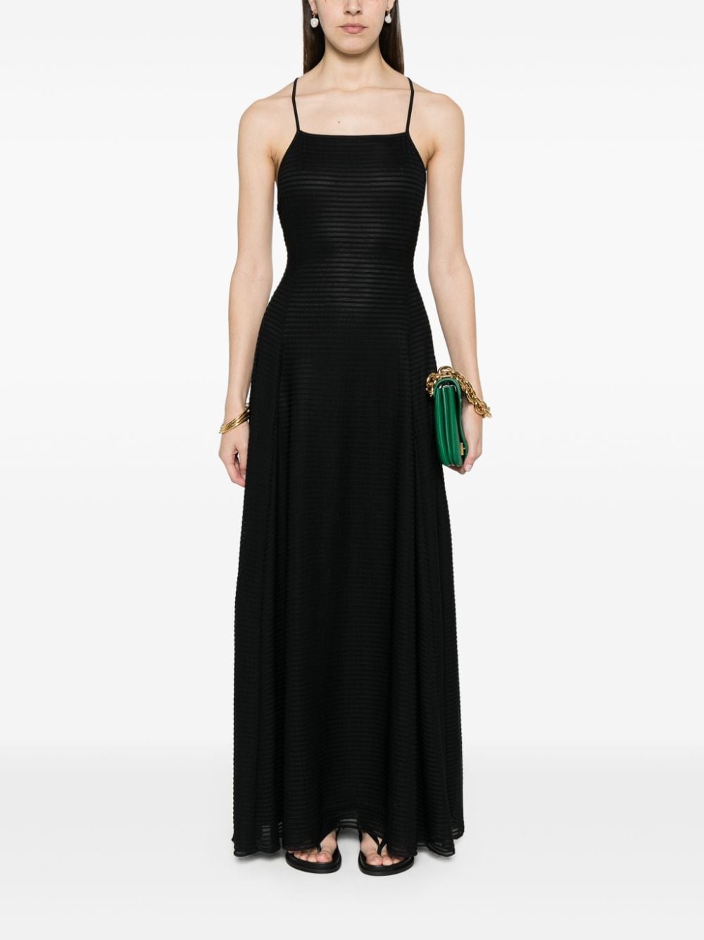 schwarz fein gestrickem halbschalen konstruktion horizontales streifenmuster quadratischen nacken spaghetti gurte nahe detaillieren hintere kriss-kreuzgurte lange länge gerade saum verdeckte reißverschlussbefestigung