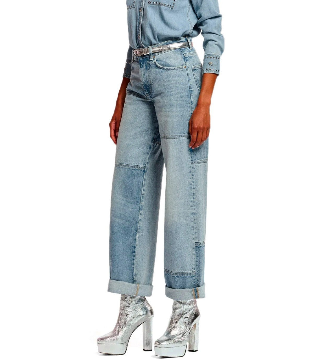 Essentiel Antwerpen Fastere Jeans bestehen aus Light-Wasch-Baumwoll-Denim mit Patchwork-Effekt-Anwendungen. Hohe Taille, Fünf-Tocket-Design, Reißverschluss und Knopfverschluss. Gerade Bein, entspannte Passform. Das Modell ist 180 cm groß und trägt eine Größe 27. Zusammensetzung: 80% Baumwolle, 20% recycelter Baumwolle. Taschenfutter: 65% Polyester, 35% Baumwolle.