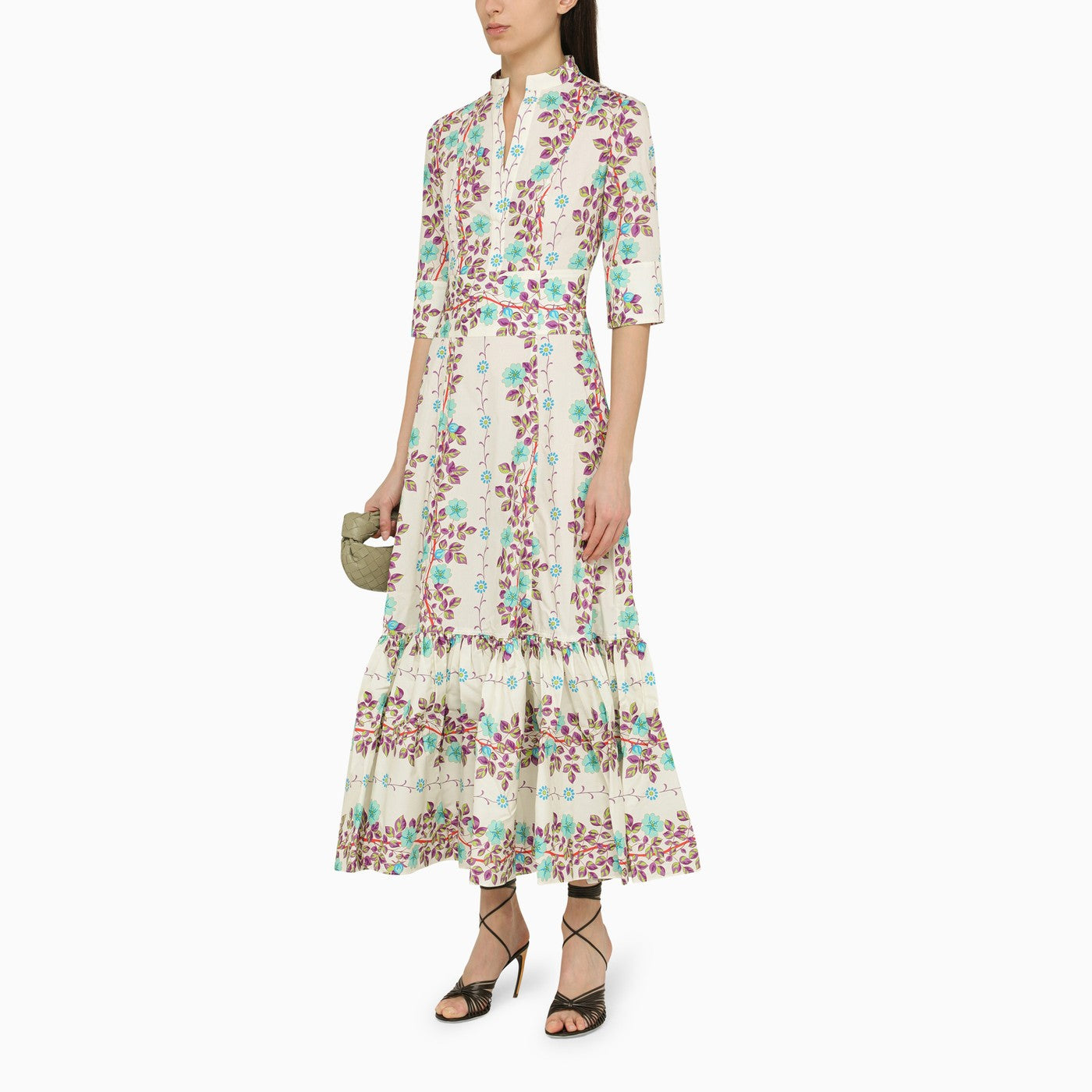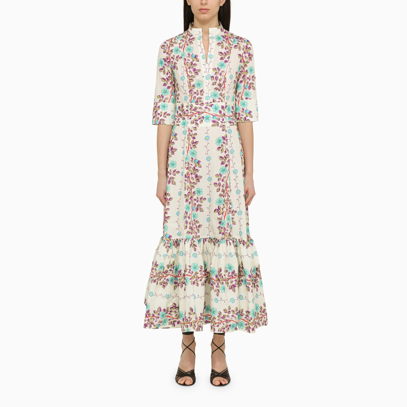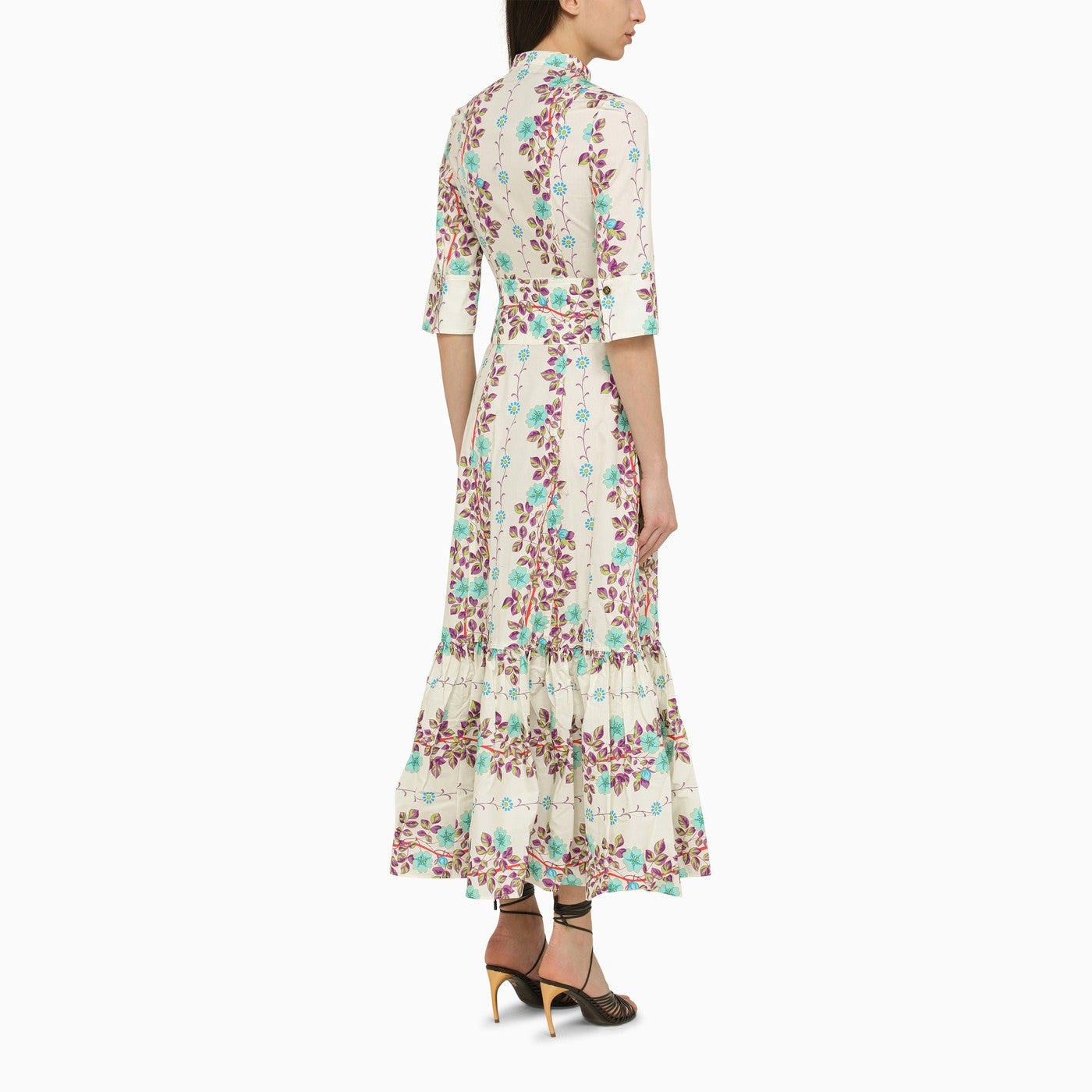 Weißes Baumwoll-Etro-Kleid mit einem All-Over-Blumendruck, Mandarinkragen, drei Viertelhülsen mit Knopfbefestigung, breiter Rock mit Floune am Saum und normaler Passform.