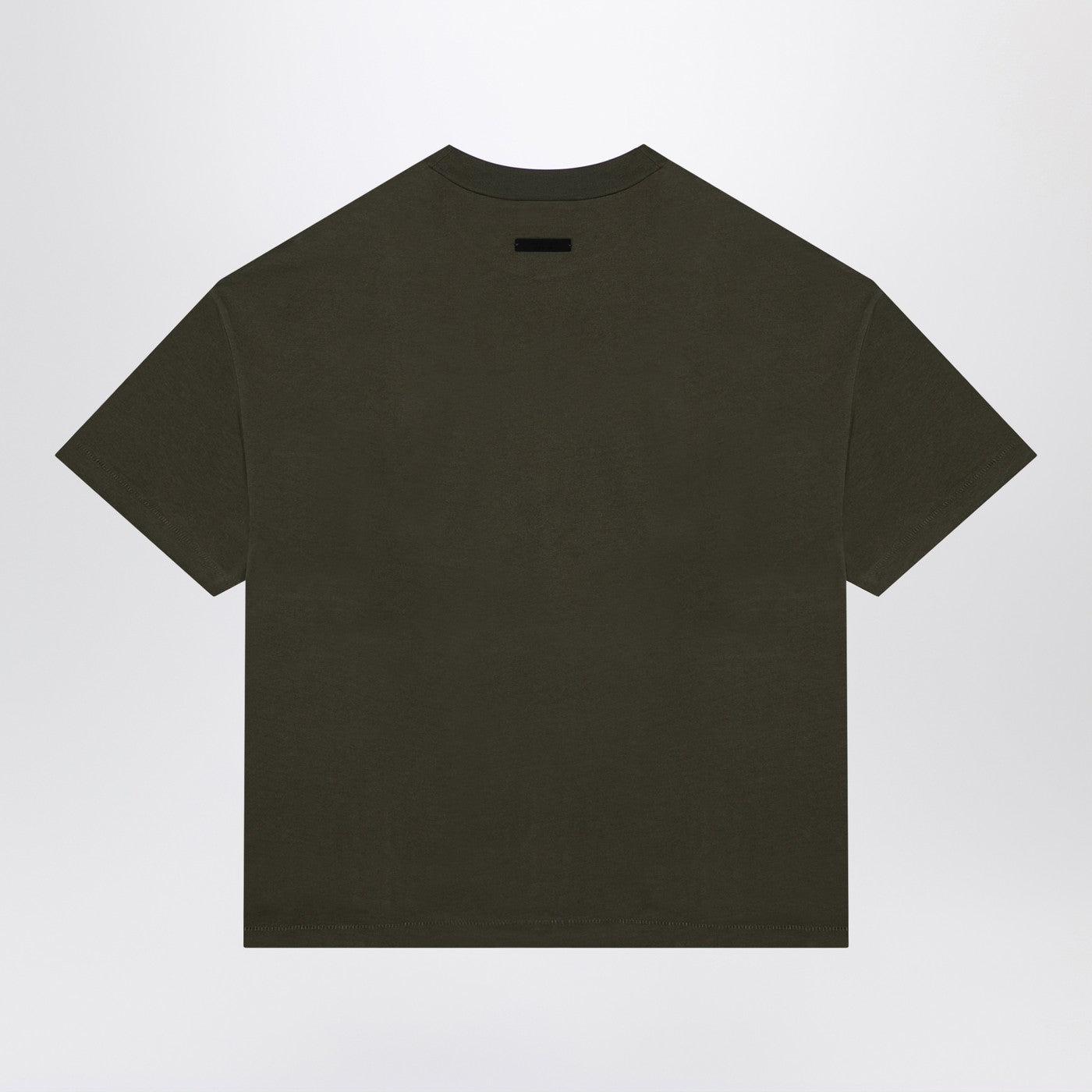 Military green cotton T-shirt from Fear Of God Essentials featuring short sleeves, a contrasting lettering logo print on the front, a ribbed crew neck and a rubberized logo patch on the back.