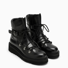 Black leather ankle boot from Ferragamo featuring a round toe, a zip fastening on the inner side and a hiking-style lacing.