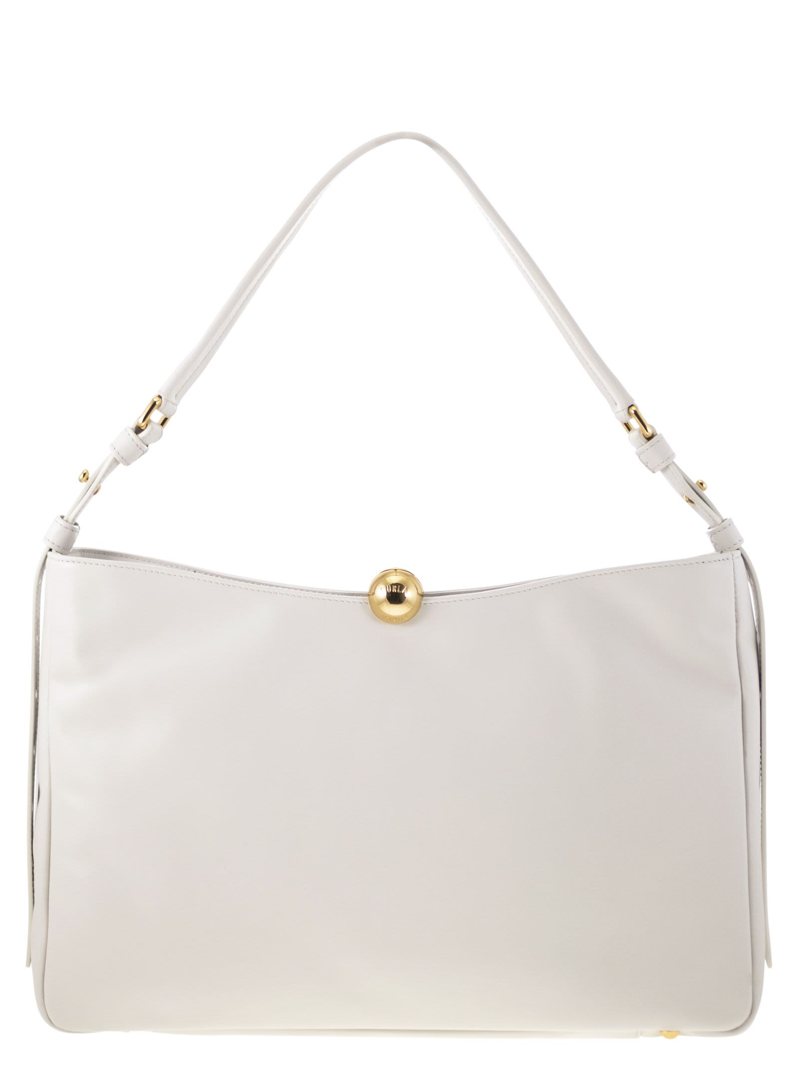Elegant design with a refined allure for the Furla Sfera Soft bag. The light and soft padded smooth nappa leather moulds under the weight of the round Sfera hardware that recreates a natural draping movement. The large size is perfect for storing all your belongings and the flexible structure adapts to shoulder wear. - Two interior open pockets - Inside zipped pocket - Adjustable leather handle - Metal feet - Magnetic button closure DESIGNER ID: WB01365 BX3168 1704S