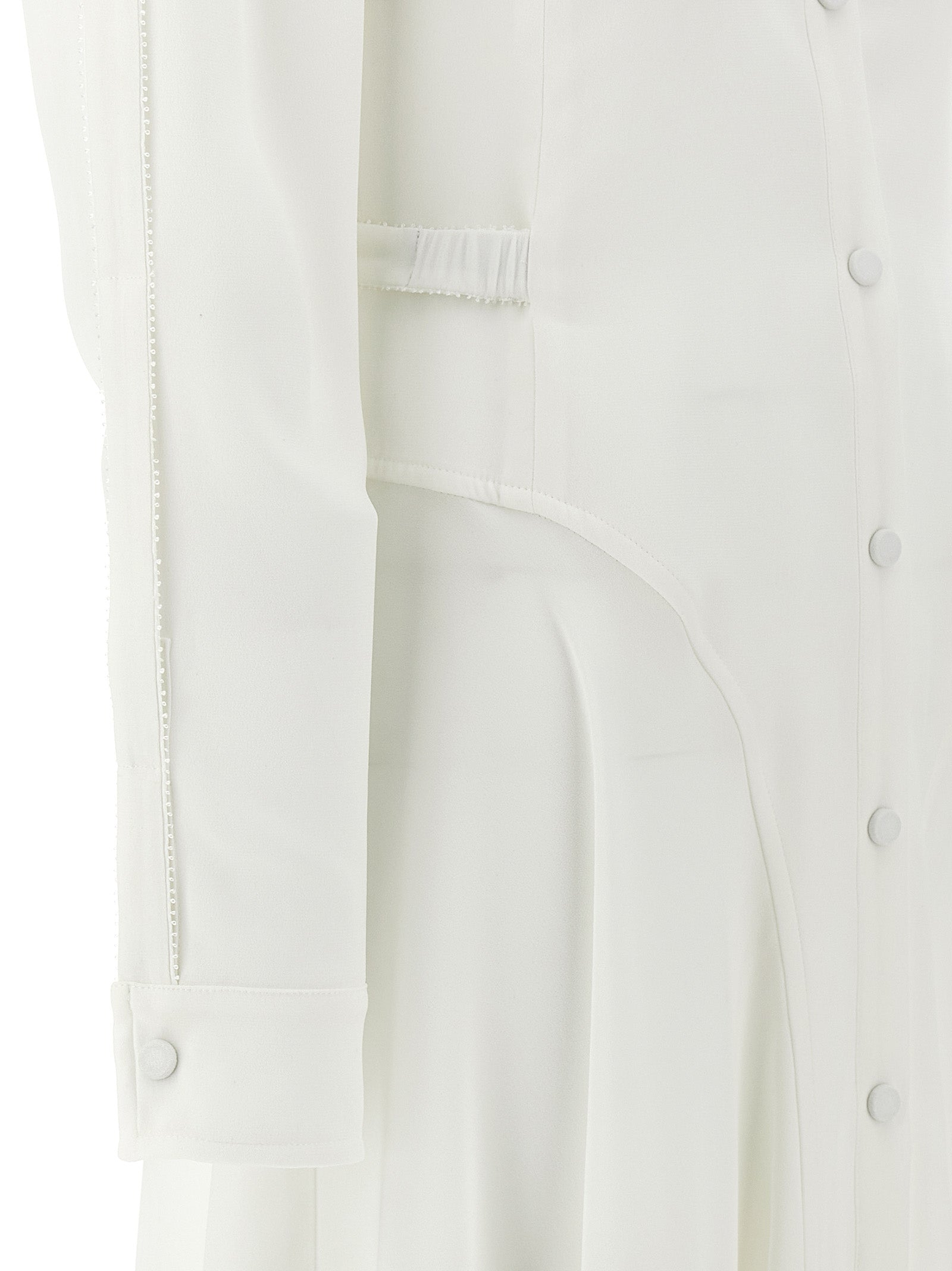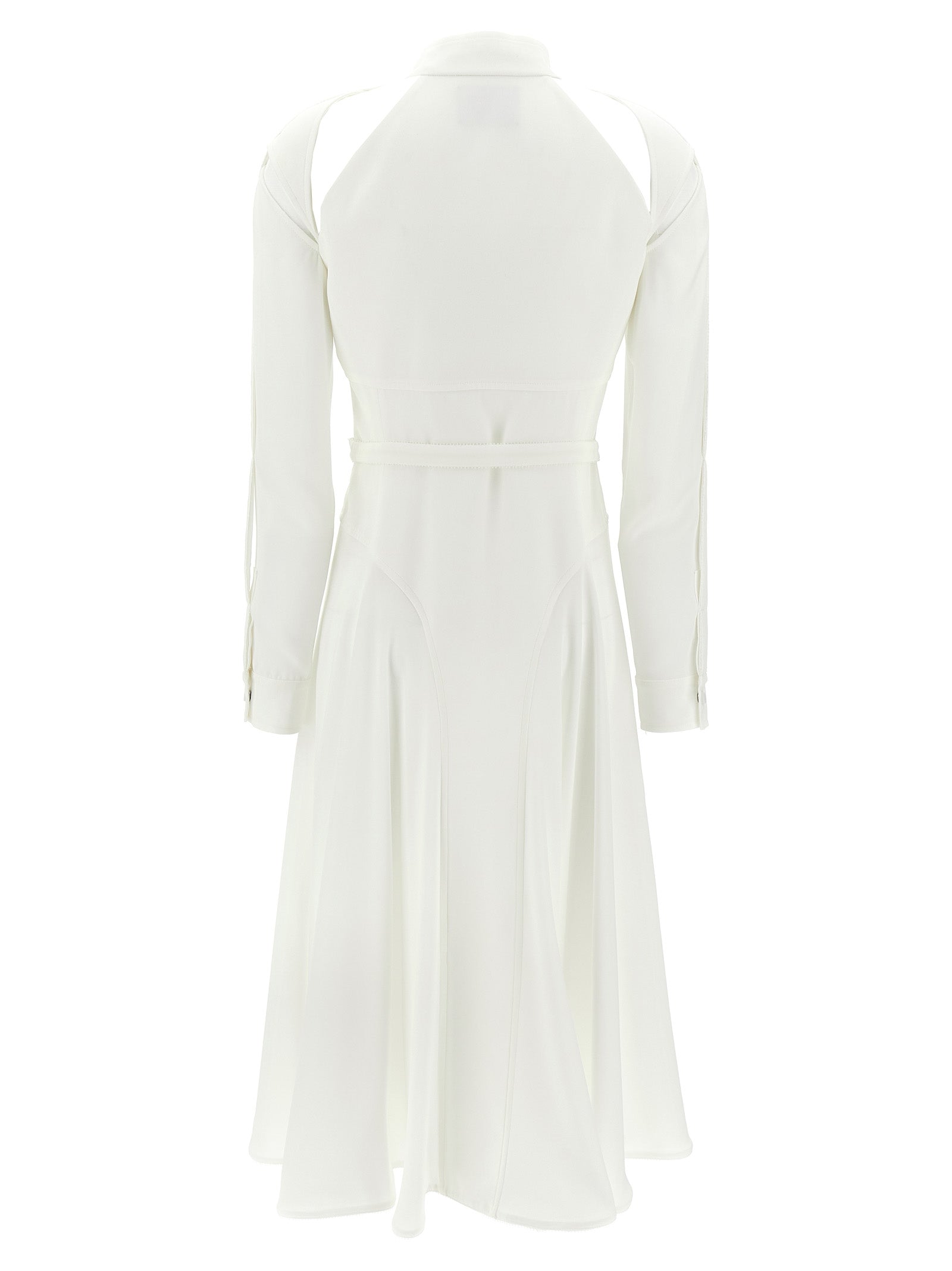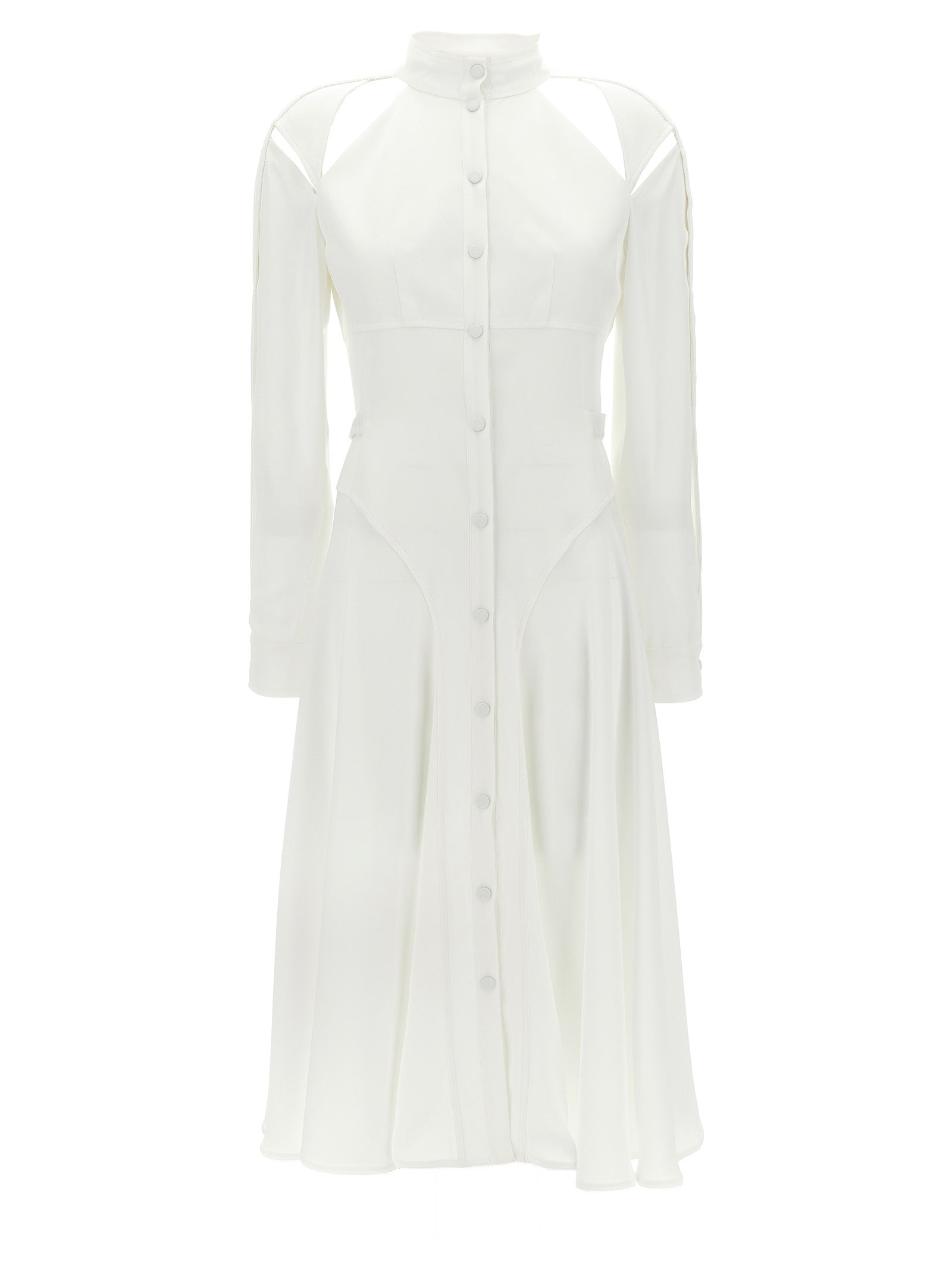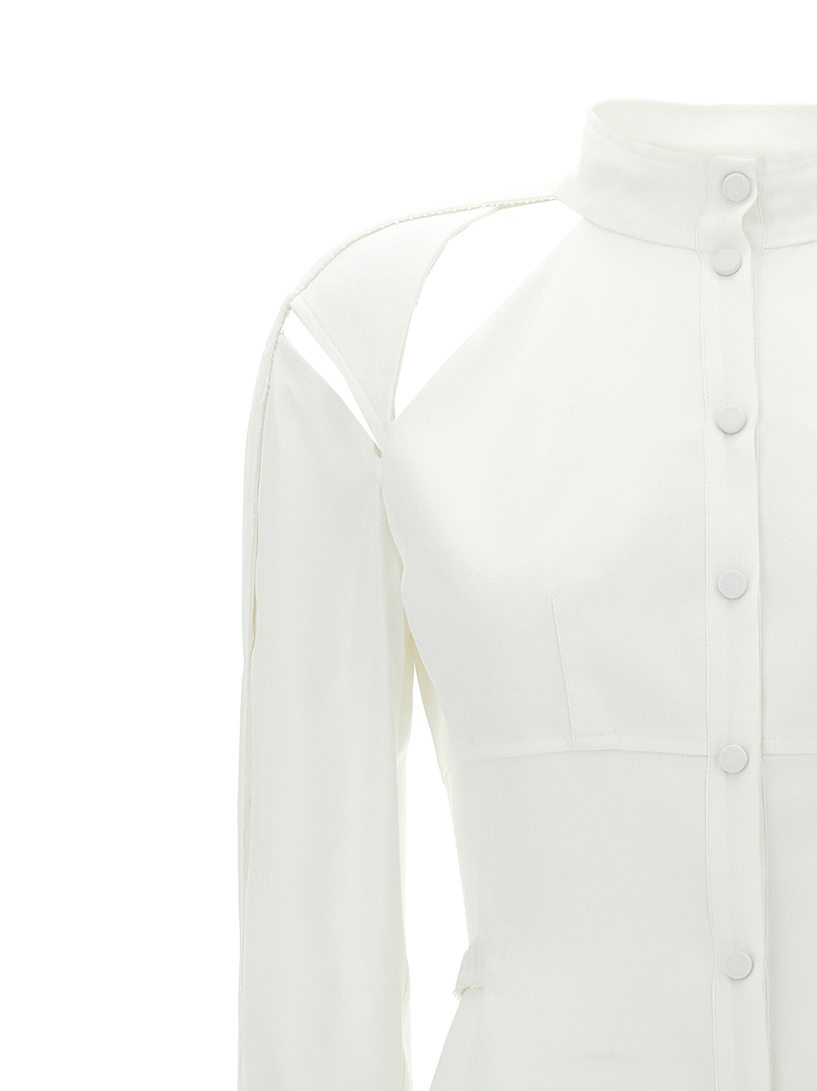 Crepe de Chine Seide Mischhemdkleid, ausgeschnittene Details auf den Schultern, hohen Nacken, Schnappknopfverschluss, applizierende elastische Gürtel, lange Manschettenärmel.