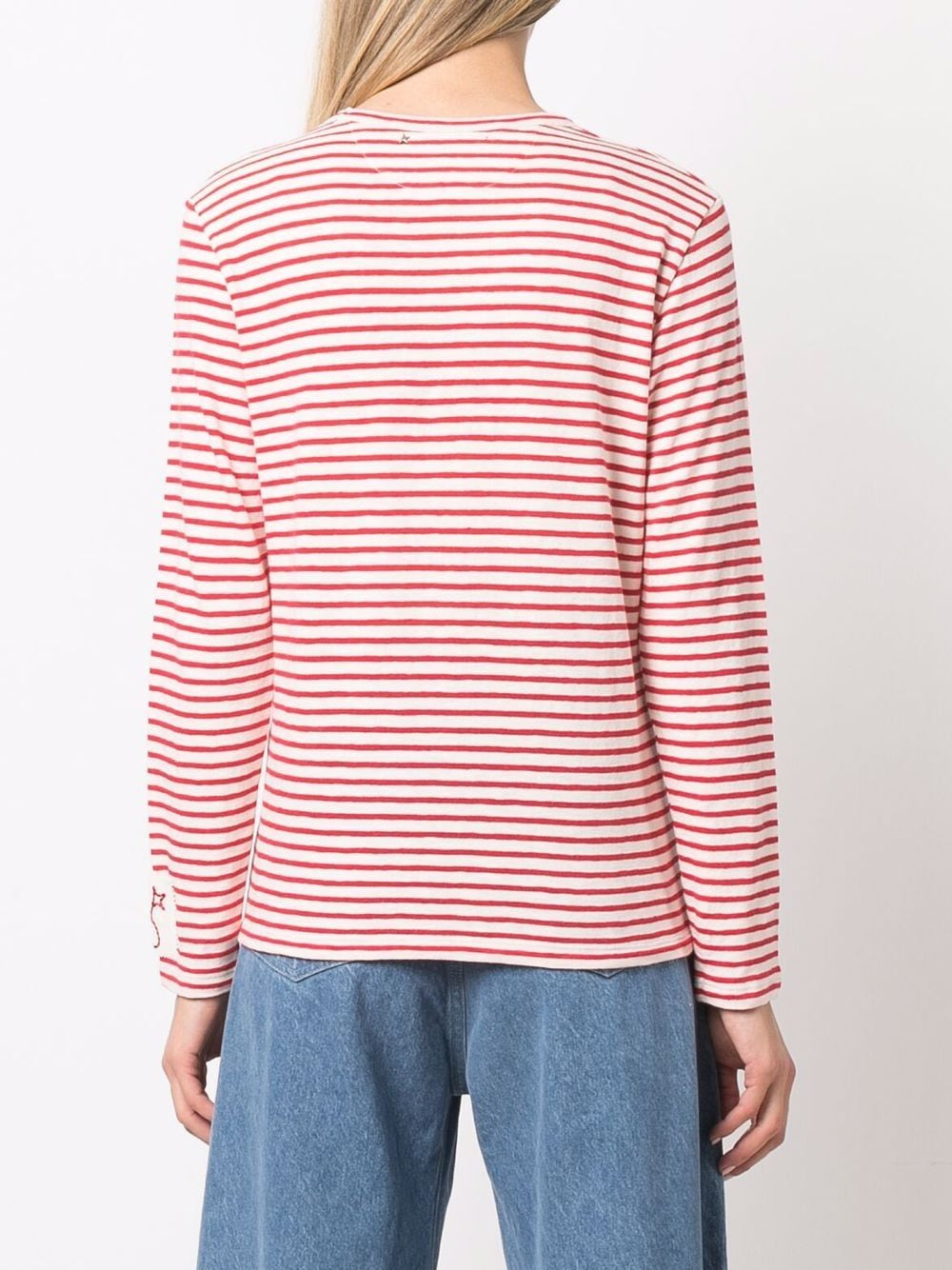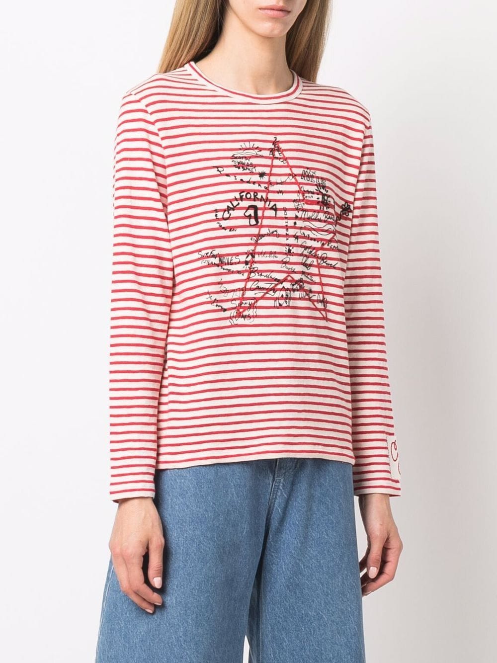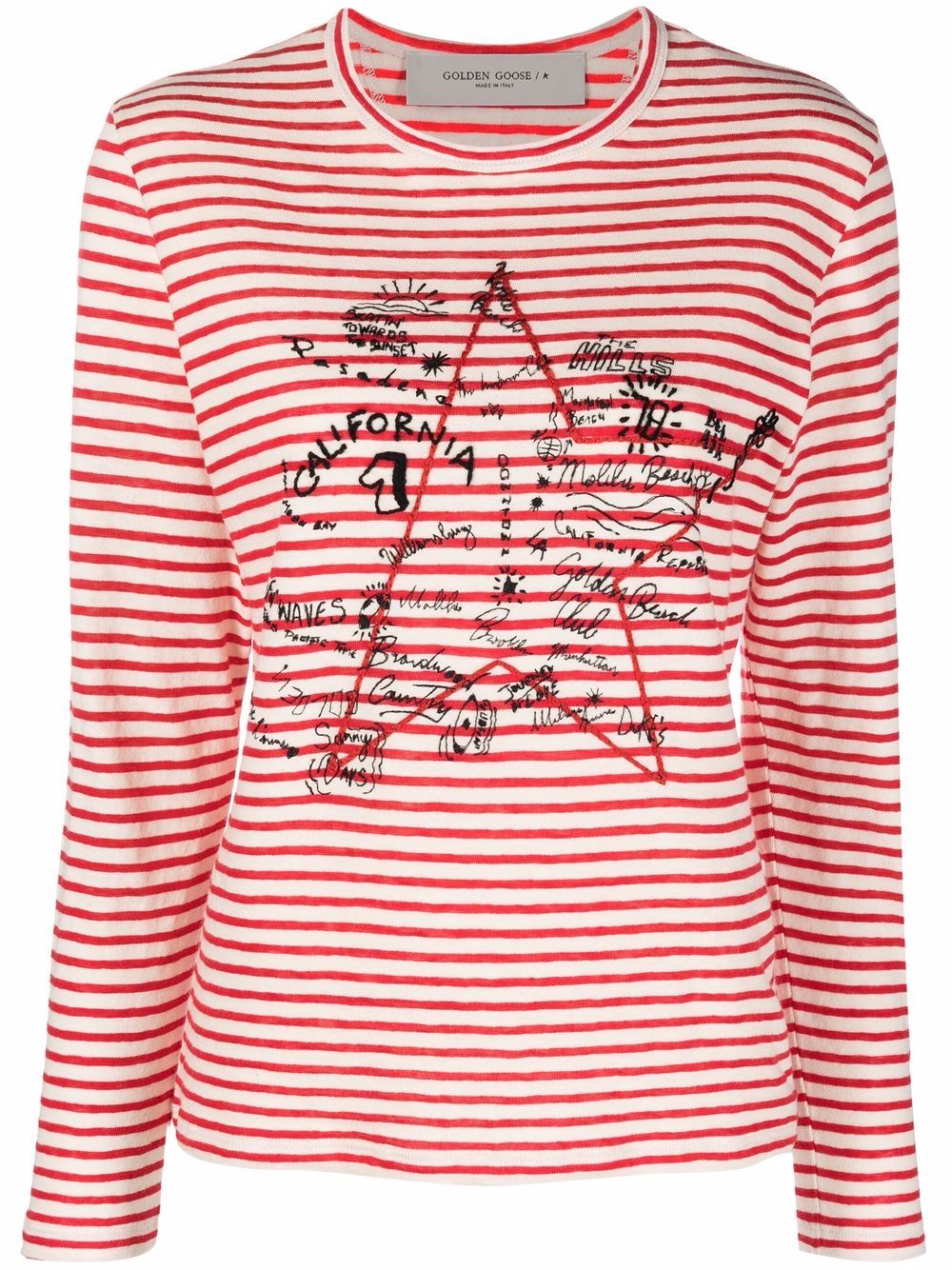 Tiefrot/hellweißes Baumwoll-Linen-Mischungsmischsternstreifen, langärmeliges T-Shirt aus goldener Gans mit Sterndruck, horizontalem Streifenmuster, rundem Hals, langen Ärmeln und gerade Saum.