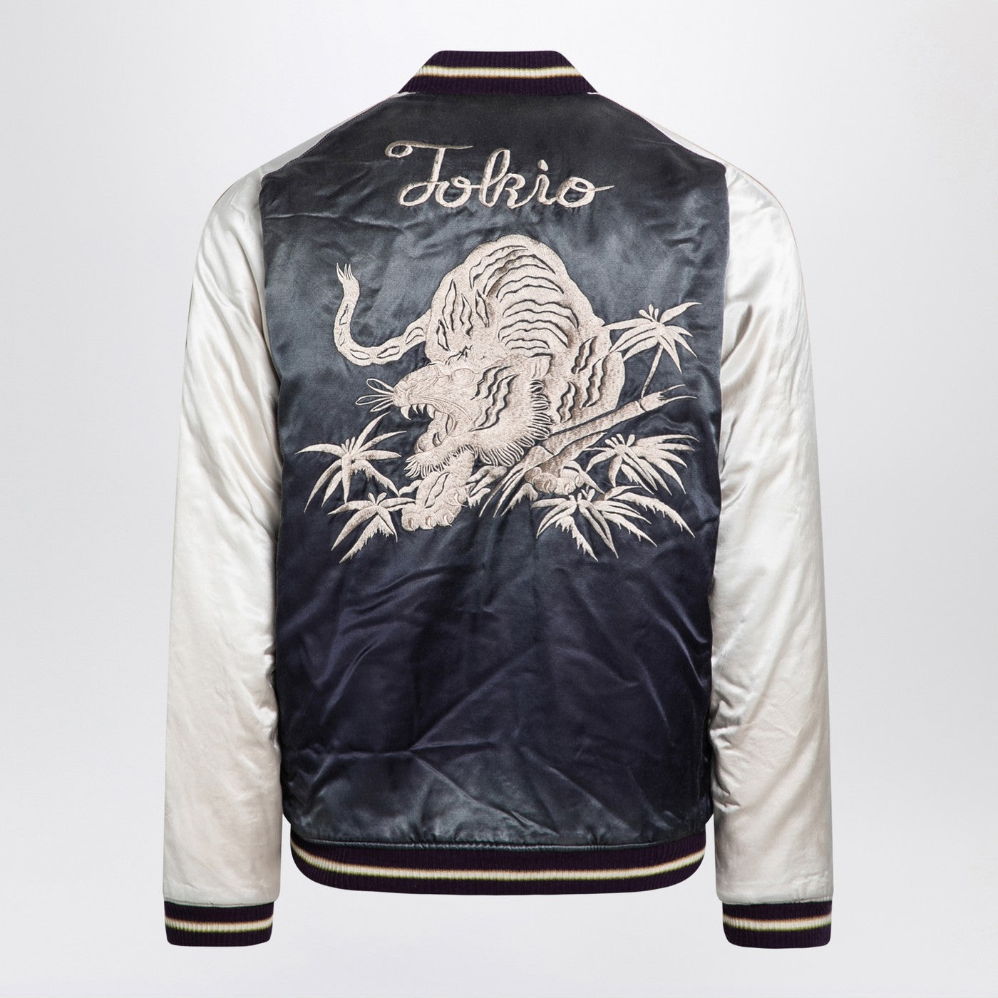 Baumwoll- und Rayon -Bomberjacke von Maison Mihara Yasuhiro in lila Schatten mit einem vorderen Reißverschluss, gerippten Strickkanten, zwei Kettentaschen, Logo -Patch vorne und Kragen und Stickereien auf Rücken und Brust.