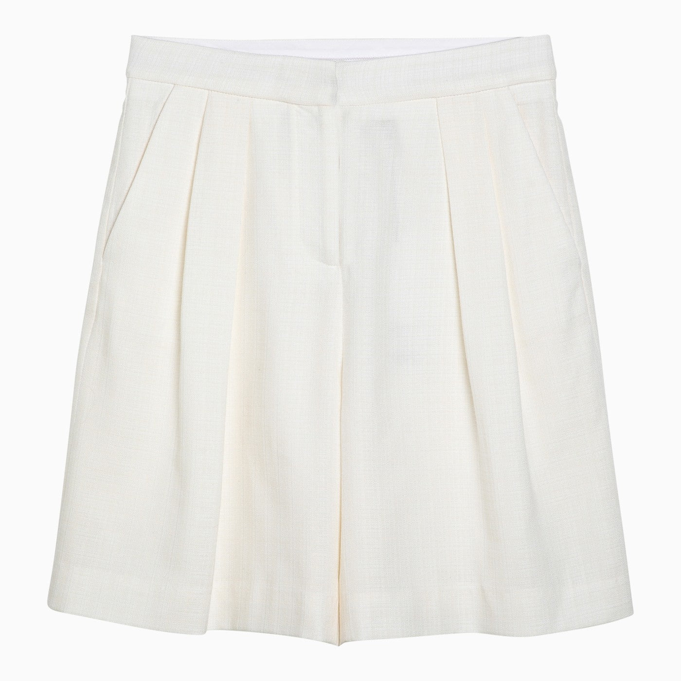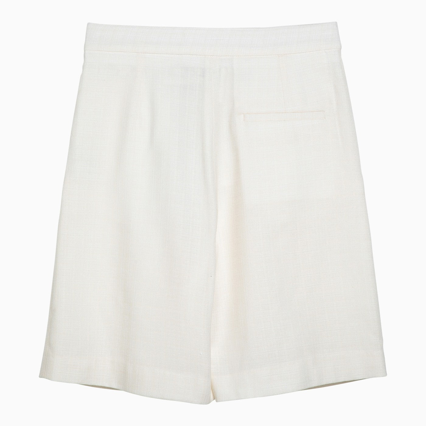 White Woll Blend Bermuda -Shorts von Margaux Lonnberg, mit einer hohen Taille, einem vorderen Reißverschluss und Hakenbefestigungen, zwei Seitenstaschen und einer Rückentasche.