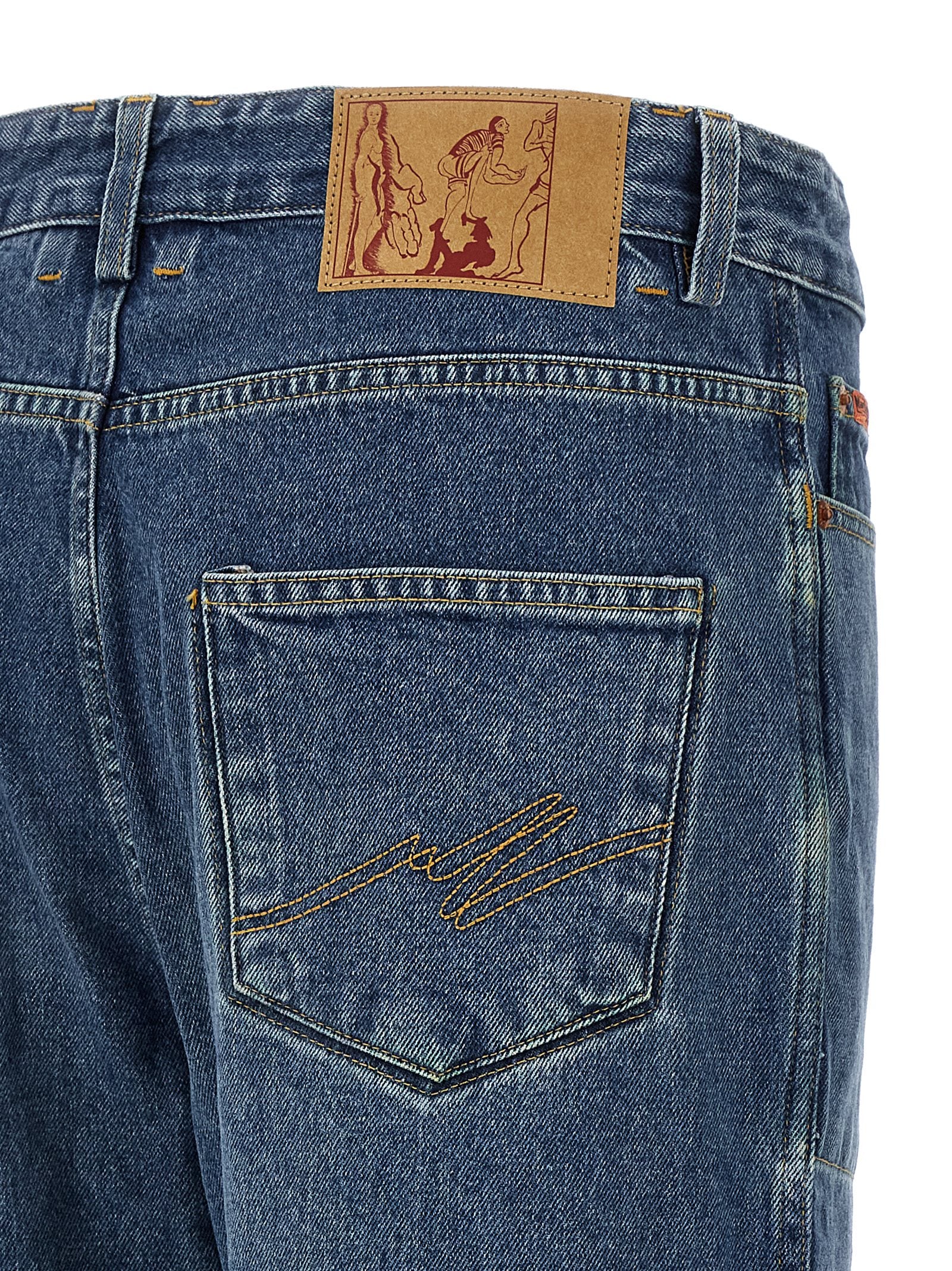 Reversible blaue Bio -Baumwolljeans mit Tarndruck, Kontrastnähten, fünf Taschen, Papierlogo -Tag, Reißverschluss und Knopfverschluss.