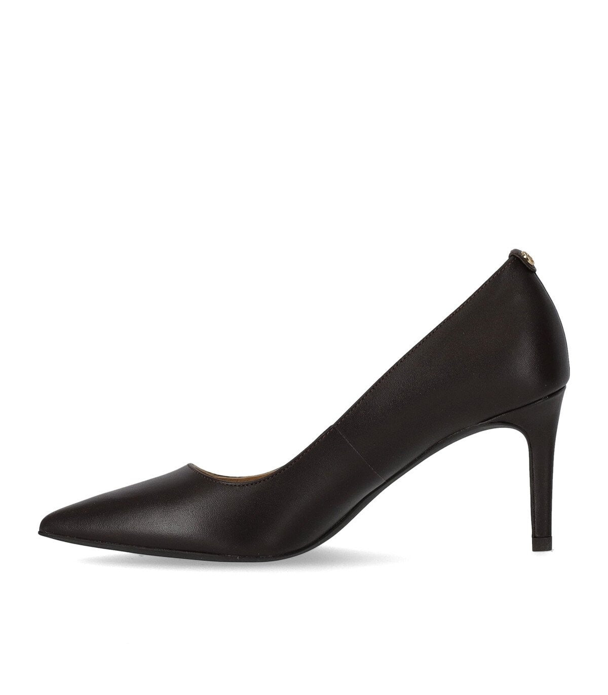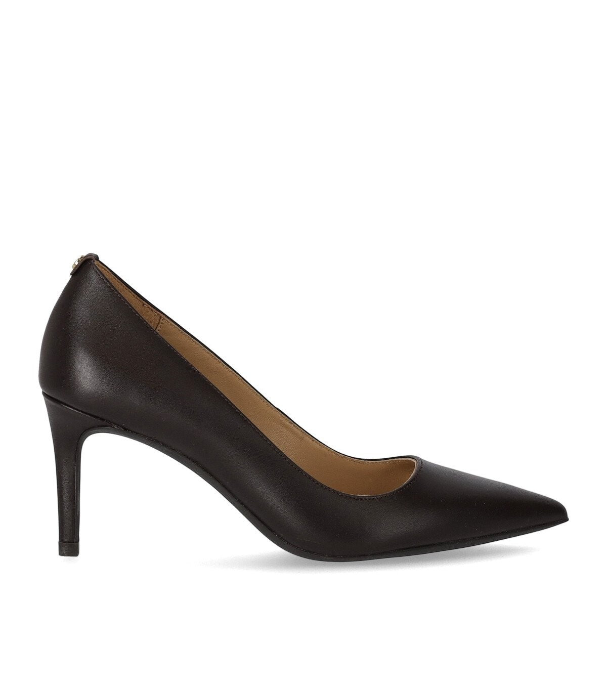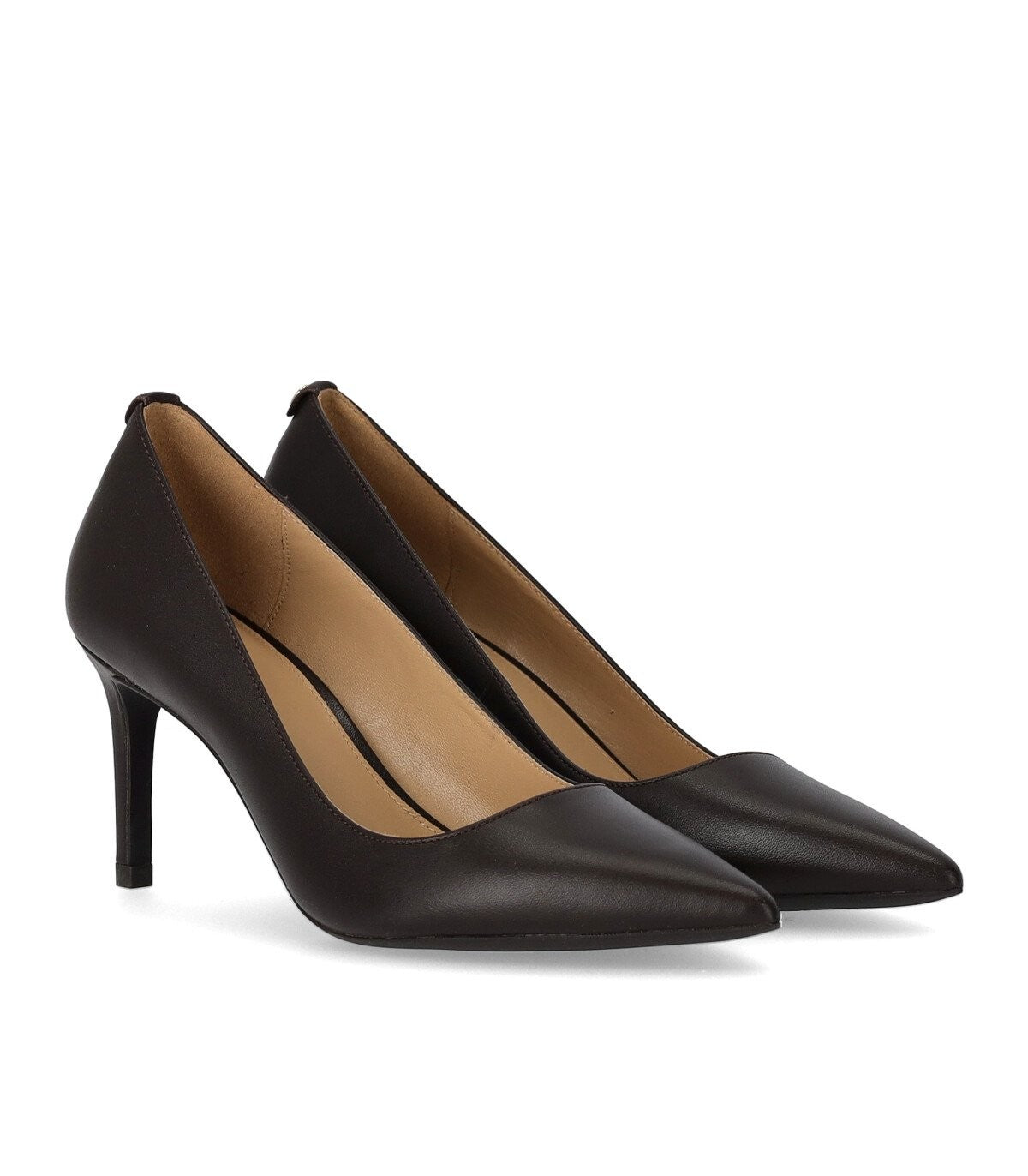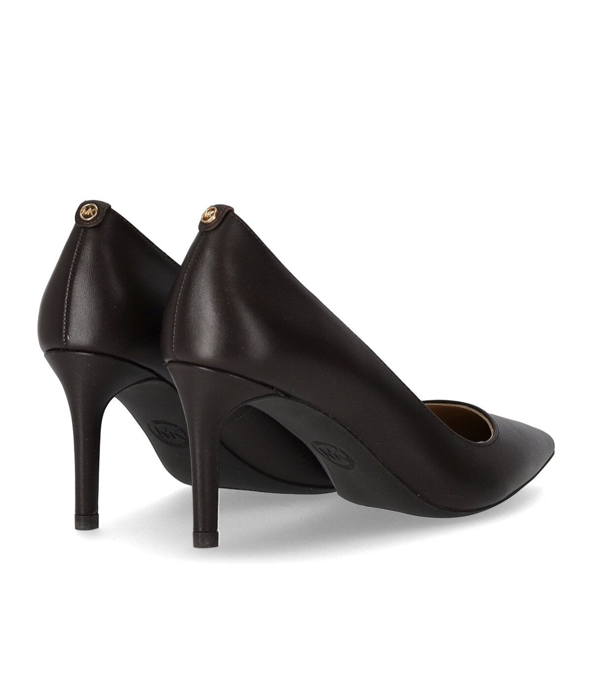 Alina Pumpe von Michael Kors aus braunem Leder mit einem sich verjüngenden Zeh, Lederfutter und einem Detail des MK -Logos auf der Ferse. Gummi -Sohle, Fersenhöhe 7,5 cm.