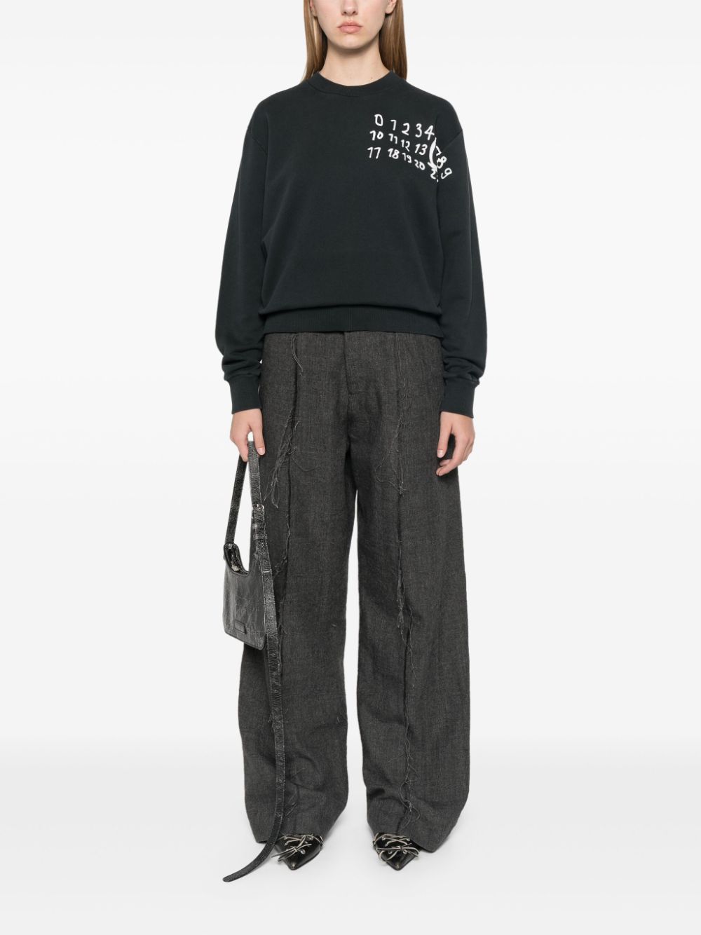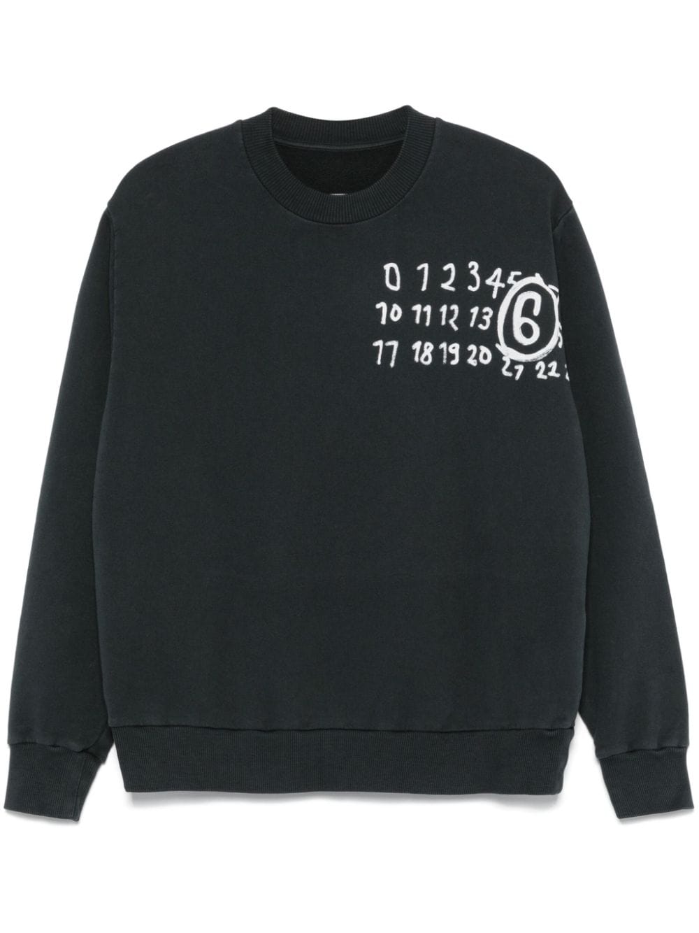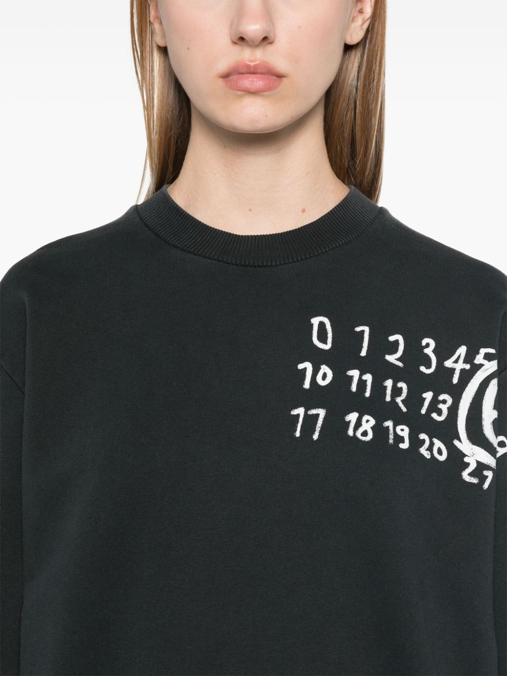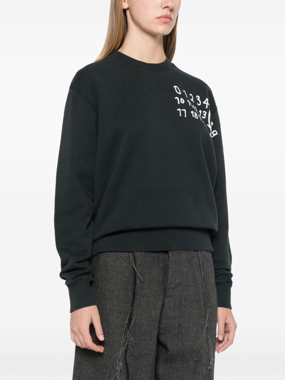 schwarze Baumwolltrikot -Textur Signaturen Zahlen Motiv Crew Hals Langarmer gerippte Manschetten und Saum