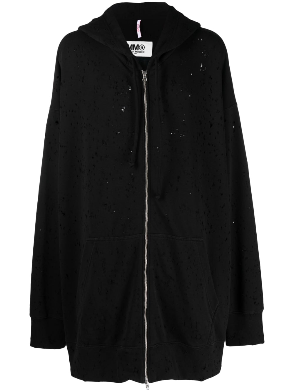 Übergroße perforierte Kapuzenjacke von MM6 Maison Margiela mit schwarzer, Baumwollmischung, perforiertem Design, übergroßem Rahmen, Front -Reißverschluss, klassischer Motorhaube, zwei Taschen vor den Beuteln, langen Ärmeln, elastischen Manschetten und einem geraden Saum.