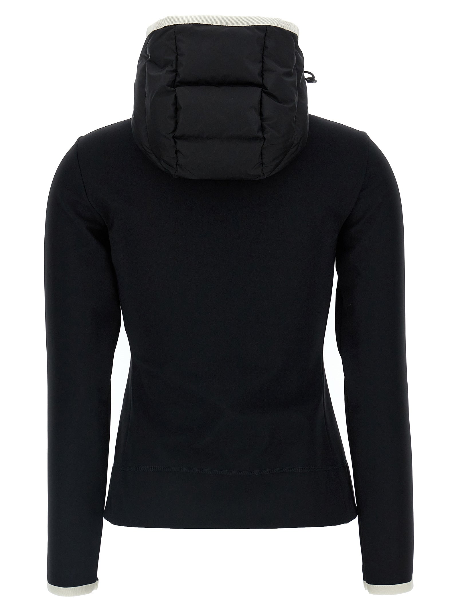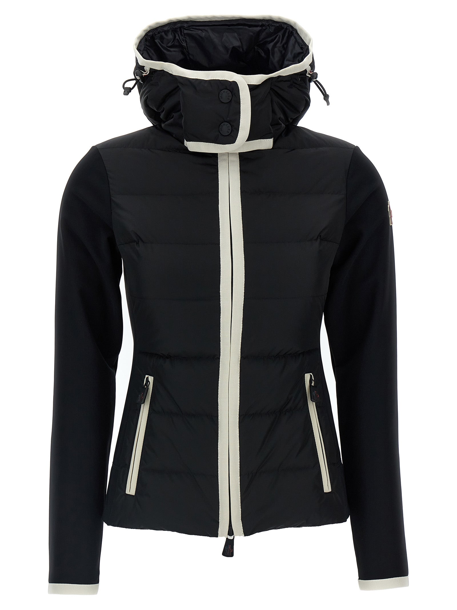 Two-material hooded jacket in technical fabric and quilted nylon, down padding, zip closure, pockets, long sleeves.