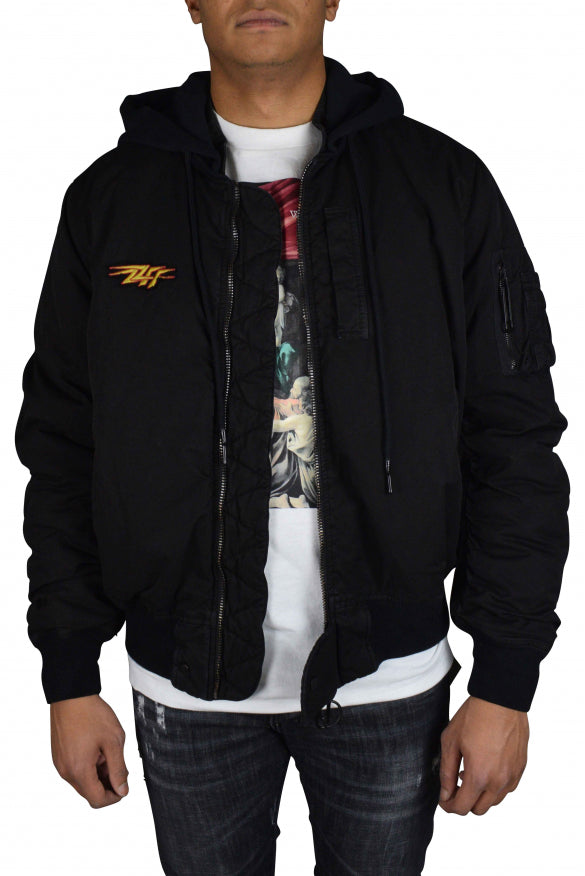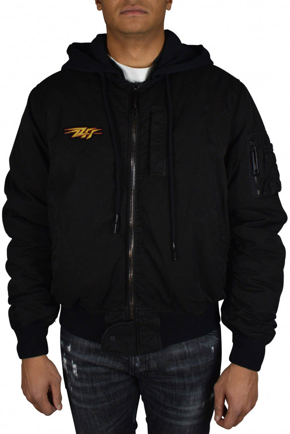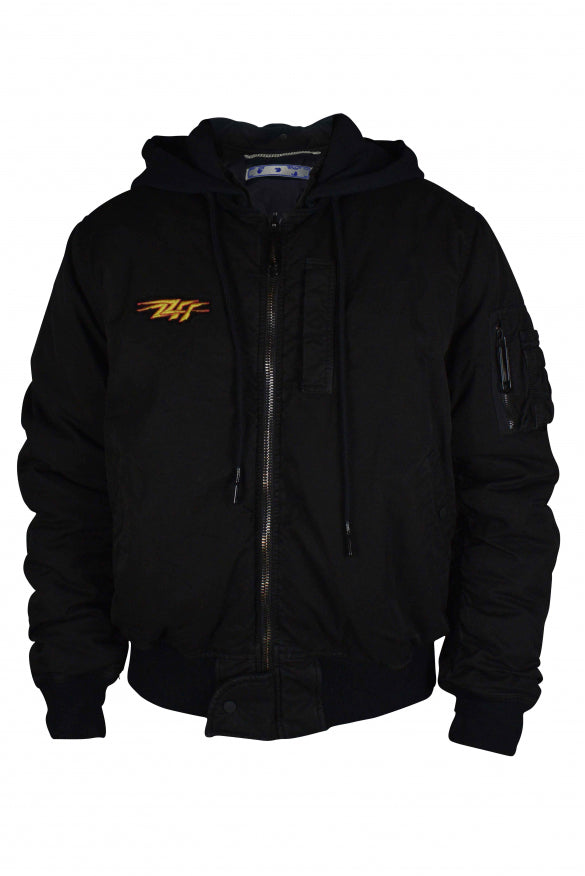 Schwarzer, off-weißer Bomber mit Motorhaube.
