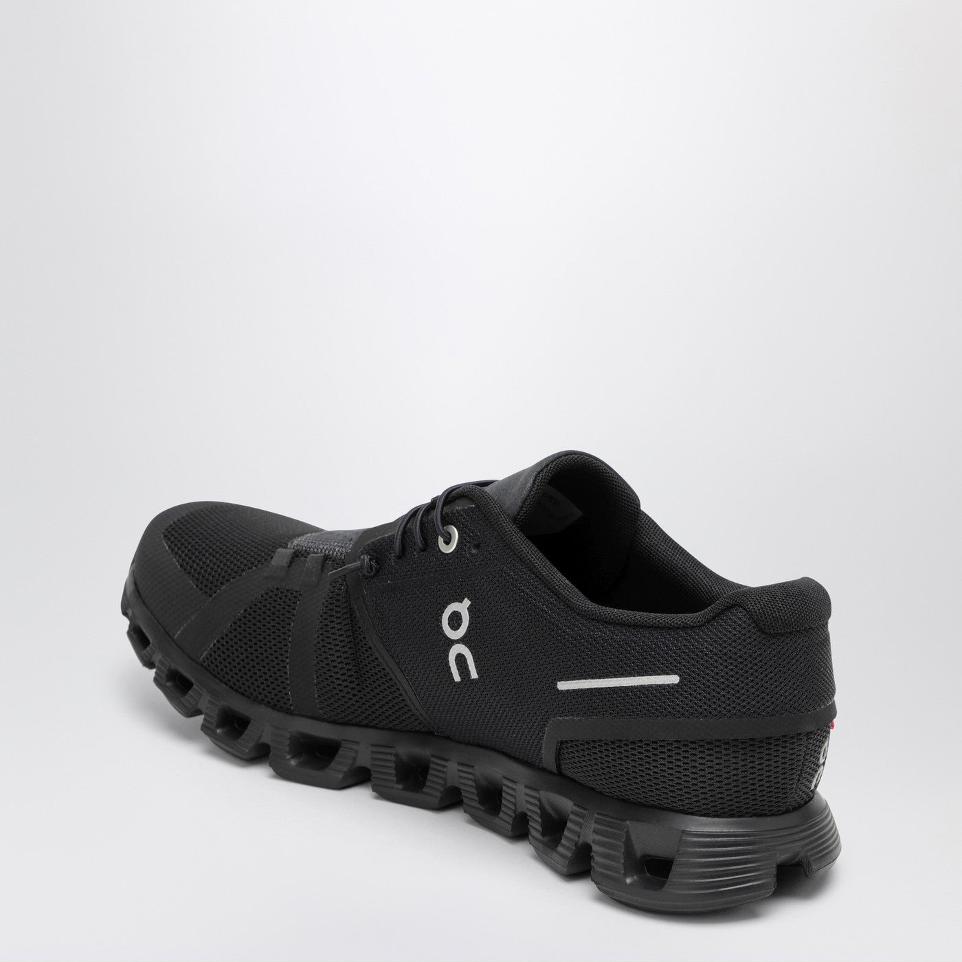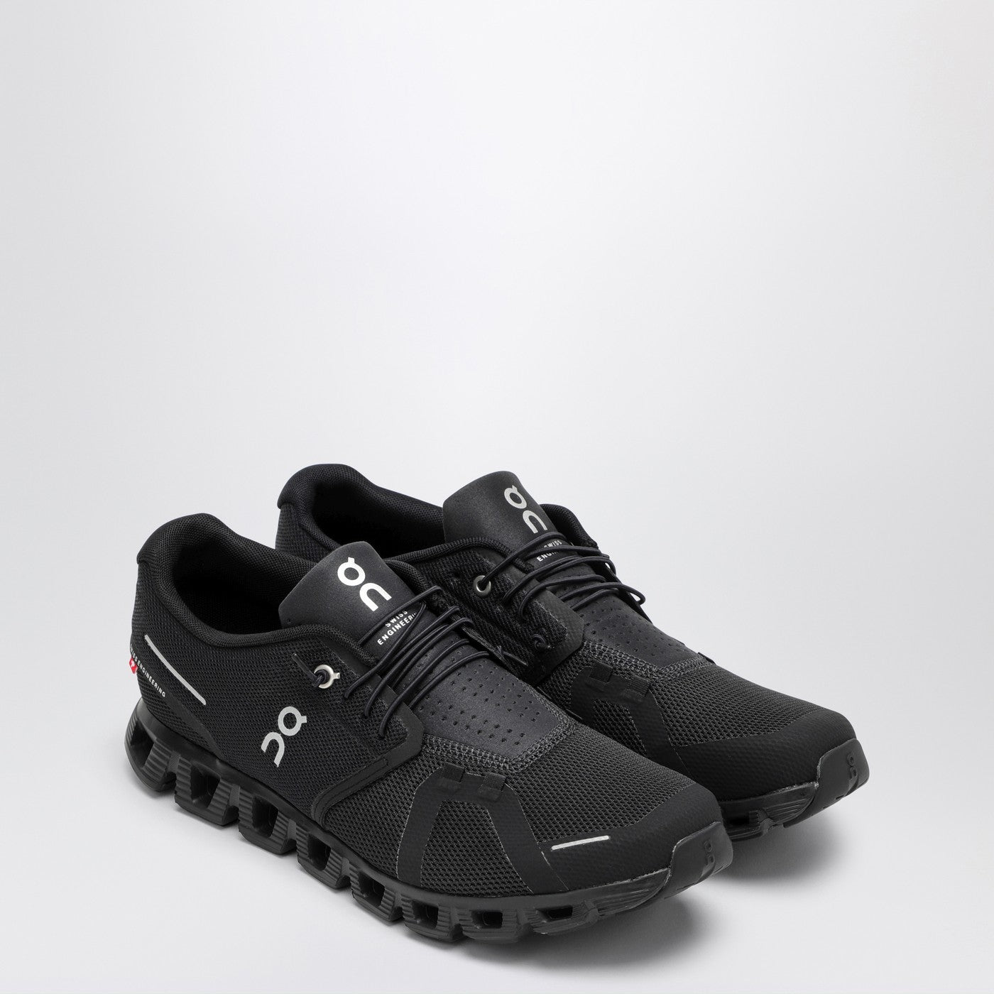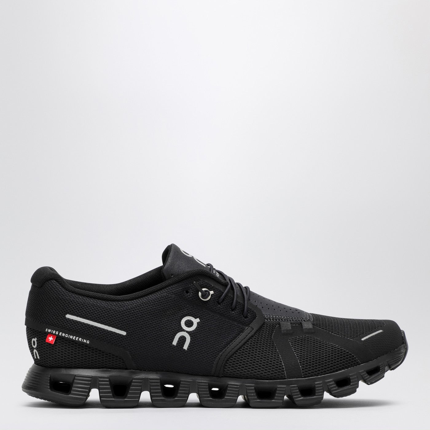 Schwarzer Stoff-Top-Trainer von Features ON Features, ein runder Zeh, Schnürfalben, gepolsterte Zunge und Knöchelgurt, bestickliches Logo auf Seite und Zunge und ikonische perforierte Gummi-Sohle.