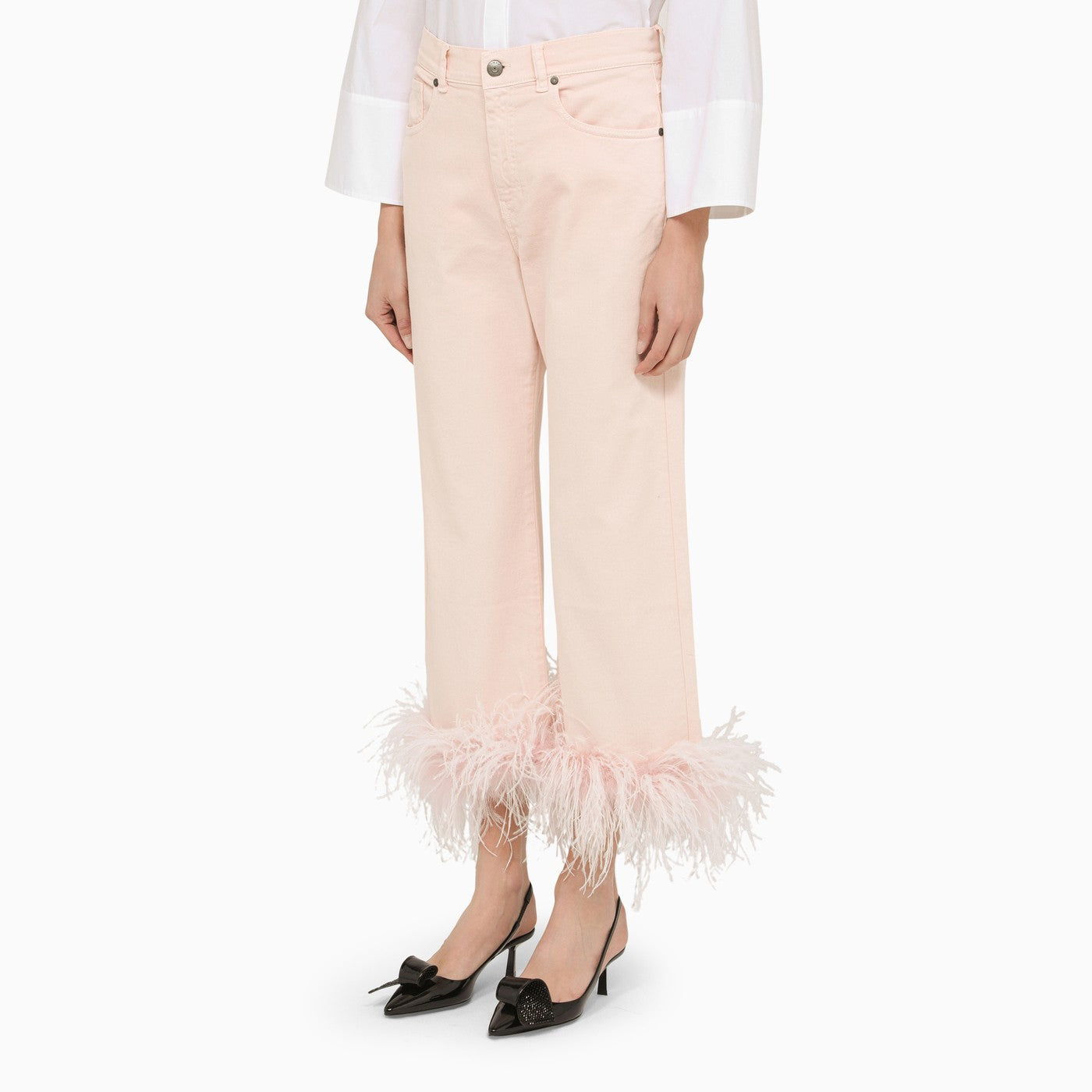 Pfirsichfarbene Baumwoll-Jeanshosen von P.A.R.O.S.H. Mit Gürtelschlaufen, einem vorderen Reißverschluss und Knopfbefestigung, einem Fünf -Taschen -Design, einem Logo -Etikett auf der Rückseite und dekorativen gefiederten Beinböden.