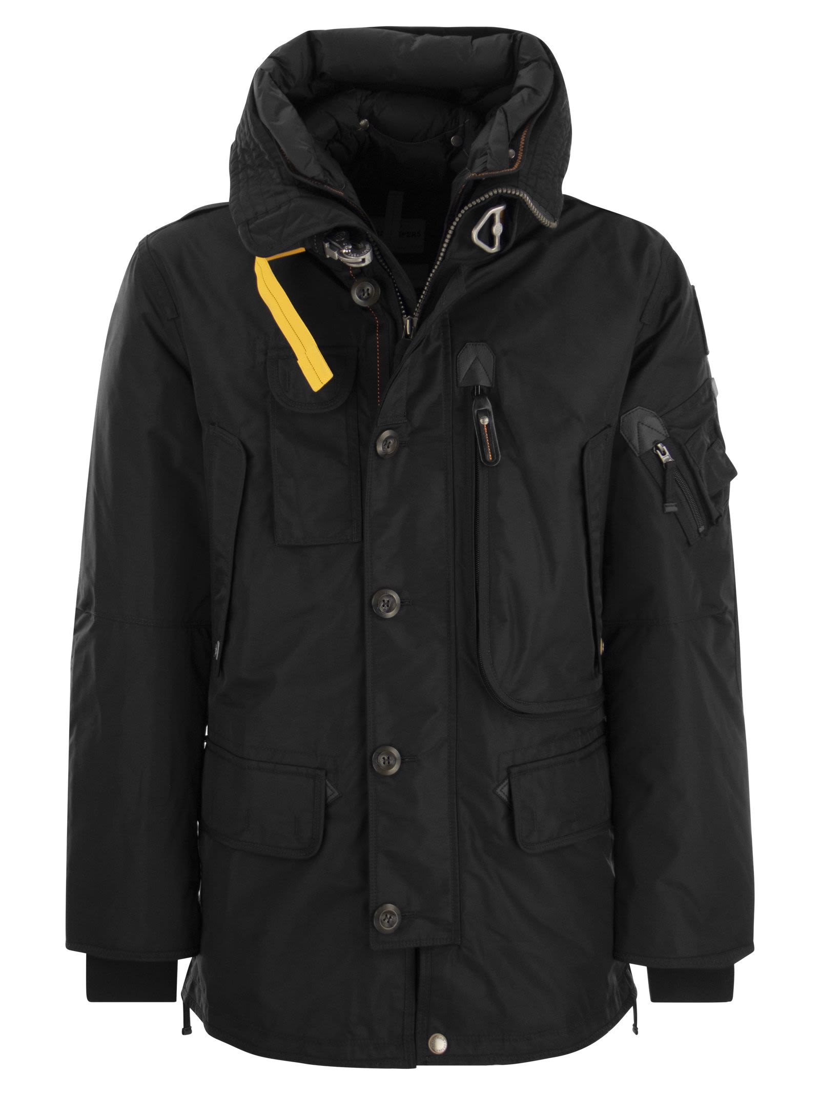 Die Kodiak-Jacke ist ein Favorit mit mehreren Taschen für ein städtisches und praktisches Design. Mit ikonischen Parajumperndetails wie der Ladungstasche und dem gelben elastischen Gurtband mit Haken, inspiriert von dem von Fallschirmjägern verwendeten. .