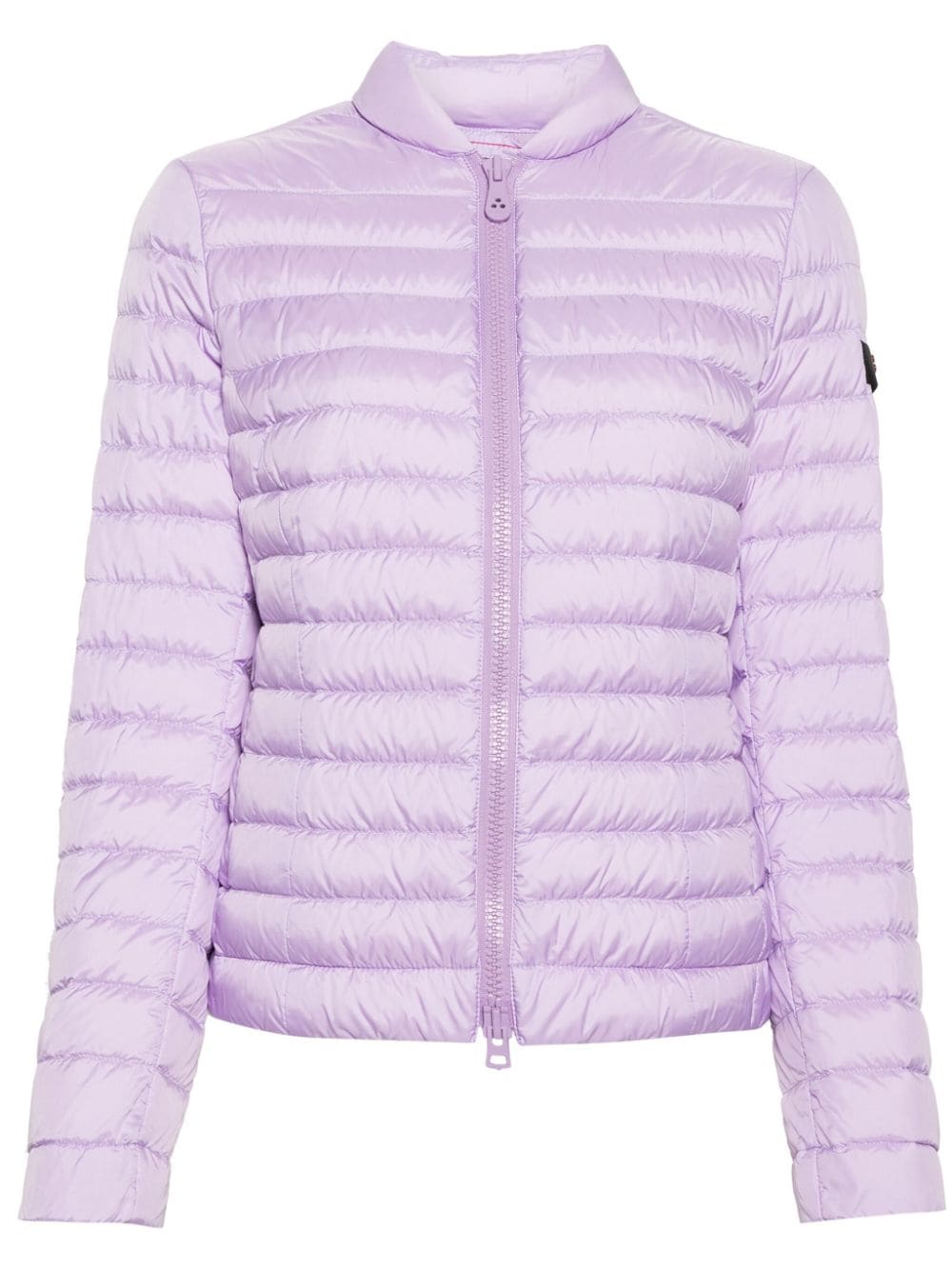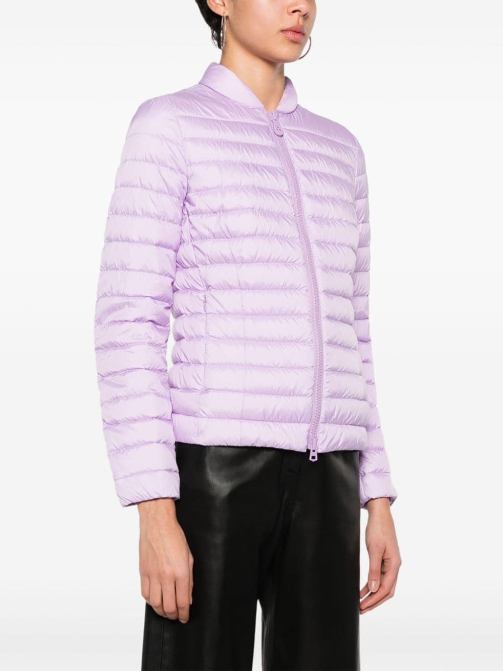 Lila Purple Shell gepolsterte Design Gans Down Bandkragen Langarm Logo-Patch an den ärblichen elastischen Manschetten Zwei-Seiten-Reißverschluss-Taschen Gerade Saum vordere Zwei-Wege-Reißverschluss