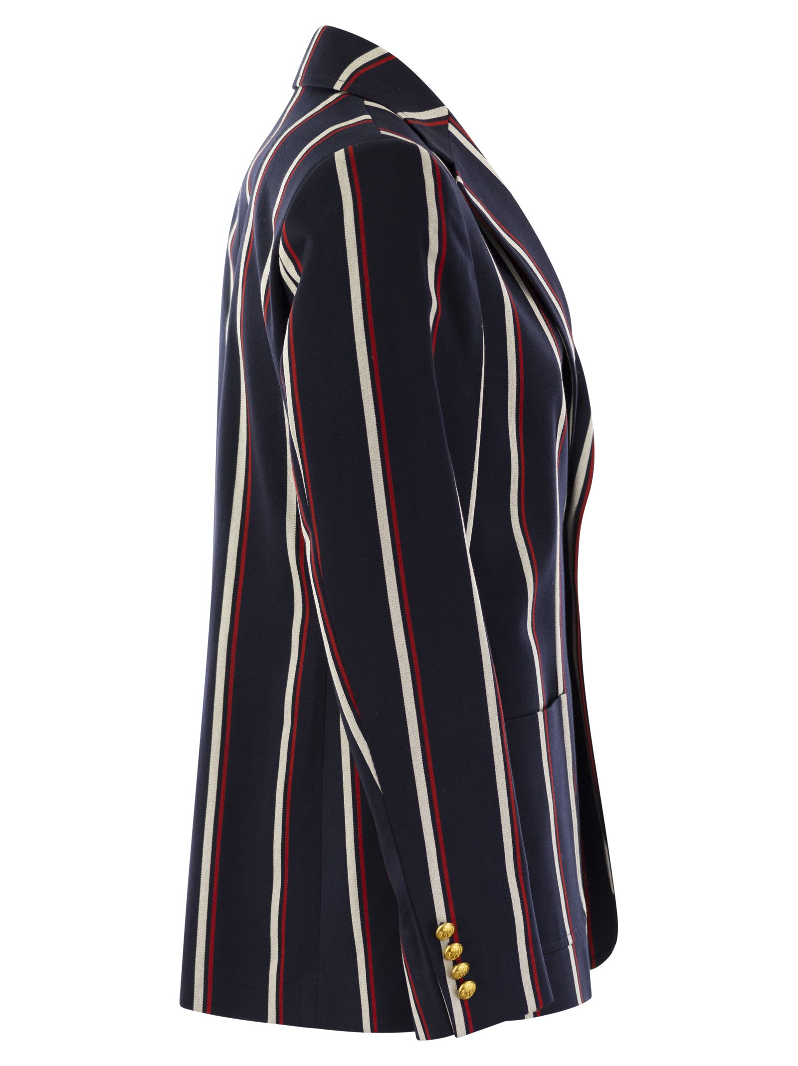 Dieser in Portugal hergestellte Wolle und Baumwollblazer verkörpert den Charme der Côte d'Azur mit mit Garn gefärbten vertikalen Streifen und einem gestickten Wappen und gekreuzten Ruderleiter. - Gekerbte Revers - Knopfloch am linken Lappel - Zwei -Knopf -Verschluss - Metallknöpfe - Lange Ärmel mit vier Knöpfen an Manschetten - gepolsterte Elektroschetten - Patchtasche auf der linken Brust - zwei Patch -Taschen an der vorderen Taille - Flecken an der vorderen Taille - zentraler Rückennähler - Heckschlitz vollständig ausgekleidet - Appliké mit 'Prl' Crest und gotische Beschriftung, Krone und gekreuzte Ruder, die auf der linken Brustseiten -Designer -ID gestickt sind: 211924784 001