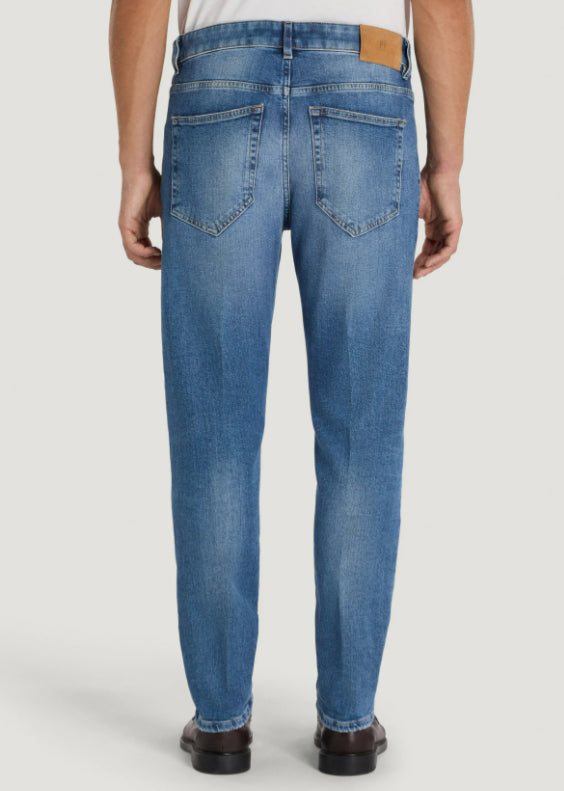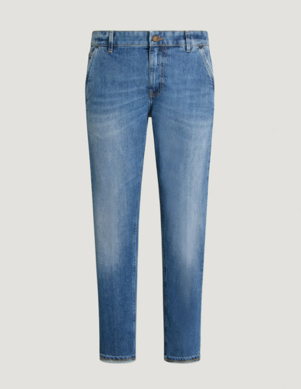 Jeans in Bio -Dehnungsbaumwoll -Denim, ein weiches, leichtes Gewicht (10,5 oz) und bequem zu tragen, mit offensichtlichem Bleichen. Ein Originalmodell mit französischen Taschen, einer geraden Linie und einer gebügelten Falte. Ein maßgeschneiderter Denim, der auch perfekt für besondere Anlässe ist.