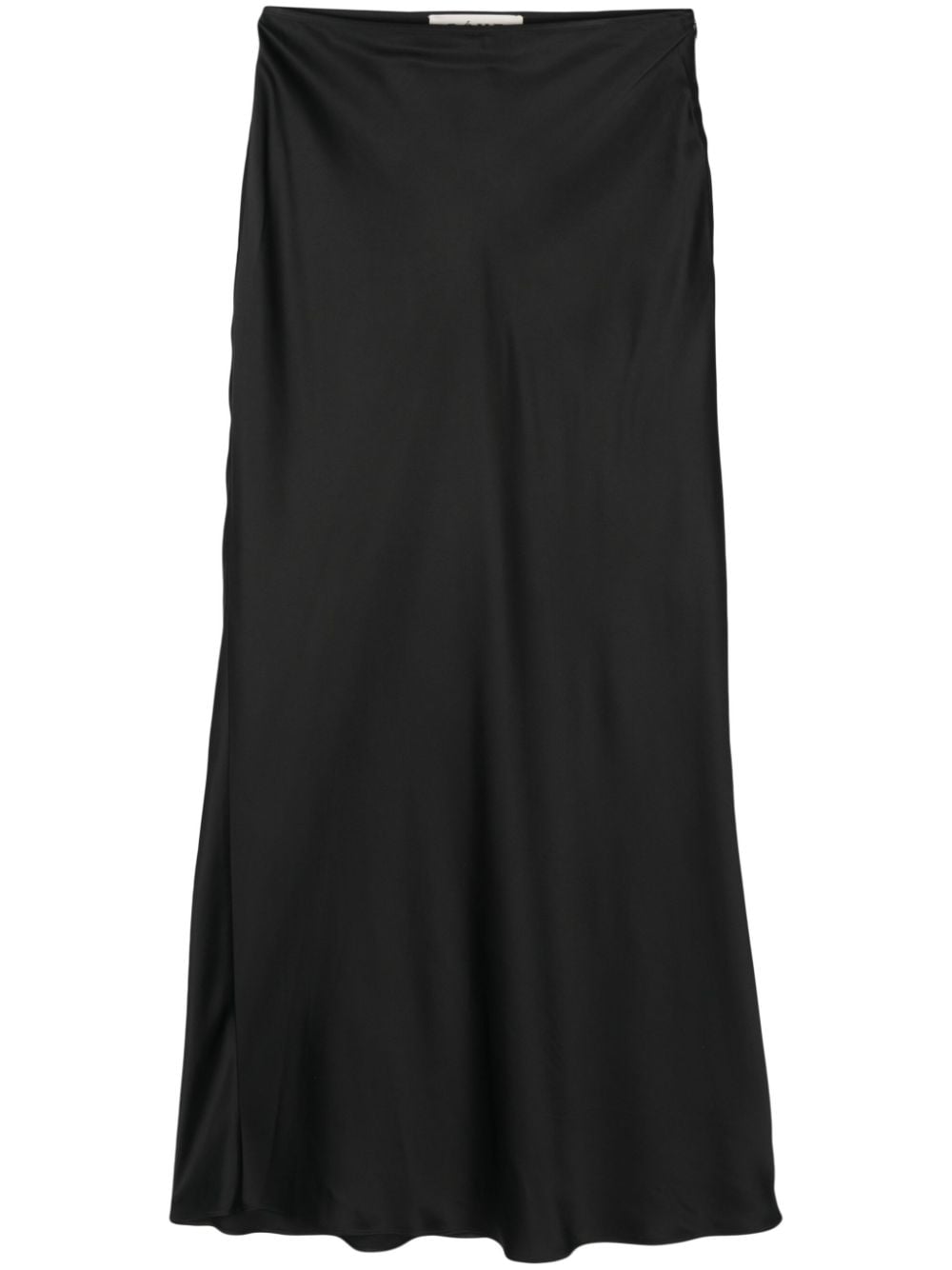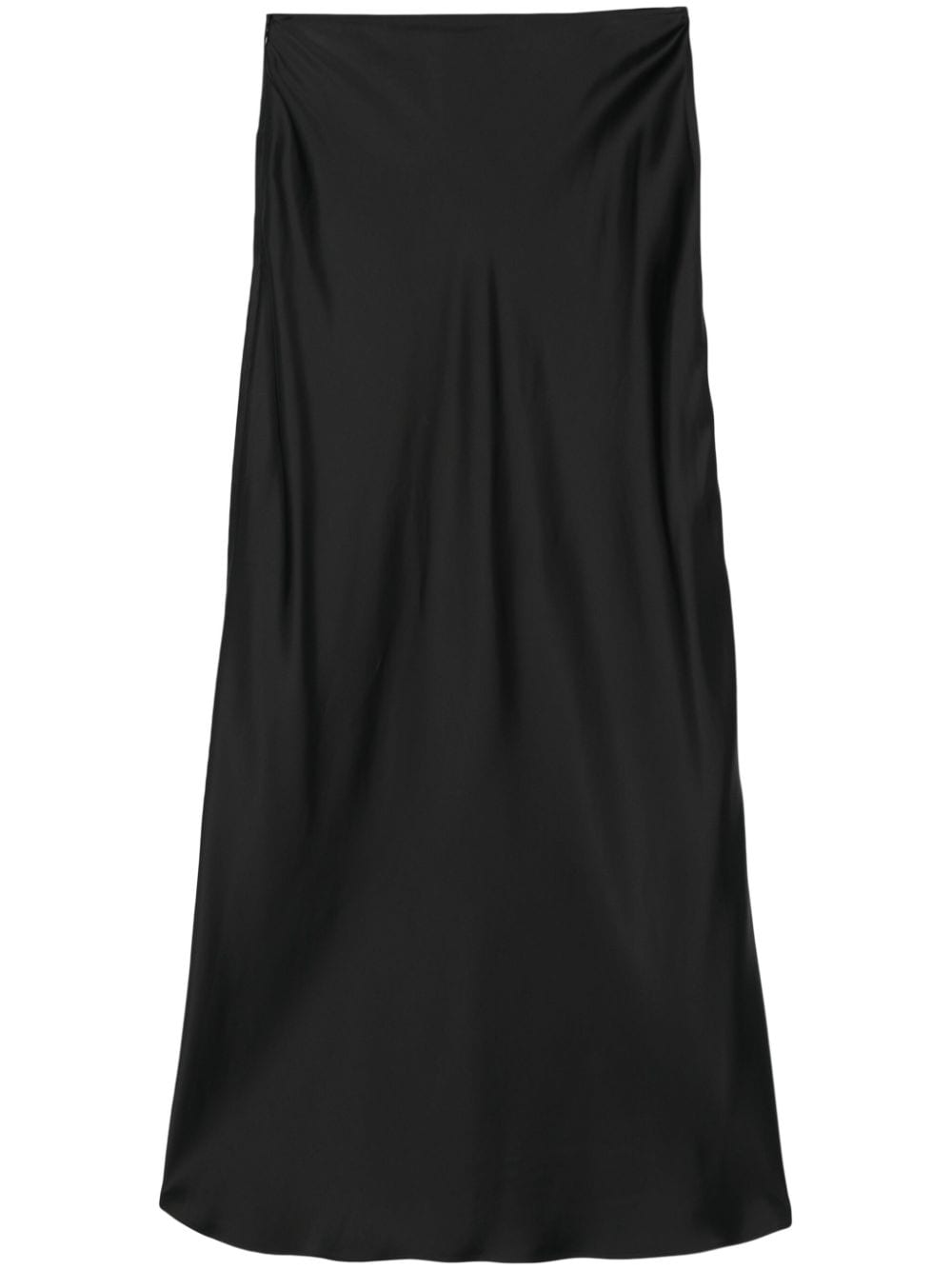 black satin finish bias cut flared full-length unlined straight hem concealed side zip fastening