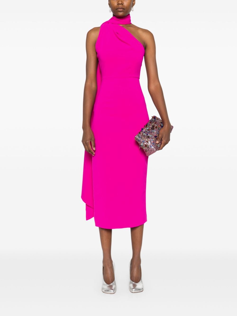 magenta pink crepe texture concealed rear hook and zip fastening one-shoulder attached scarf sash detail sleeveless rear slit partial lining straight hem below-knee length