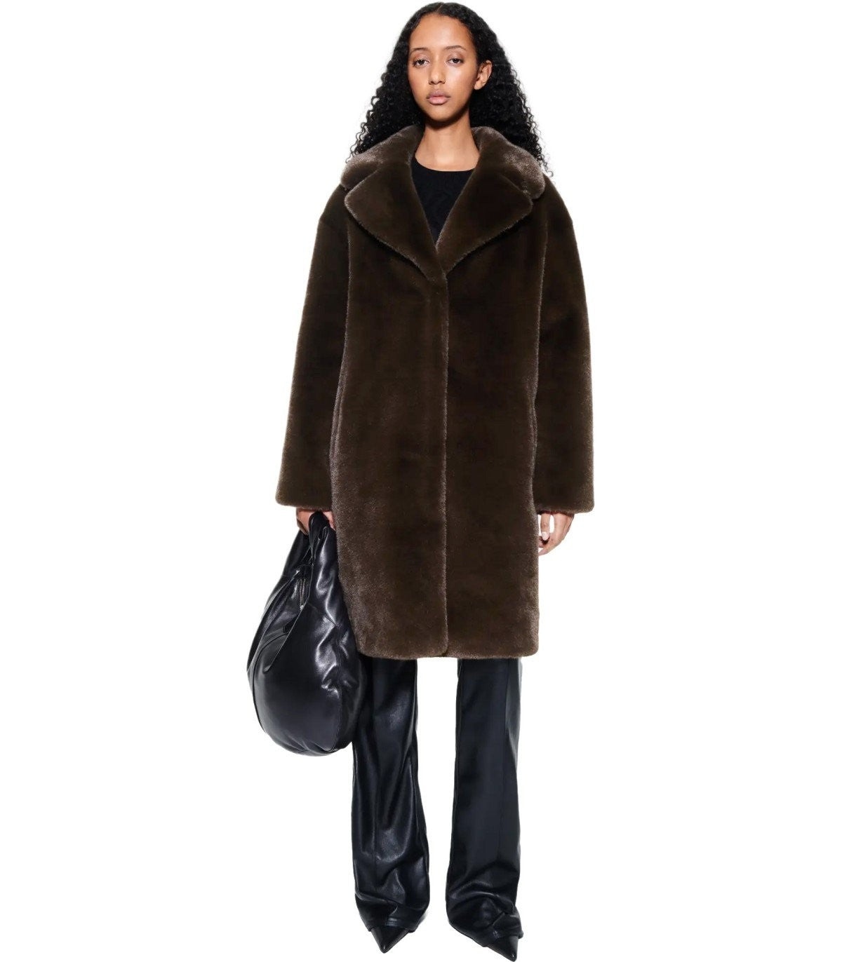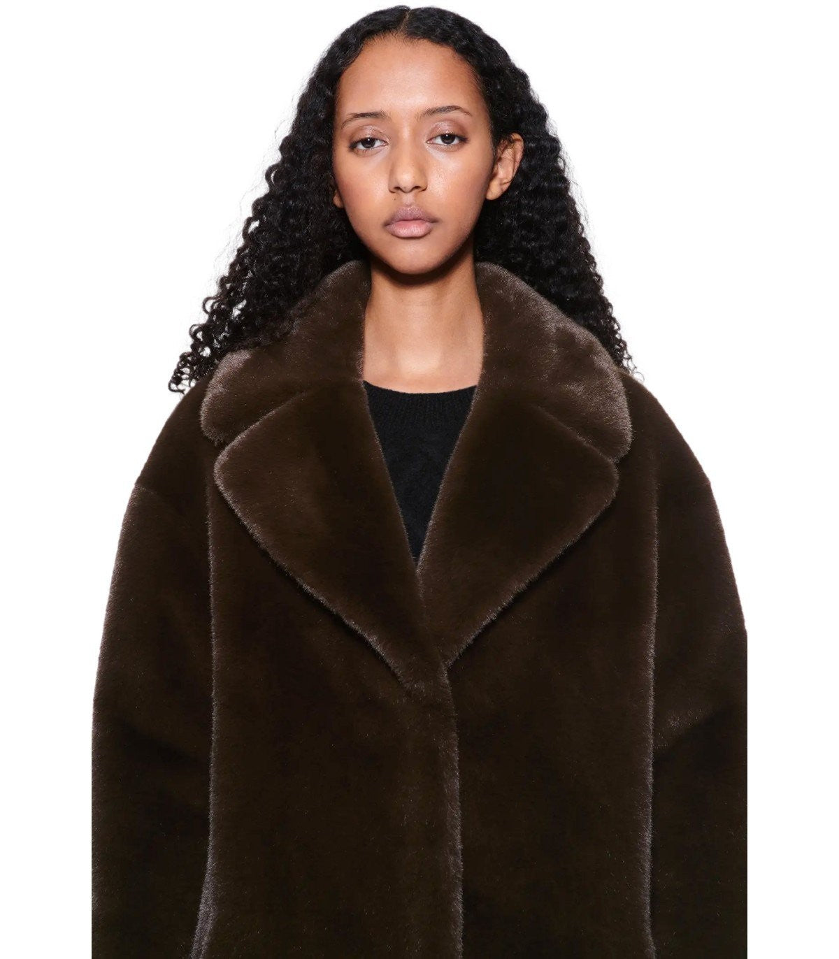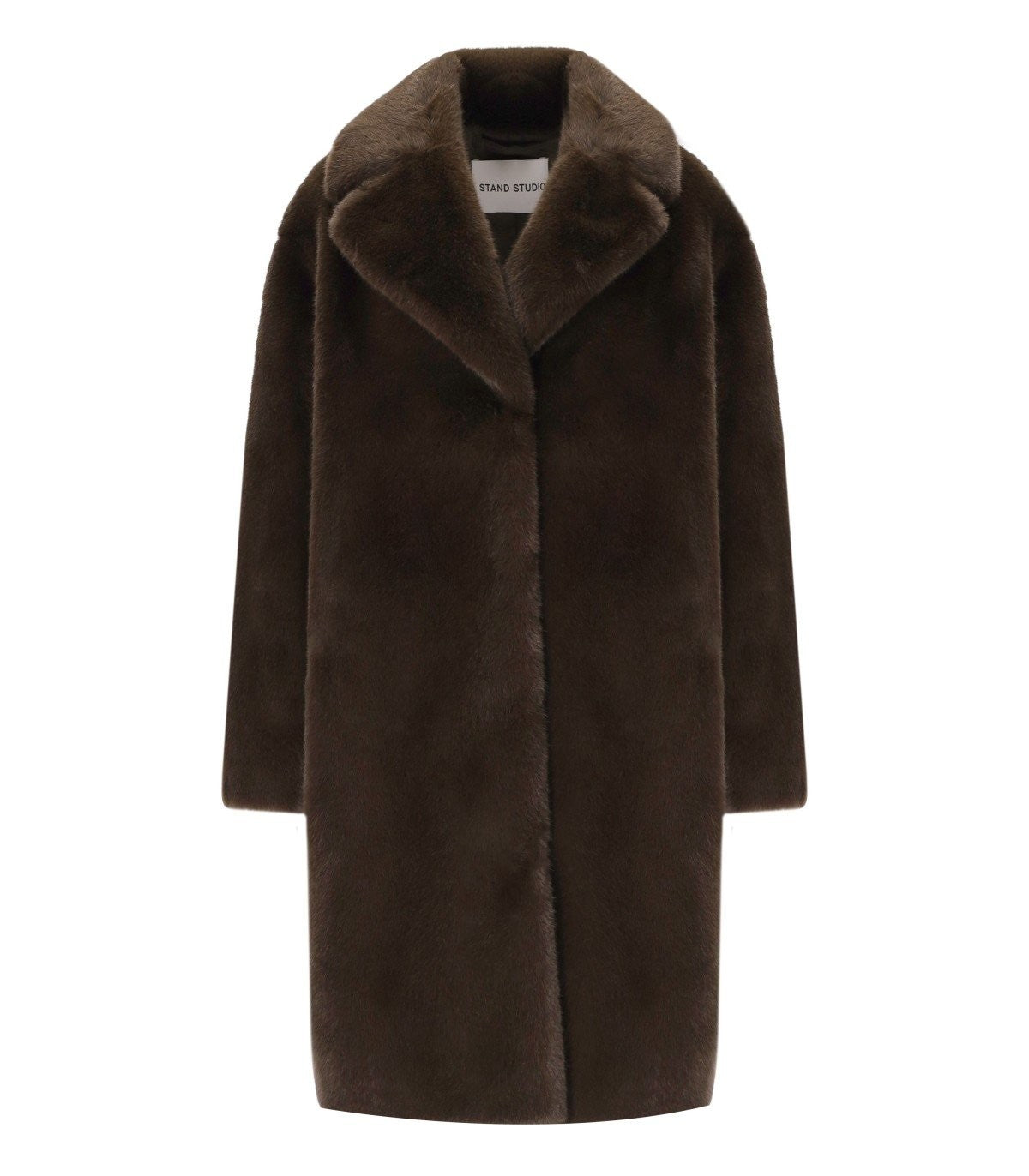 Camille Cocoon Coat von Stand Studio aus synthetischen Fell in brauner Farbe. Aus einer Kokon -Silhouette gekennzeichnet, verfügt es über die Schultern. Mit einem klassischen Kragen geschmückt, hat es einen Frontverschluss mit versteckten Schnappknöpfen. Seitenschlitztaschen. Innen gefüttert, hat es eine innengezündete Innentasche. Übergroße Passform. Dieser Artikel hat eine breite Passform. Wir empfehlen, eine Größe kleiner als üblich zu kaufen. Außenzusammensetzung: 100% Polyester. Auskleidung: 100% Polyester.
